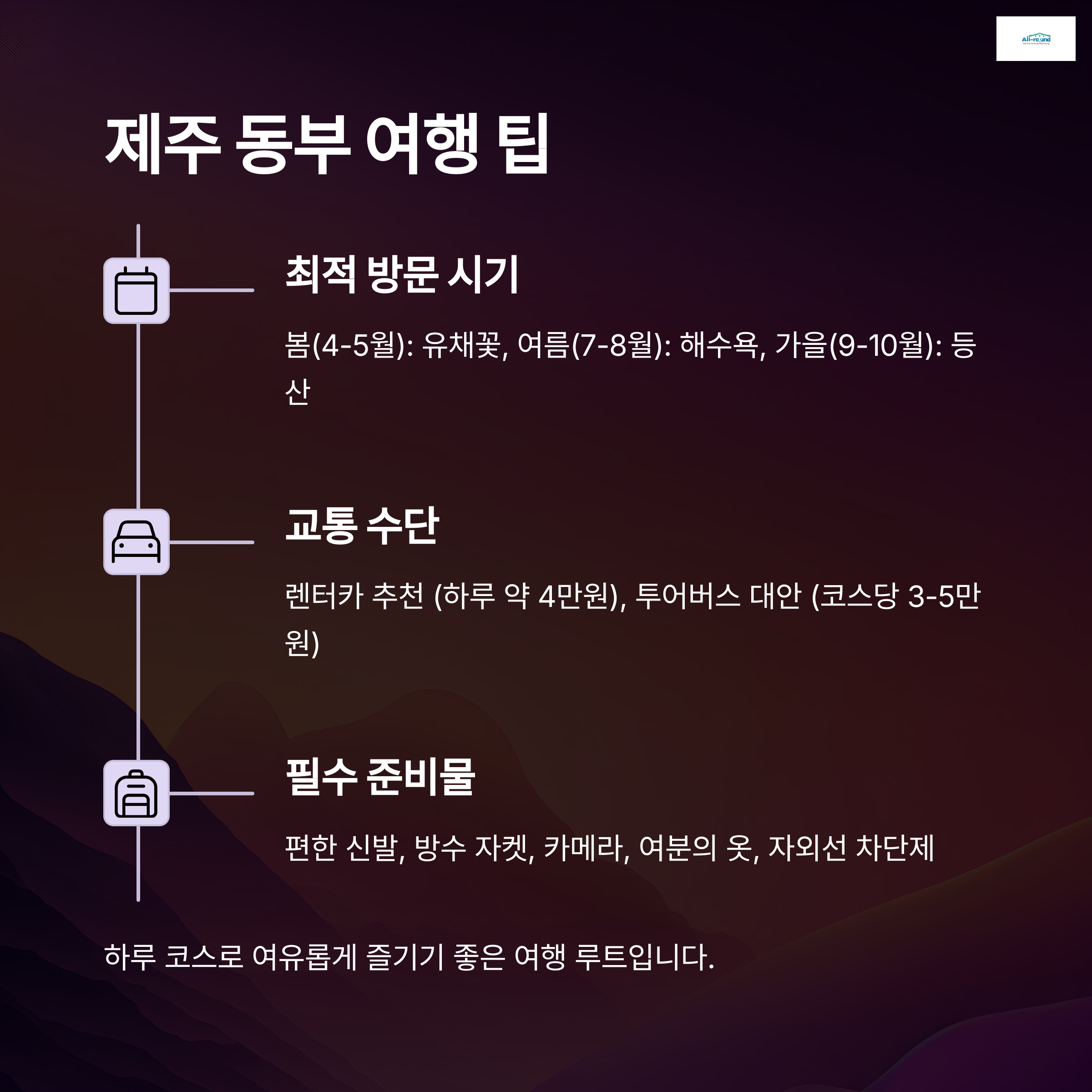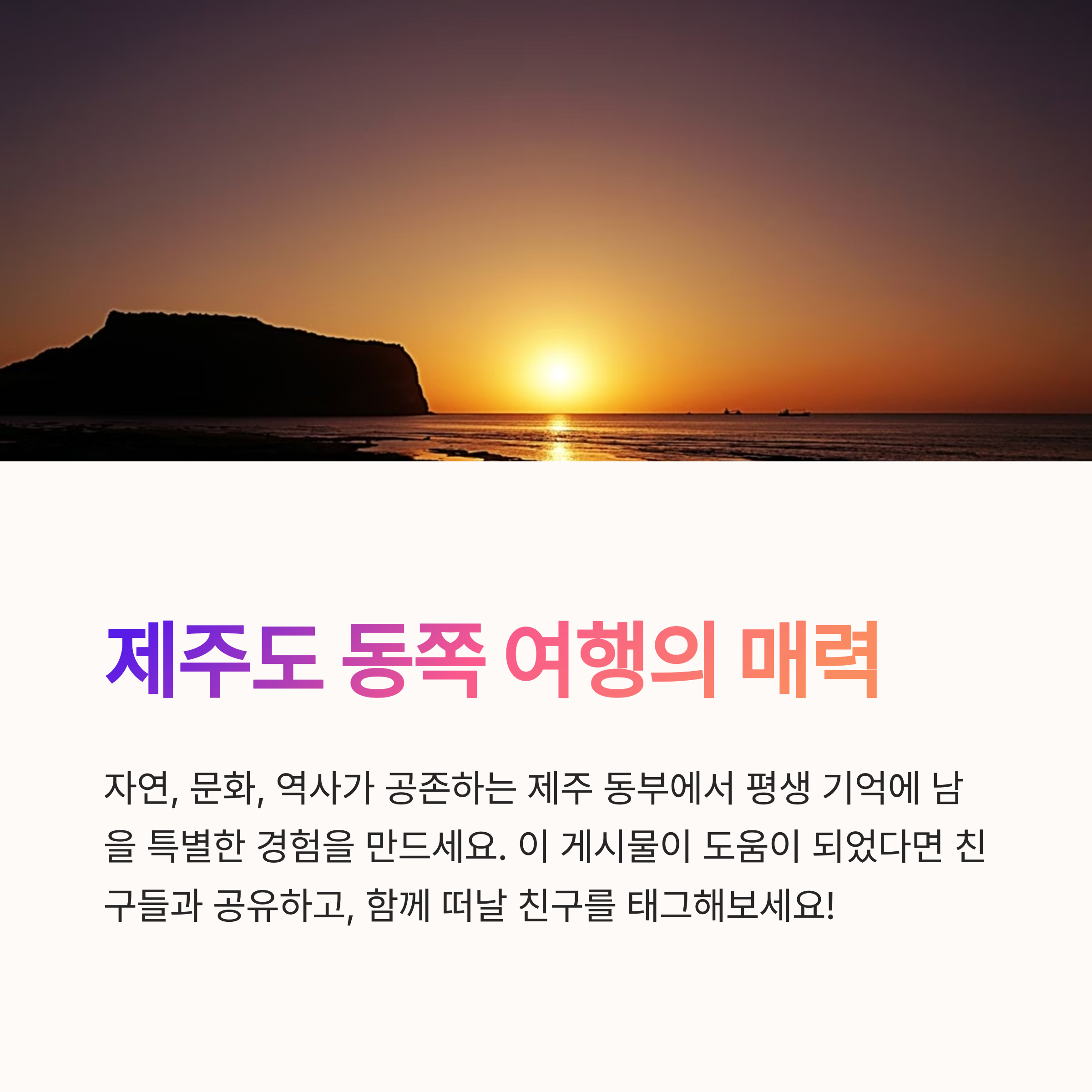 제주의 동쪽은 자연과 전통이 어우러진 깊이 있는 여행을 선사합니다. 바다, 화산, 전통문화, 지질학적 감동까지… 하루에 알차게 돌아볼 수 있는 루트로 구성되어 있어 여행 초보자도 쉽게 즐길 수 있습니다. 제주 여행을 계획 중이라면 이번 여행은 동쪽 루트로 떠나보는 건 어떨까요?