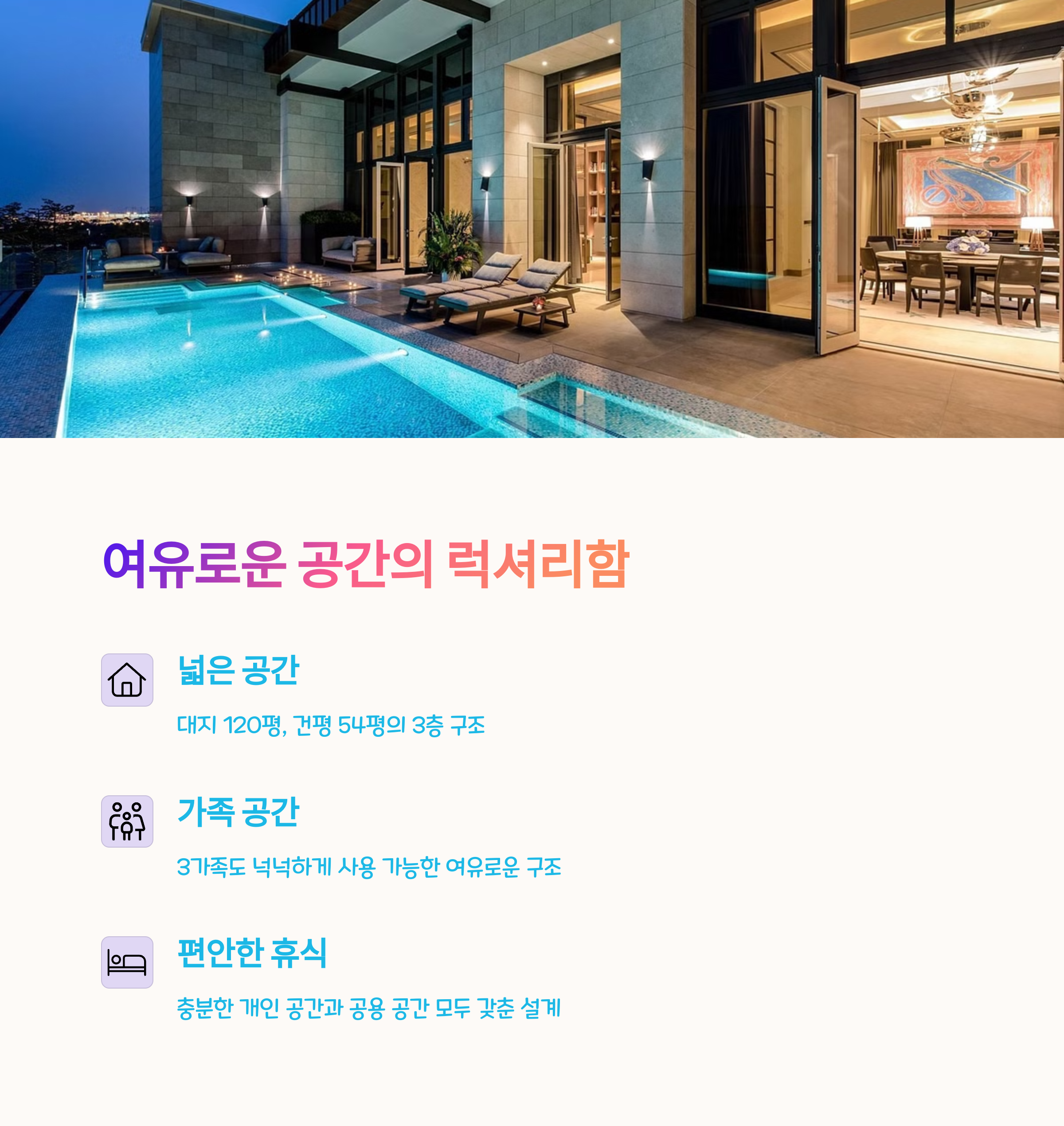 핵심 포인트 개별 수영장, 유럽풍 인테리어, 키즈 물품 완비, 방음 우수, 청결도 뛰어남