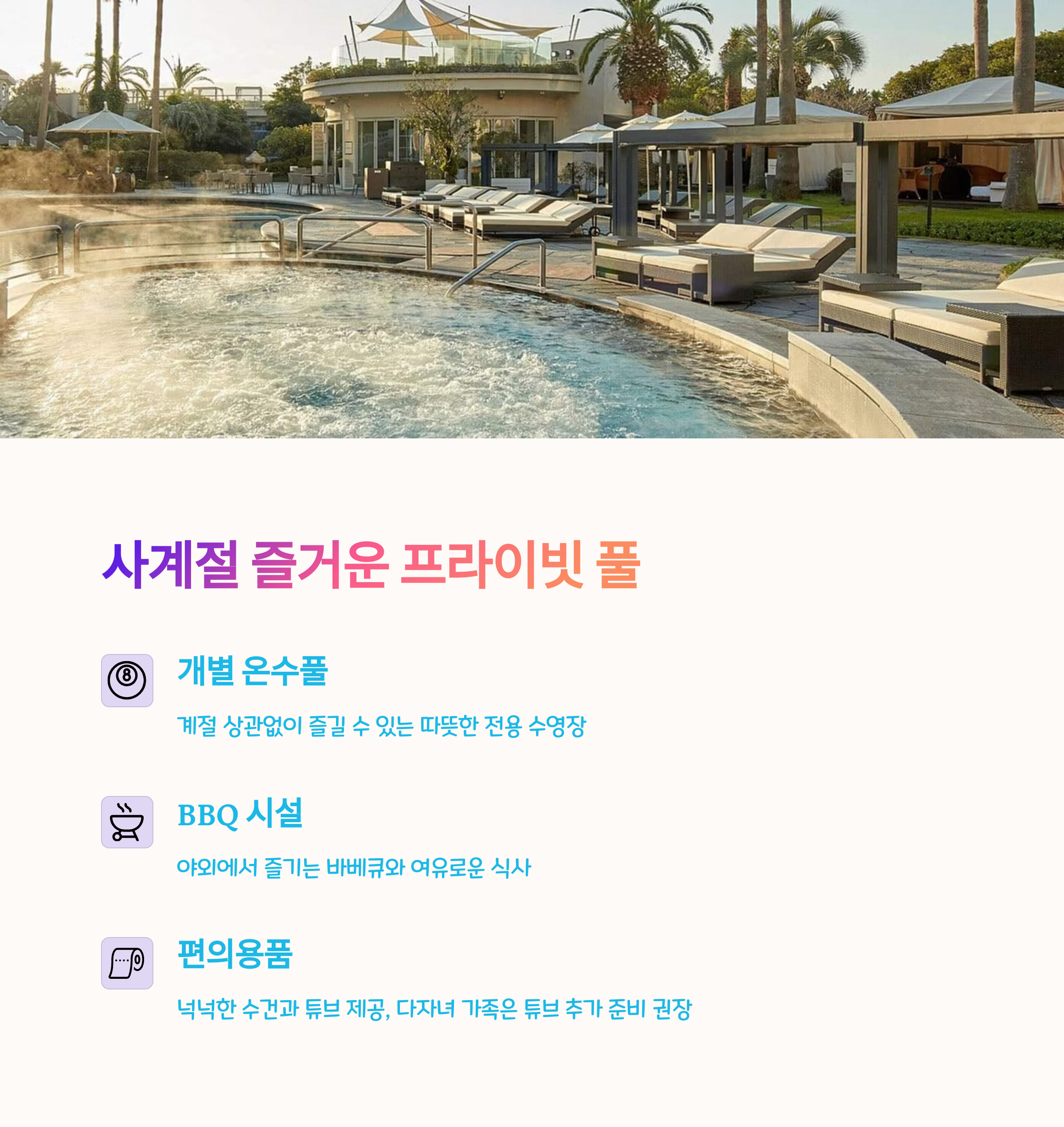 미온수 시스템이 적용되어 있으며, 사계절 사용은 가능하나 겨울철에는 다소 미지근하게 느껴질 수 있습니다. 유아 동반 시 추가 물놀이 용품을 챙기면 더 알차게 이용 가능합니다.