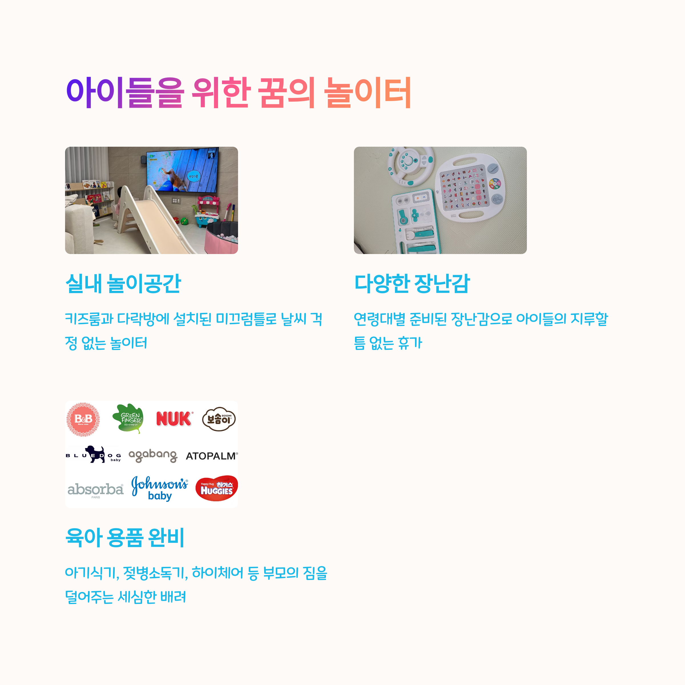 전체적으로 청결도와 편의성, 감성 분위기 모두 뛰어나 가족 단위, 키즈 동반 여행객들의 만족도가 매우 높은 숙소입니다.
