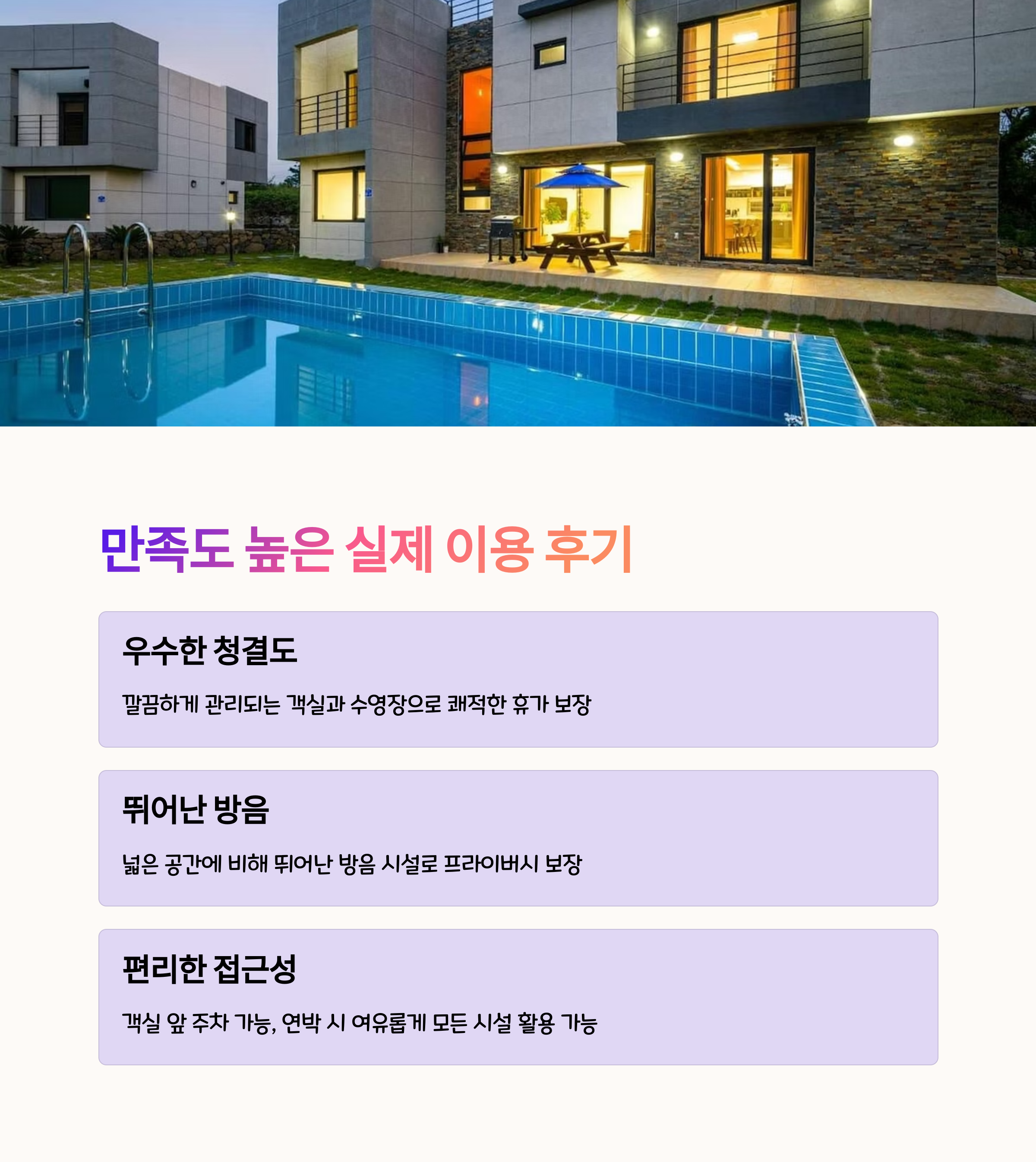| 핵심 포인트 | 개별 수영장, 유럽풍 인테리어, 키즈 물품 완비, 방음 우수, 청결도 뛰어남 |