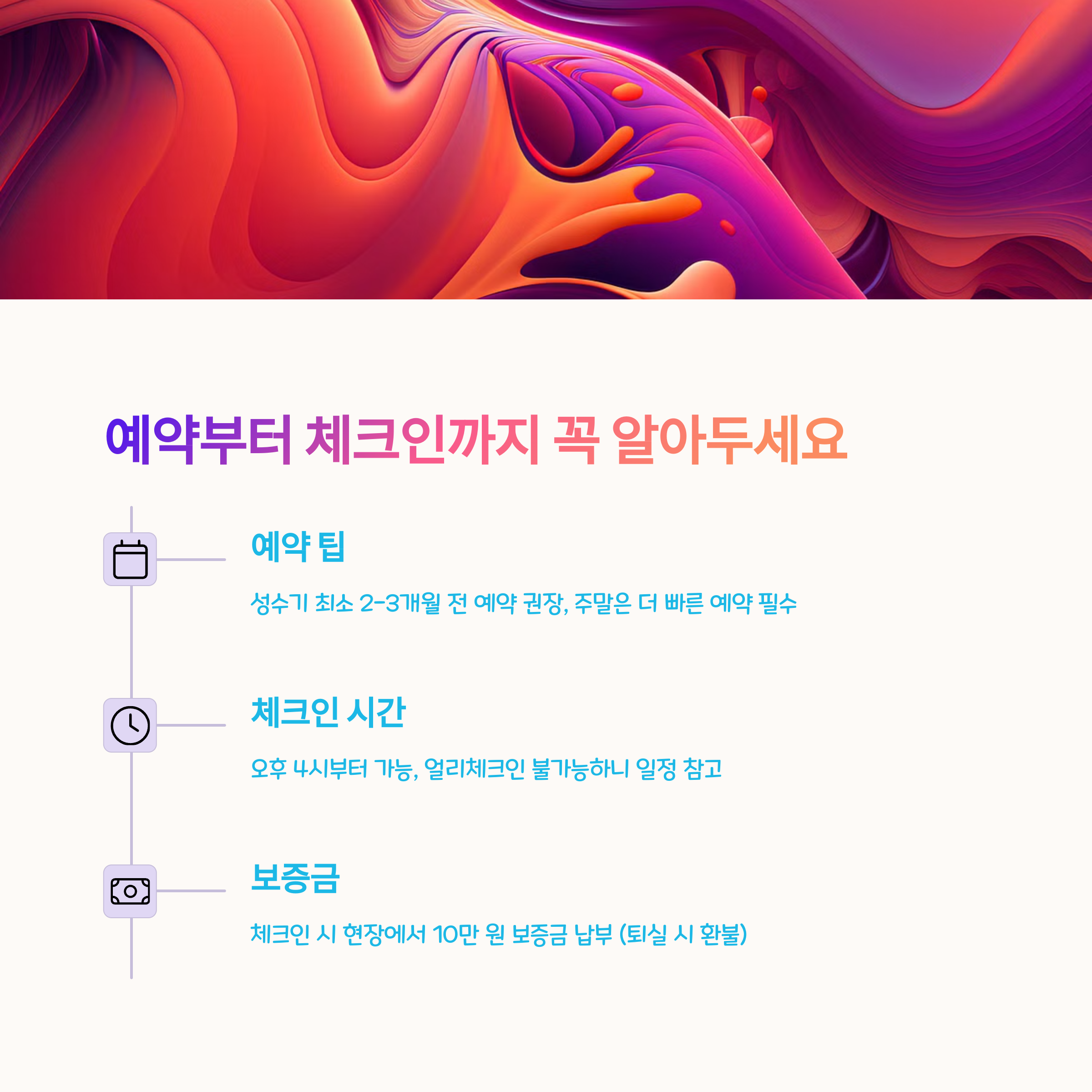 예약은 성수기 기준 최소 한 달 전에는 진행하는 것이 좋고, 체크인은 오후 4시부터얼리체크인 불가입니다. 보증금 10만 원은 체크인 시 별도 납부 후 퇴실 점검 후 환불되며, 주차는 객실 앞 바로 가능해 짐 옮기기도 매우 편리해요. 수건, 물컵, 조리기구, 튜브까지 기본 물품이 넉넉하게 비치되어 있어 여행 짐을 최소화할 수 있다는 점도 만족 포인트였습니다.