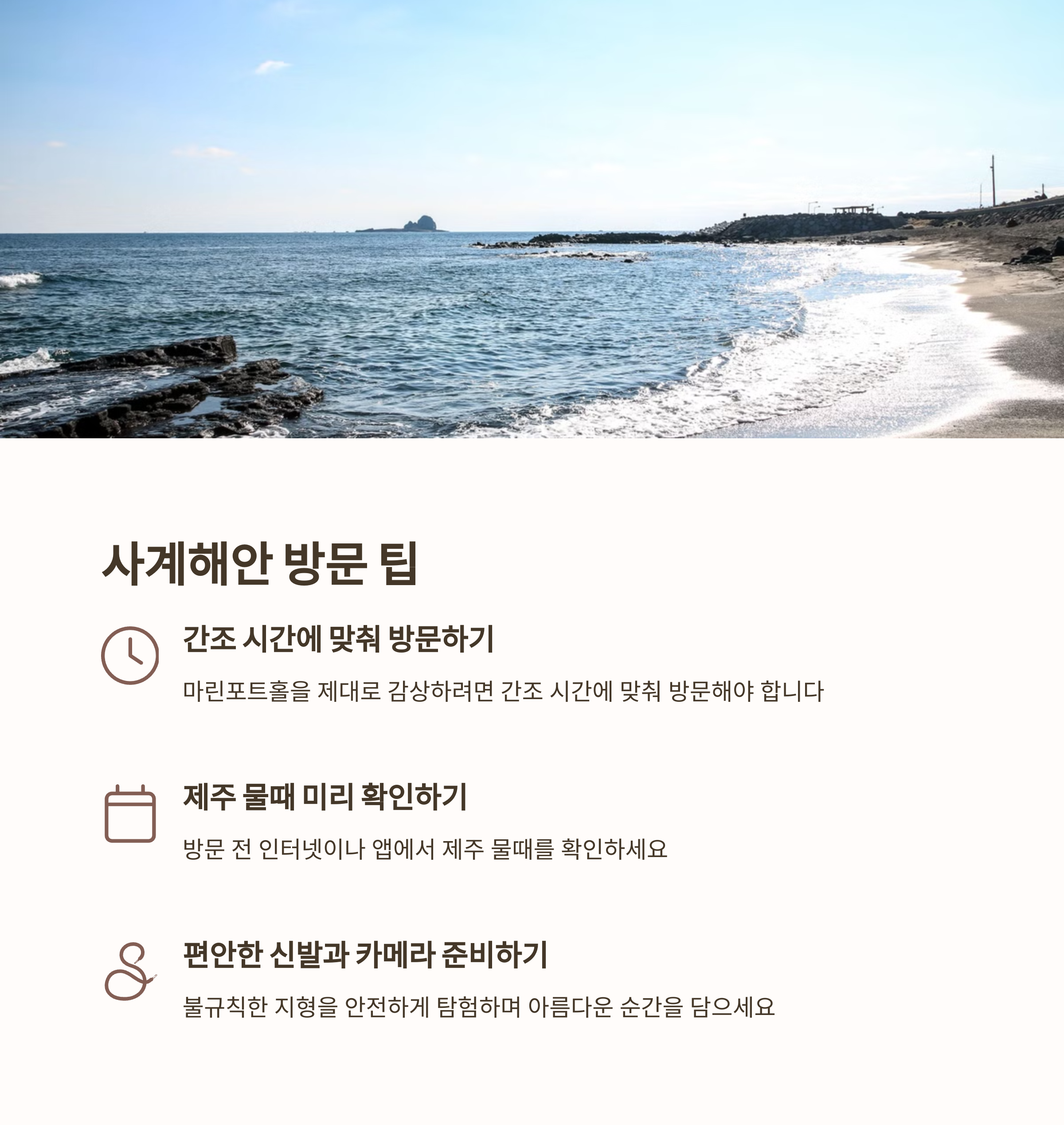 사계해안의 진정한 하이라이트는 마린포트홀입니다. 간조 시간에만 드러나는 이 신비로운 지형은 조수 간만의 차에 따라 그 모습을 드러내기 때문에, 반드시 물때를 확인하고 방문해야만 감상할 수 있는 숨겨진 명소입니다. 투명한 바닷물 아래 검은 현무암 지형이 원형으로 움푹 꺼진 듯한 형태를 하고 있어 자연이 만든 조각 예술처럼 느껴집니다. 바다 위에 떠 있는 듯한 풍경 속에서 색다른 제주를 경험하고 싶은 분들에게 추천할 만한 스팟입니다.
