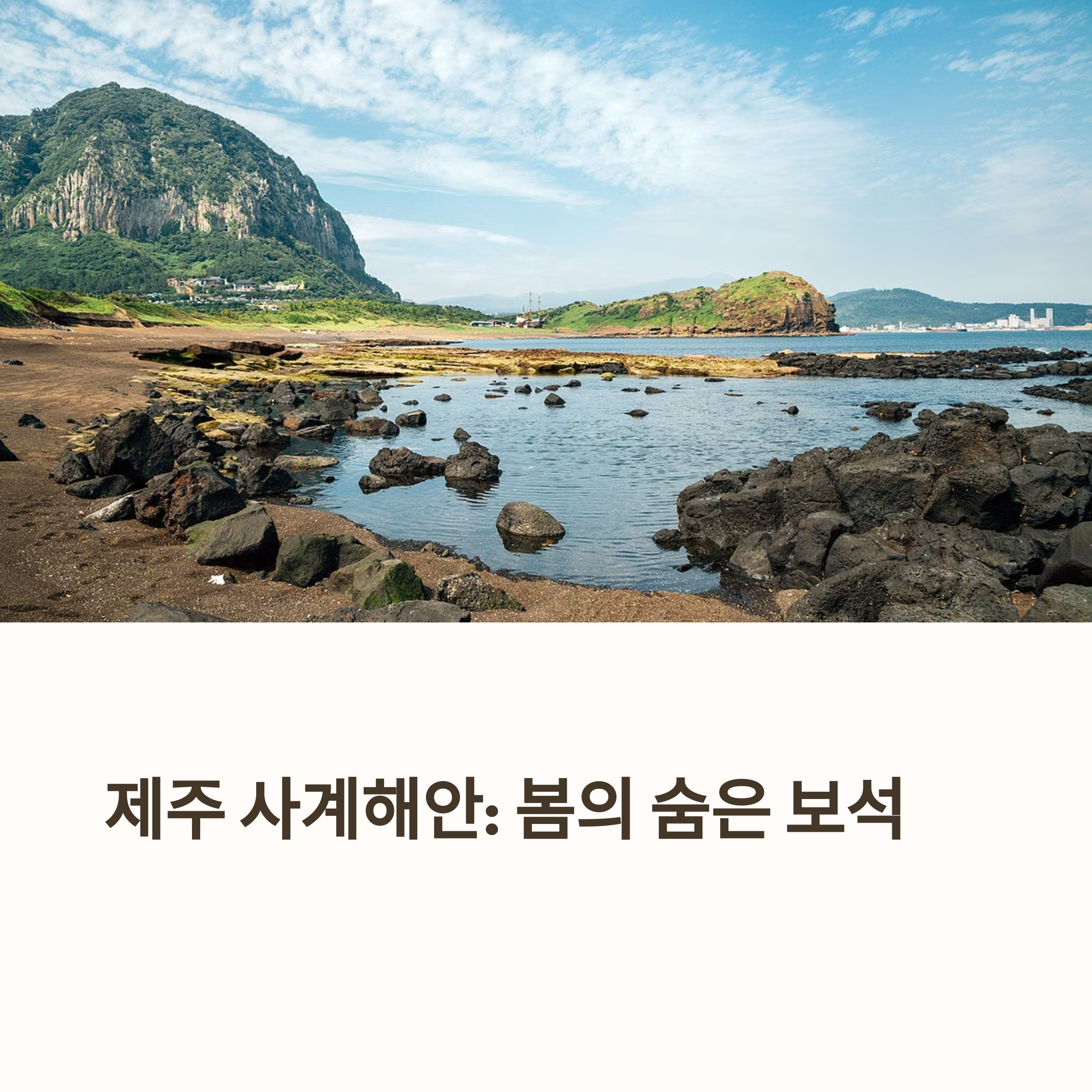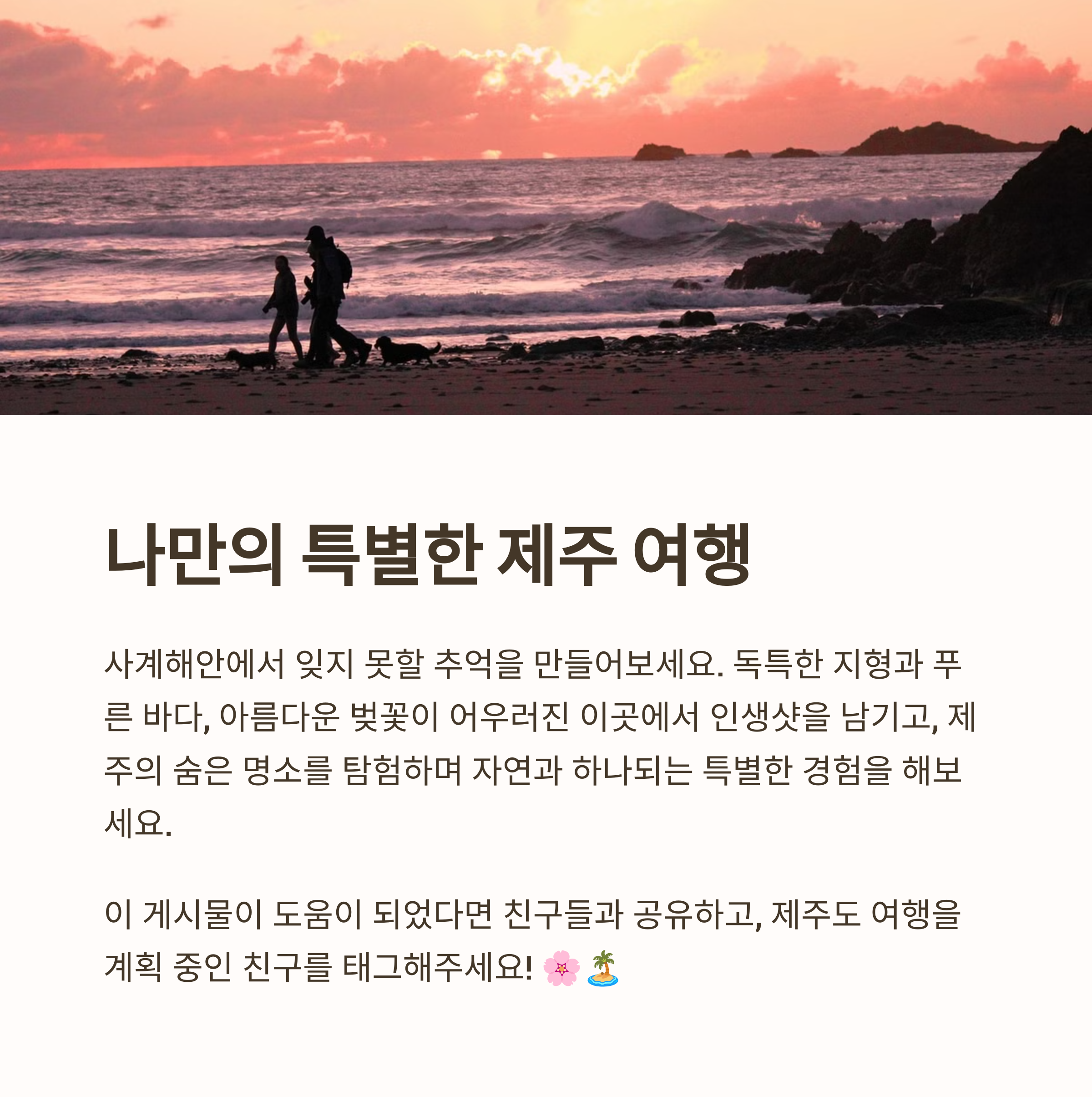 봄이 되면 제주도는 벚꽃과 유채꽃이 어우러져 어디를 가든 화사한 풍경을 감상할 수 있습니다. 특히 서귀포 지역은 다른 지역보다 따뜻한 기후 덕분에 벚꽃이 일찍 피는 특징이 있어 3월 말부터 이미 봄기운이 완연합니다. 오늘 소개할 서귀포 사계해안은 벚꽃보다는 바다와 지형의 독특함으로 더욱 주목받는 장소입니다. 올레길 10코스에 속한 이 해안길은 마치 외국의 바닷가를 연상케 하는 이국적인 분위기와 간조 시간에만 드러나는 마린포트홀이 특별한 매력을 더합니다. 벚꽃 시즌에 제주를 찾는다면 꽃길만 걷는 여행도 좋지만, 사계해안처럼 다른 자연의 얼굴을 담고 있는 공간도 함께 들러보시길 추천드립니다.