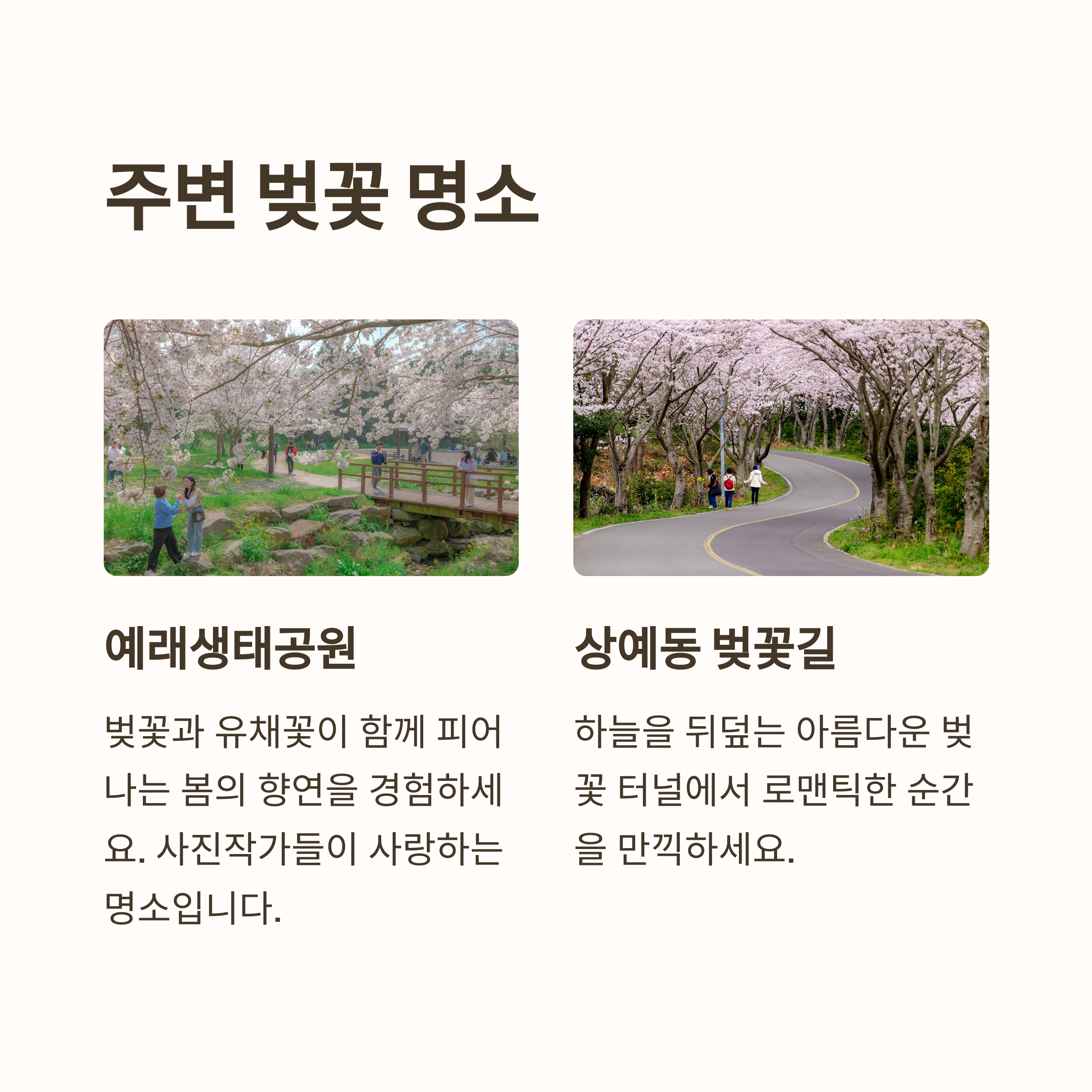 제주에서 벚꽃을 감상할 수 있는 시기는 3월 말부터 4월 초까지로, 사계해안 인근의 예래생태공원은 대표적인 벚꽃 명소입니다. 하지만 사계해안은 벚꽃 외에도 유채꽃과 독특한 해안 절경 덕분에 벚꽃 시즌 이후인 4월 중순에도 여전히 방문할 가치가 높습니다. 꽃이 피고 지는 자연의 흐름을 따라 바닷가를 산책하며 제주의 계절감을 오롯이 느껴보세요.