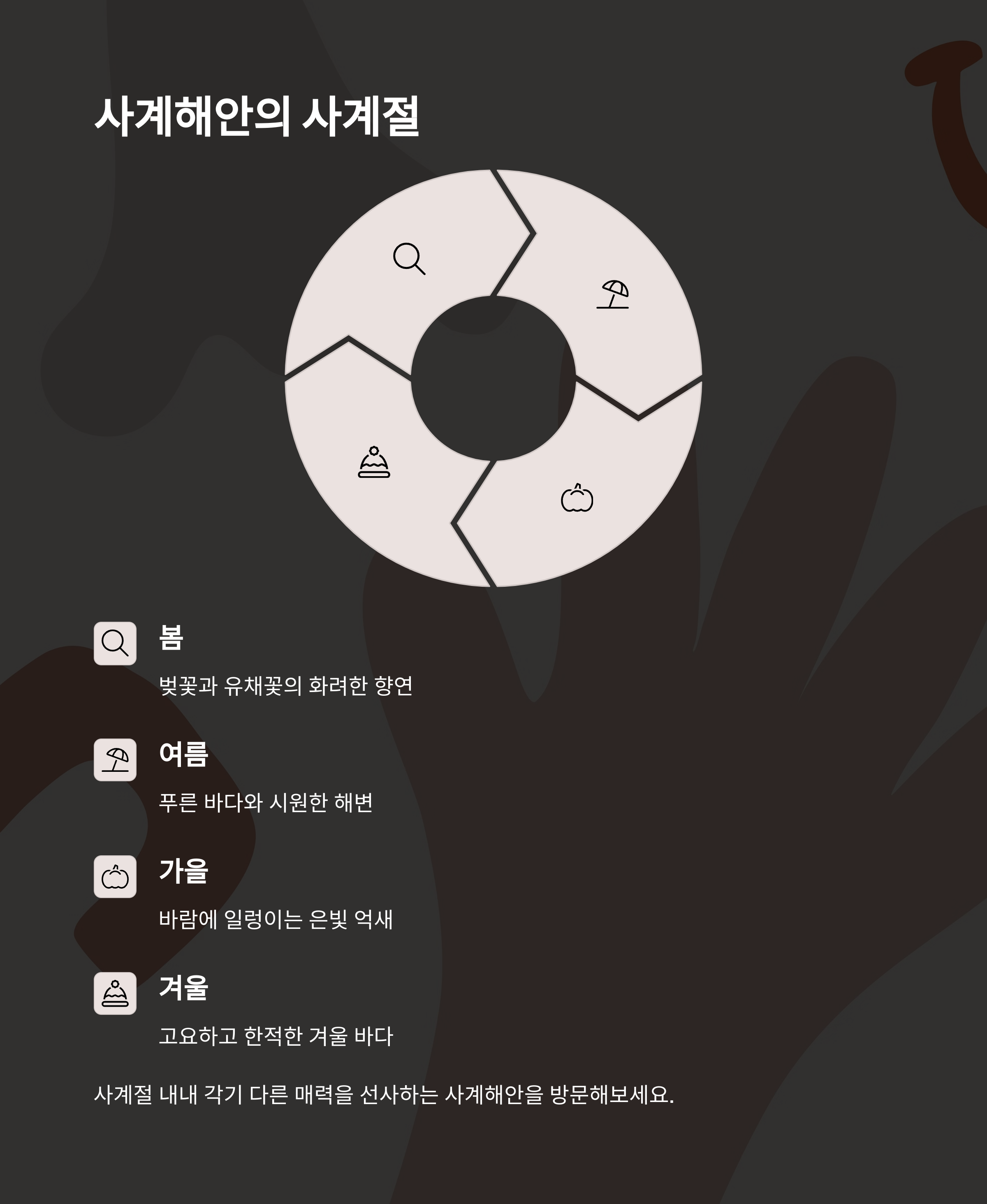 | 이국적인 바다 풍경과 조용한 힐링 장소 | SNS에서 인기 있는 포토존 명소 | 따뜻한 기후로 벚꽃 개화가 빠른 지역 |