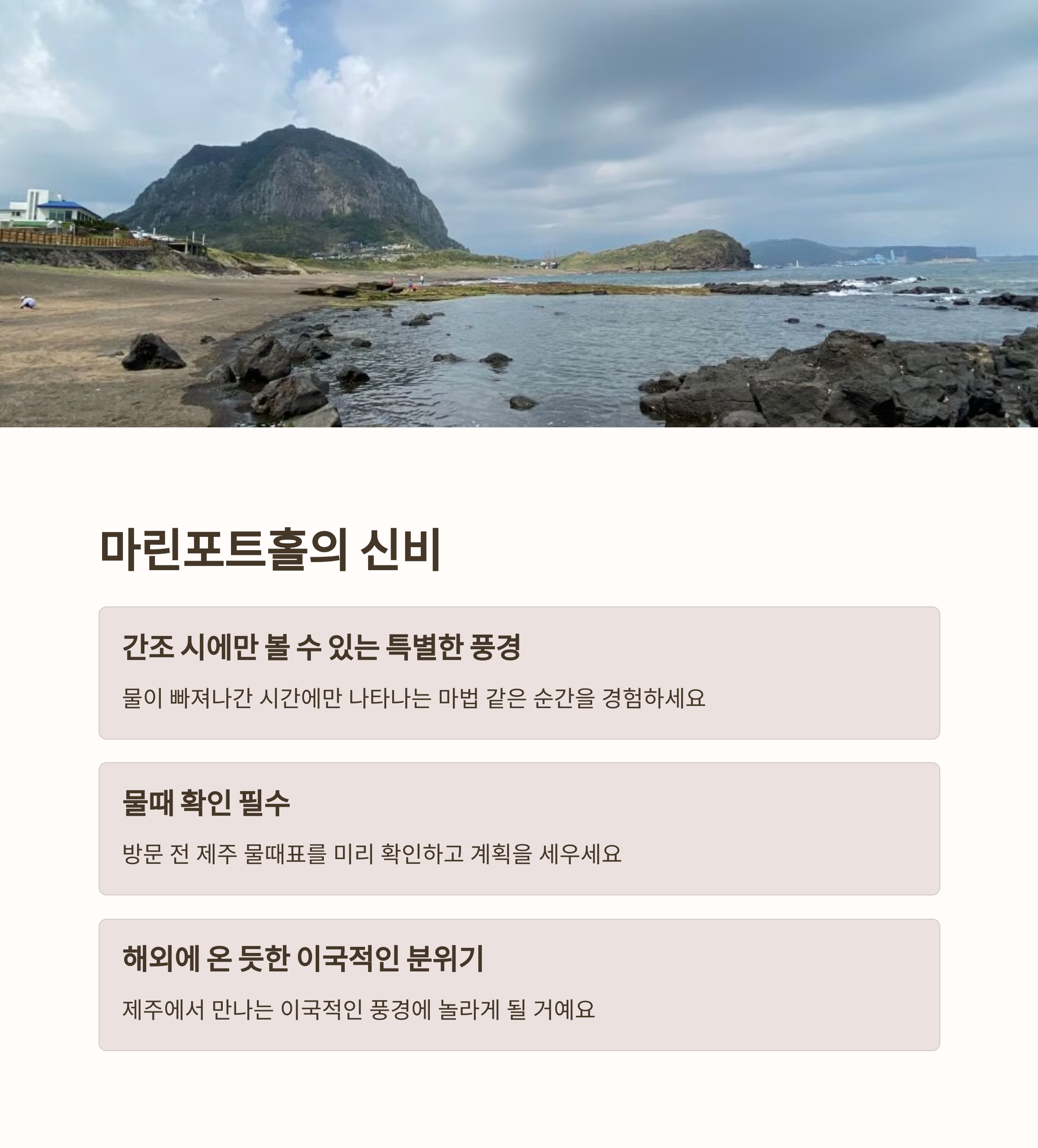 | 특징 | 바닷길, 마린포트홀, 이국적인 포토존, 간조 시 감상 가능 |