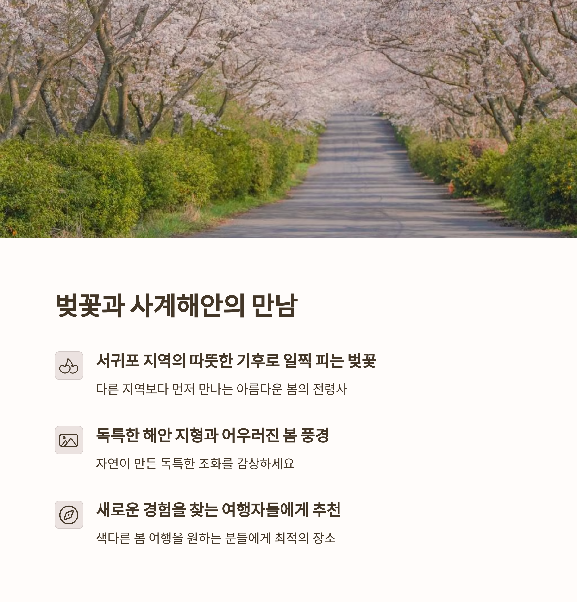 | 이국적인 바다 풍경과 조용한 힐링 장소 | SNS에서 인기 있는 포토존 명소 | 따뜻한 기후로 벚꽃 개화가 빠른 지역 |