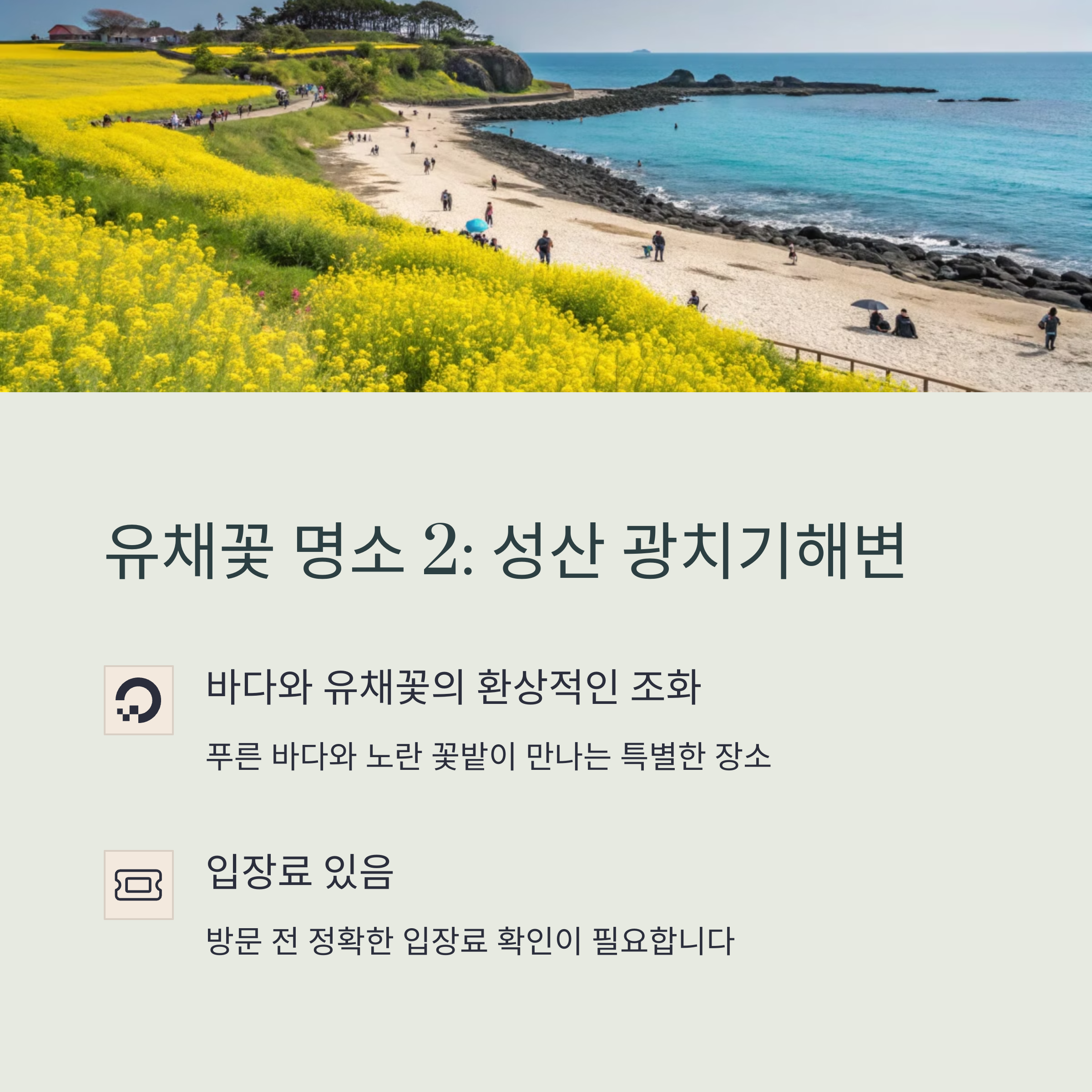 **유채꽃 명소 추천!** 1. **성산 섭지코지**: 유채꽃과 해돋이 명소로 유명 2. **성산 광치기해변**: 바다와 유채꽃이 어우러진 곳 3. **우도**: 검멀레 해변 주변, 4월까지 감상 가능 유채꽃은 어디서 보느냐에 따라 느낌이 다릅니다. 성산 일출봉 근처에서는 새벽 해돋이와 함께 감상할 수 있고, 광치기해변에서는 푸른 바다와 노란 유채꽃이 멋진 대비를 이루어 사진 명소로도 인기 있습니다.