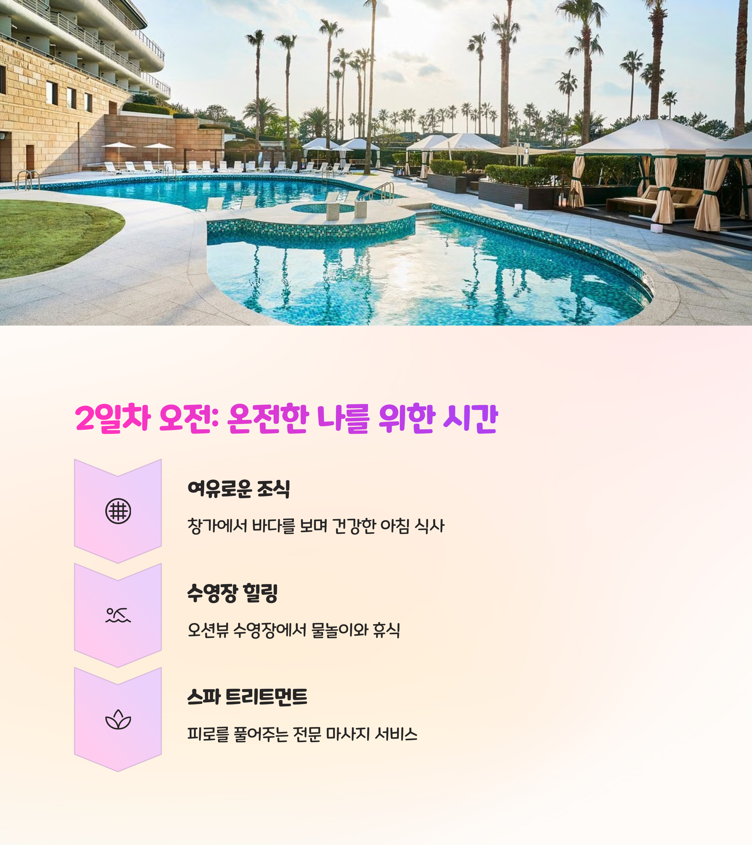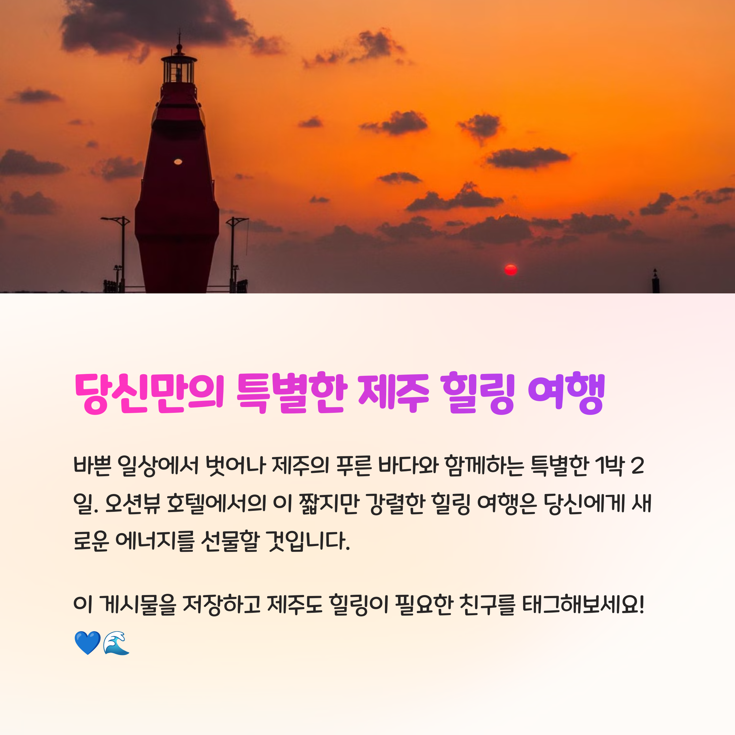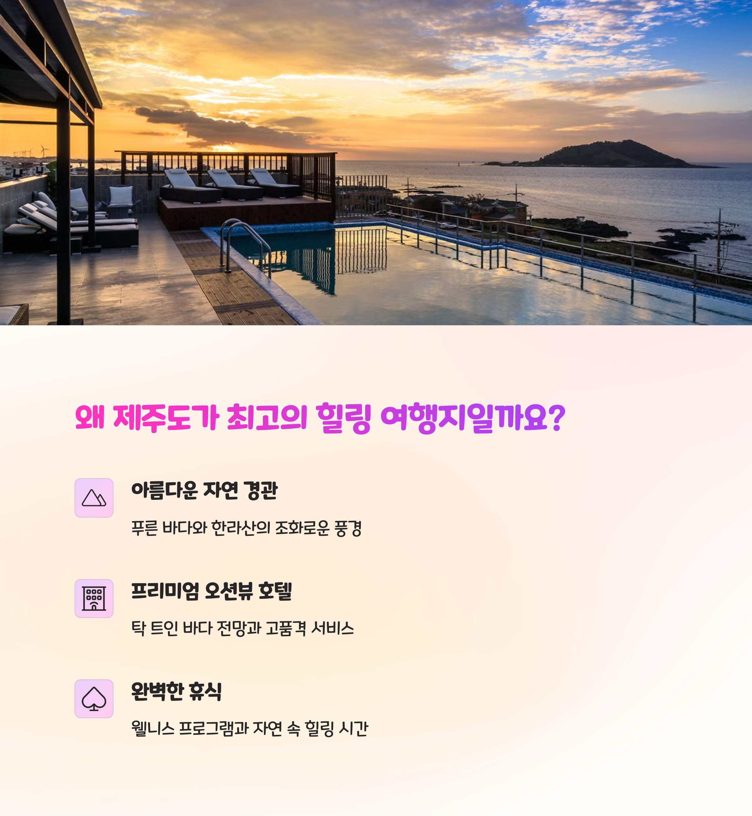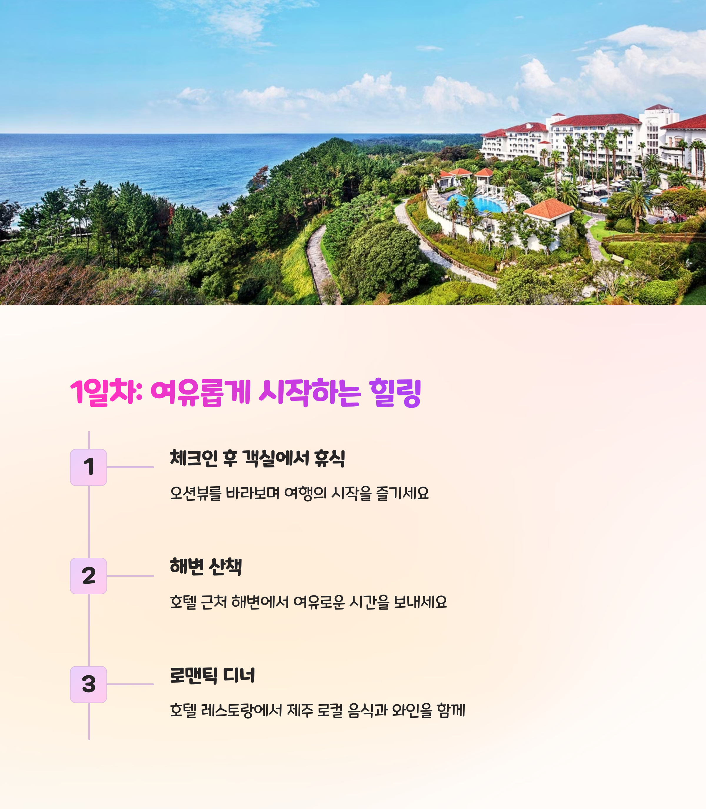 제주도는 잠시 바쁜 일상에서 벗어나고 싶을 때, 가장 먼저 떠오르는 힐링 여행지입니다. 특히 숙소에서 머무는 시간마저 여행의 일부가 되는 제주에서는 뷰 좋은 호텔 하나만으로도 만족스러운 1박 2일을 보낼 수 있어요. 이번 글에서는 오션뷰·자연뷰를 자랑하는 제주 호텔 3곳과 체크인부터 체크아웃까지의 간단한 힐링 코스를 소개해 드릴게요. 바다를 바라보며 커피 한 잔, 숲속에서의 아침 산책, 따뜻한 수영장과 함께하는 여유로운 시간까지! 제주에서 진짜 쉼을 경험하고 싶은 분들께 꼭 추천드리는 코스입니다.