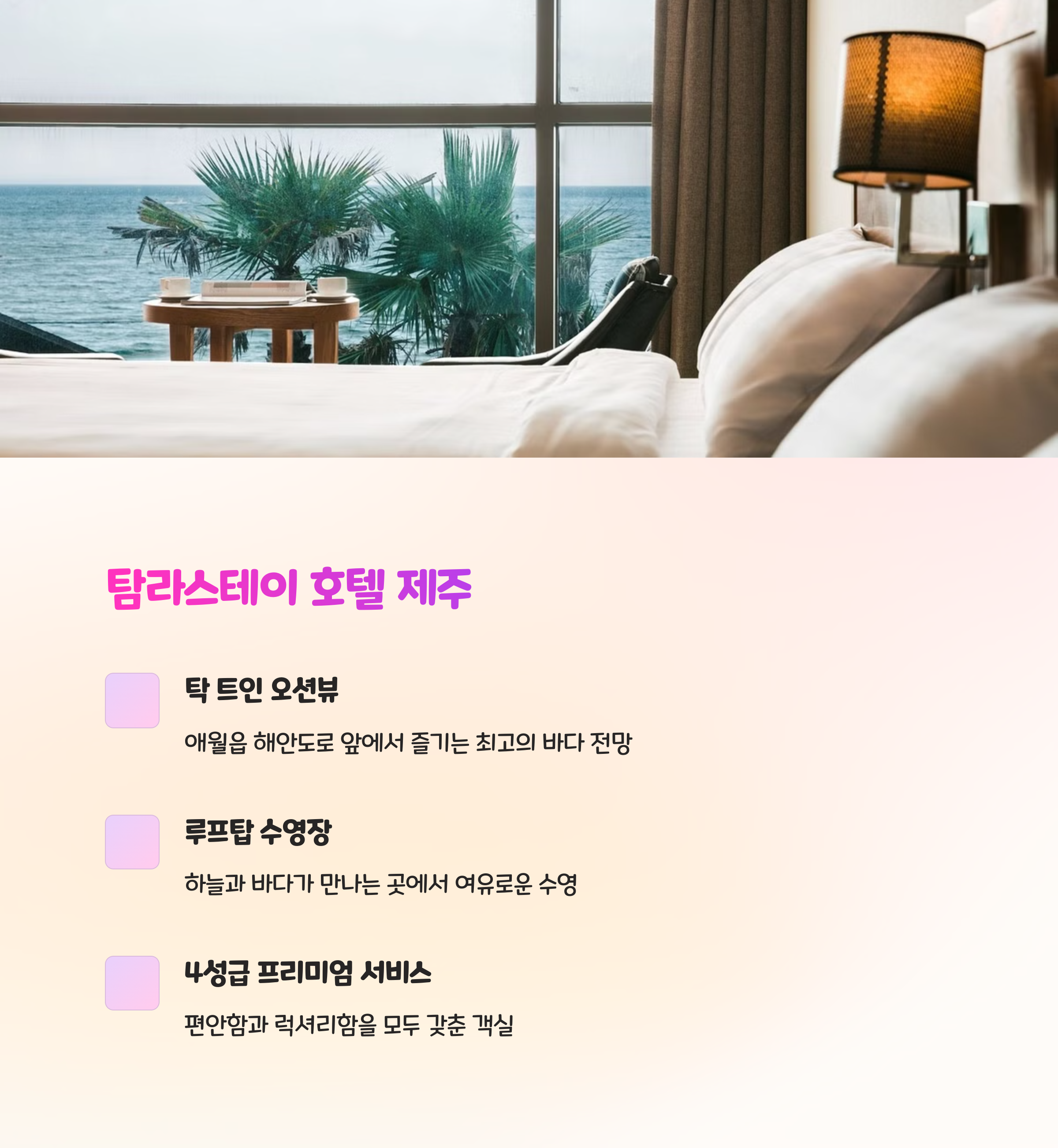 | 오션뷰 힐링 호텔 | 탐라스테이, 다인 오세아노처럼 탁 트인 바다 전망이 매력적인 곳 |