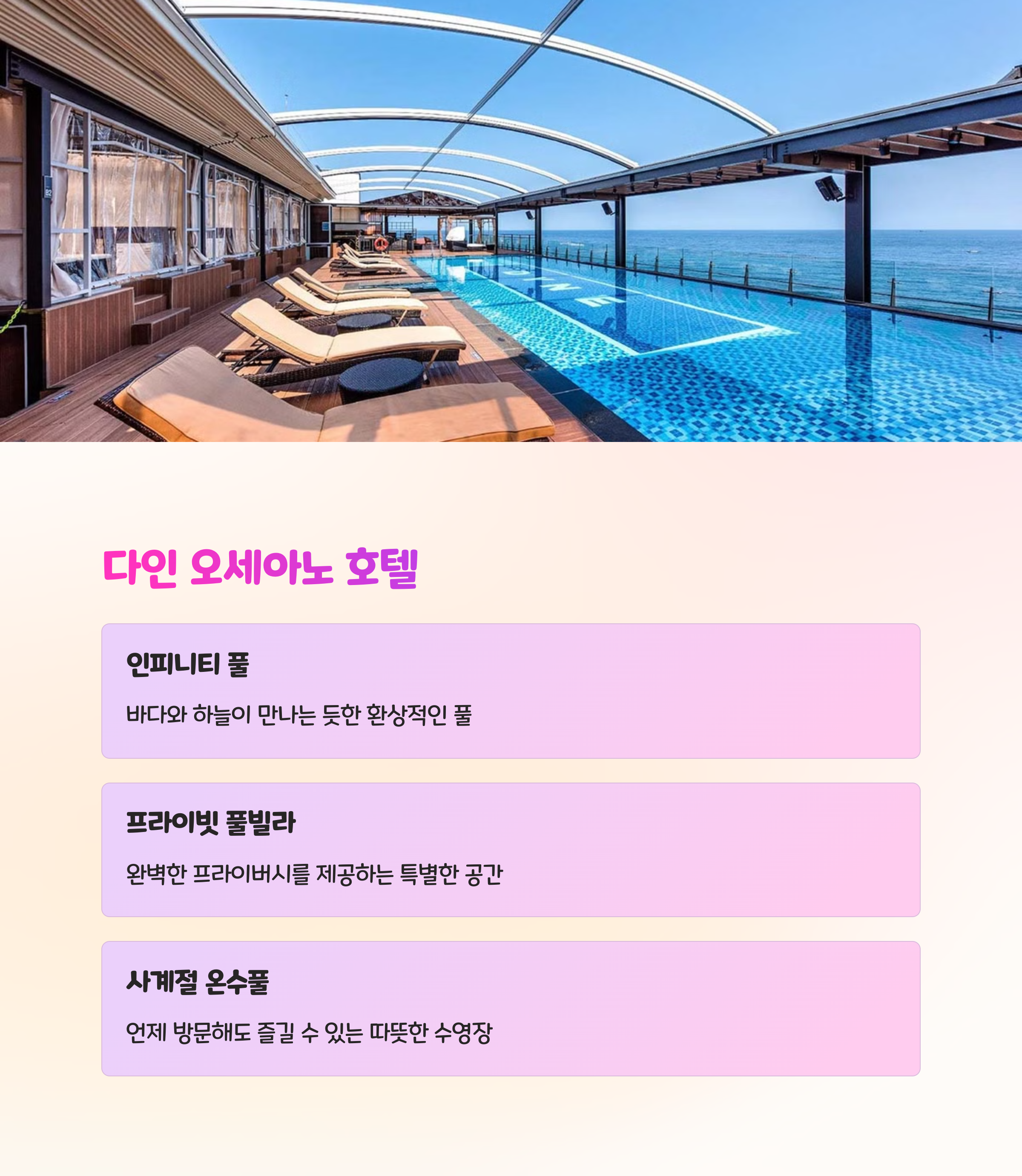 두 번째 호텔은 프라이빗한 분위기를 원한다면 딱 좋은 다인 오세아노 호텔입니다. 인피니티 풀에서 제주 바다를 바라보며 사계절 내내 온수로 즐기는 수영이 가능하고, 가족 단위나 연인끼리 프라이빗하게 머물 수 있는 풀빌라 타입 객실도 준비되어 있어요. 특히 애월 바다의 잔잔한 파도 소리와 함께 조용히 휴식을 취할 수 있는 곳으로, 힐링 그 자체를 원할 때 제격입니다.