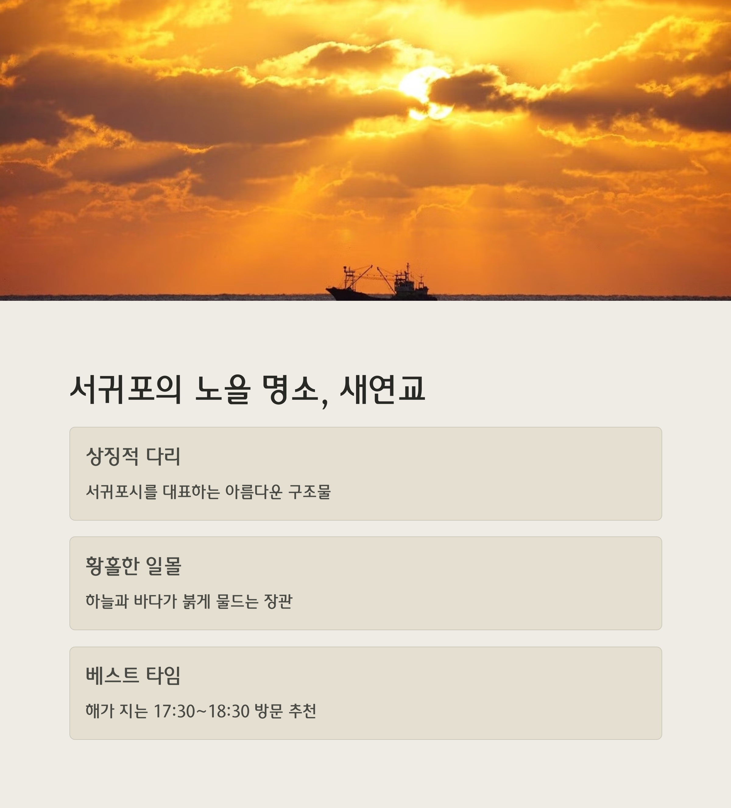 두 번째 추천지는 서귀포시의 랜드마크인 새연교입니다. 석양이 물드는 시간, 이 다리 위에서 바라보는 바다는 마치 한 폭의 그림과도 같은 장면을 연출합니다. 노을을 배경으로 사진을 찍으면 누구나 인생샷을 남길 수 있는 명소이며, 주변에 위치한 항구와 산책길도 함께 둘러보기 좋습니다. 서귀포 감성의 정수를 느끼고 싶다면 해 질 무렵의 새연교를 꼭 방문해 보세요.