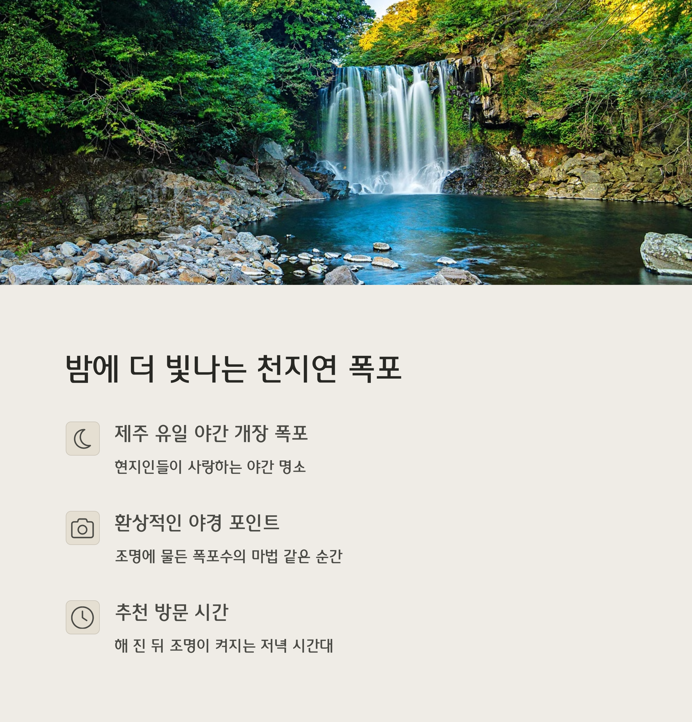 | 서귀포 야경 명소 | 천지연폭포는 야간에도 감상이 가능한 대표 명소입니다. |
