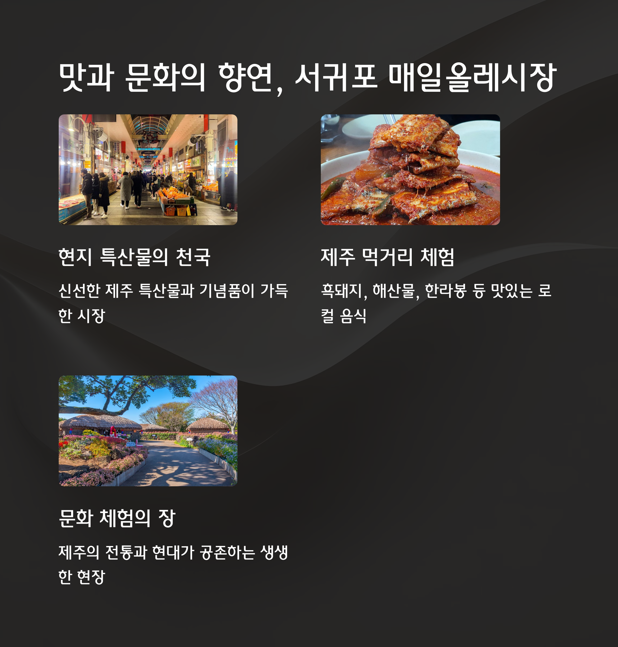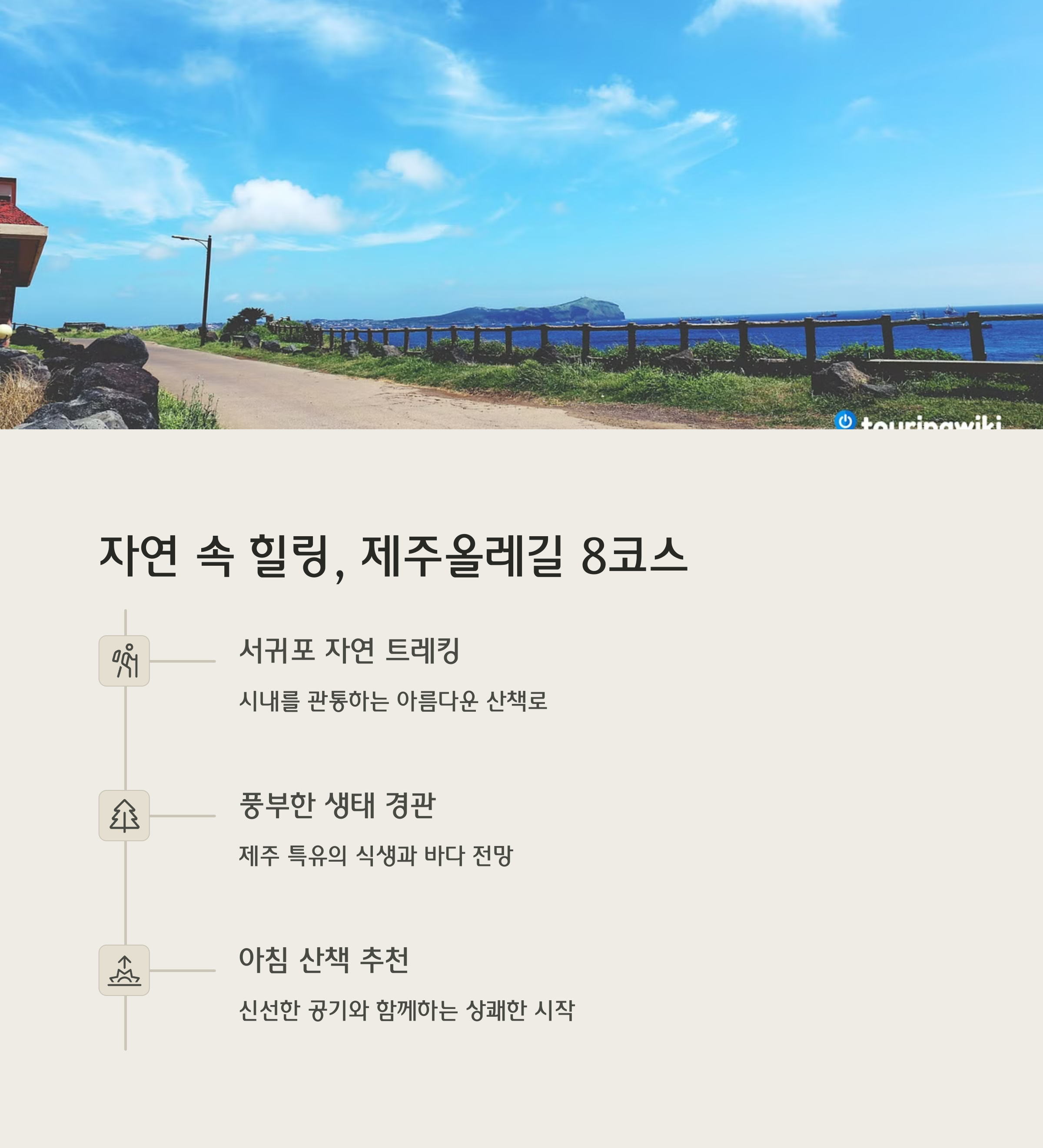 낮 시간에는 카멜리아 힐과 제주올레길 8코스를 추천드립니다. 카멜리아 힐은 동백나무와 다양한 꽃들로 꾸며진 정원으로, 어디에서 찍어도 인스타 감성의 사진이 나오는 포토 스팟입니다. 제주올레길 8코스는 서귀포의 바다, 숲, 마을을 따라 걷는 자연 밀착형 트레킹 코스로, 계절마다 다른 매력을 느낄 수 있습니다. 특히 맑은 날엔 걷기만 해도 힐링이 되는 코스로 많은 여행자들에게 사랑받고 있습니다.