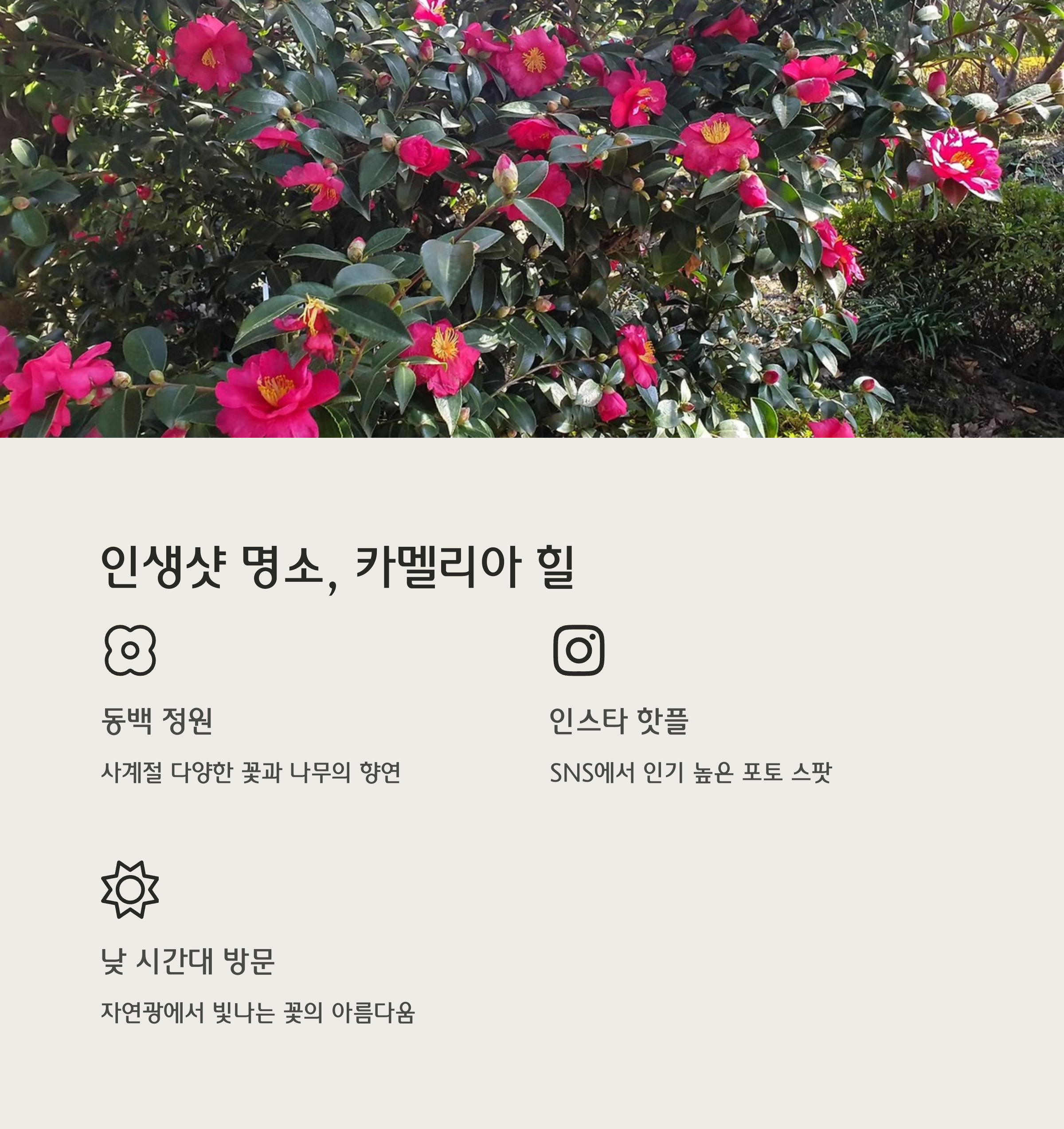 | 인생샷 명소 | 카멜리아 힐은 다양한 꽃과 포토존으로 유명합니다. |