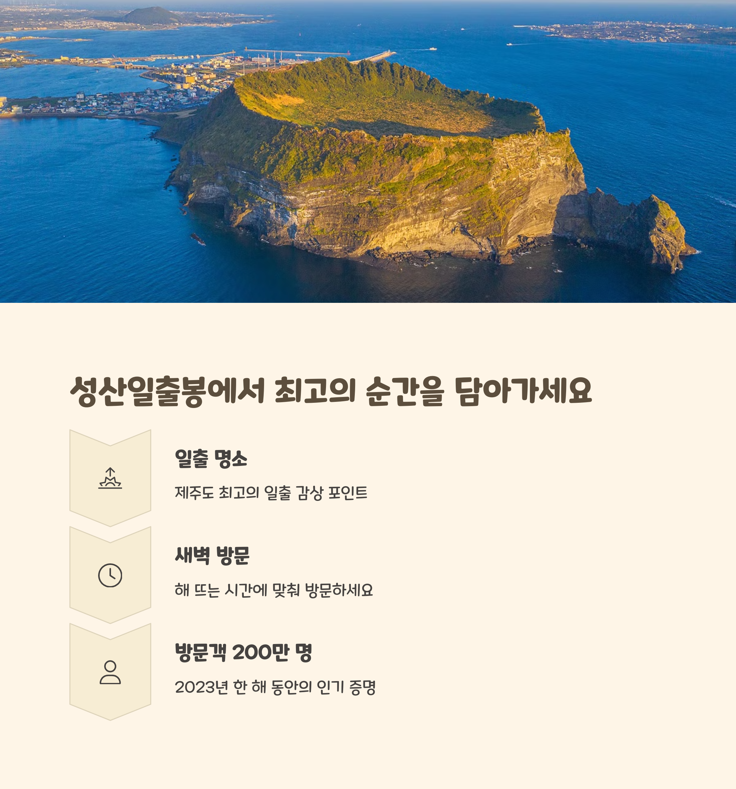| 일출 명소 | 성산일출봉은 제주 최고의 일출 감상 장소입니다. |