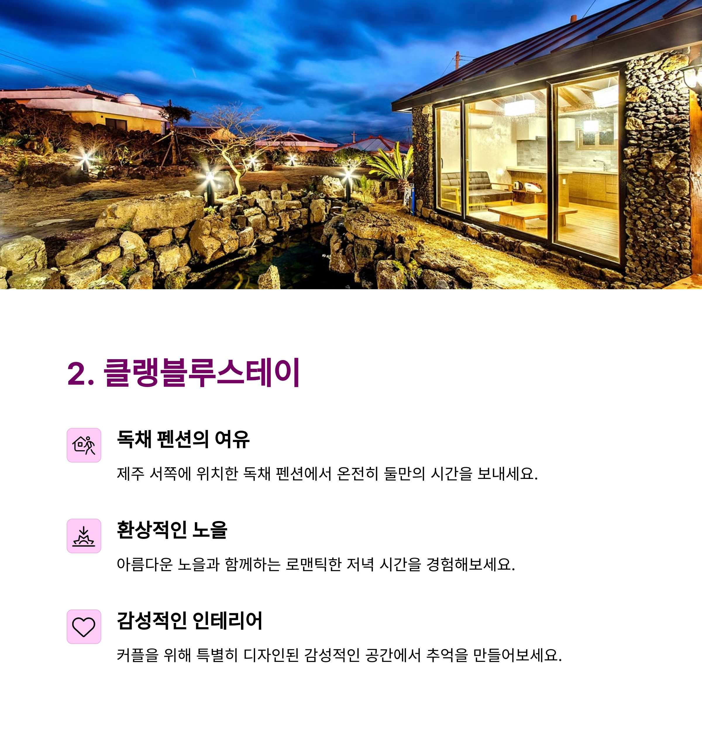 숙소는 위치와 분위기를 고려해 선택하세요. 바다 전망, 독채 여부, 리뷰 등을 비교하면 만족도 높은 감성 숙소를 고를 수 있습니다.