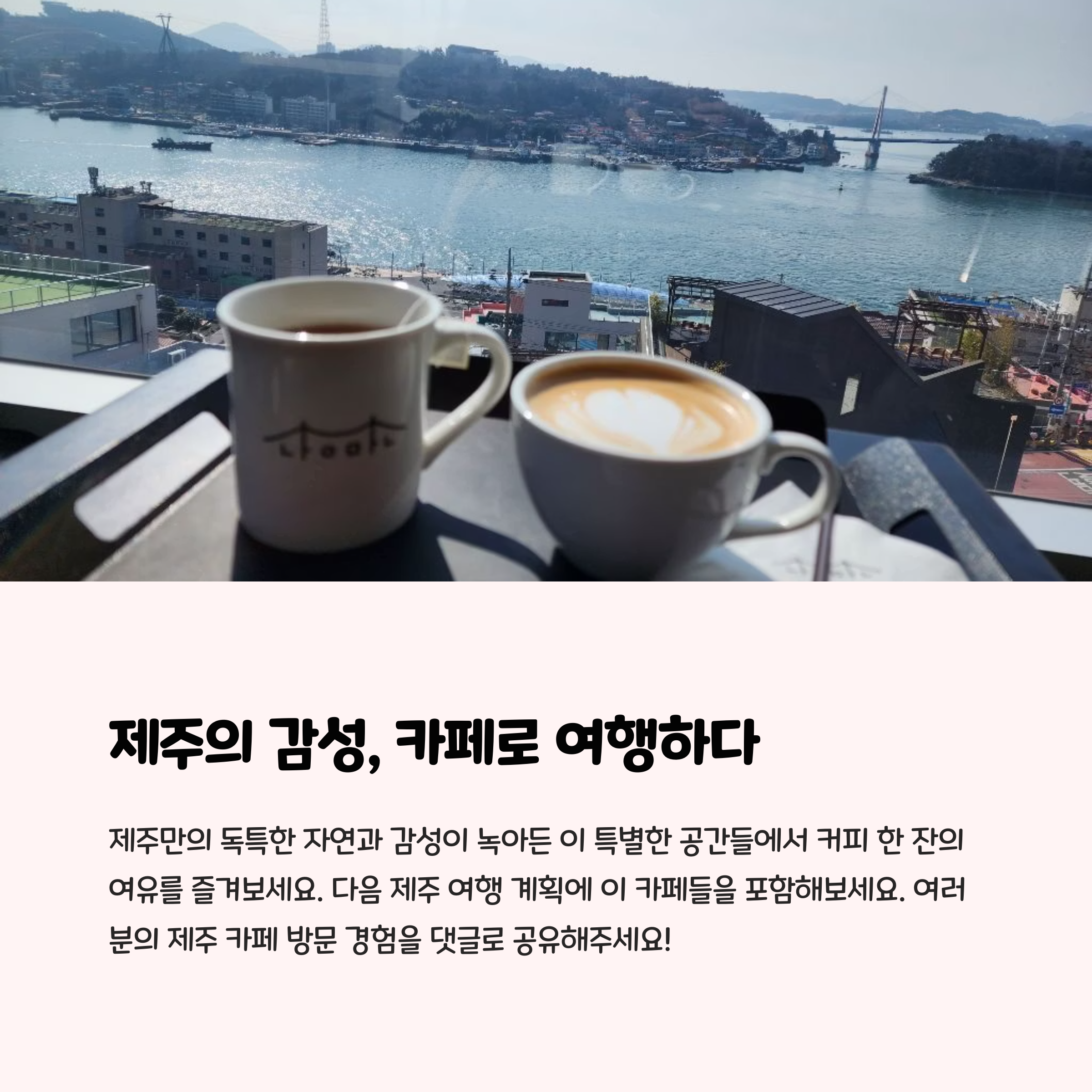 바다, 정원, 노을, 감성… 제주 감성 카페는 단순한 ‘카페’ 그 이상입니다. 이번 여행에서는 카페 한 곳에서 진짜 제주의 분위기를 느껴보세요. 여러분의 여행 일정에 따뜻한 휴식과 포토 타임을 더해줄 장소, 이 리스트로 충분히 준비되셨습니다.