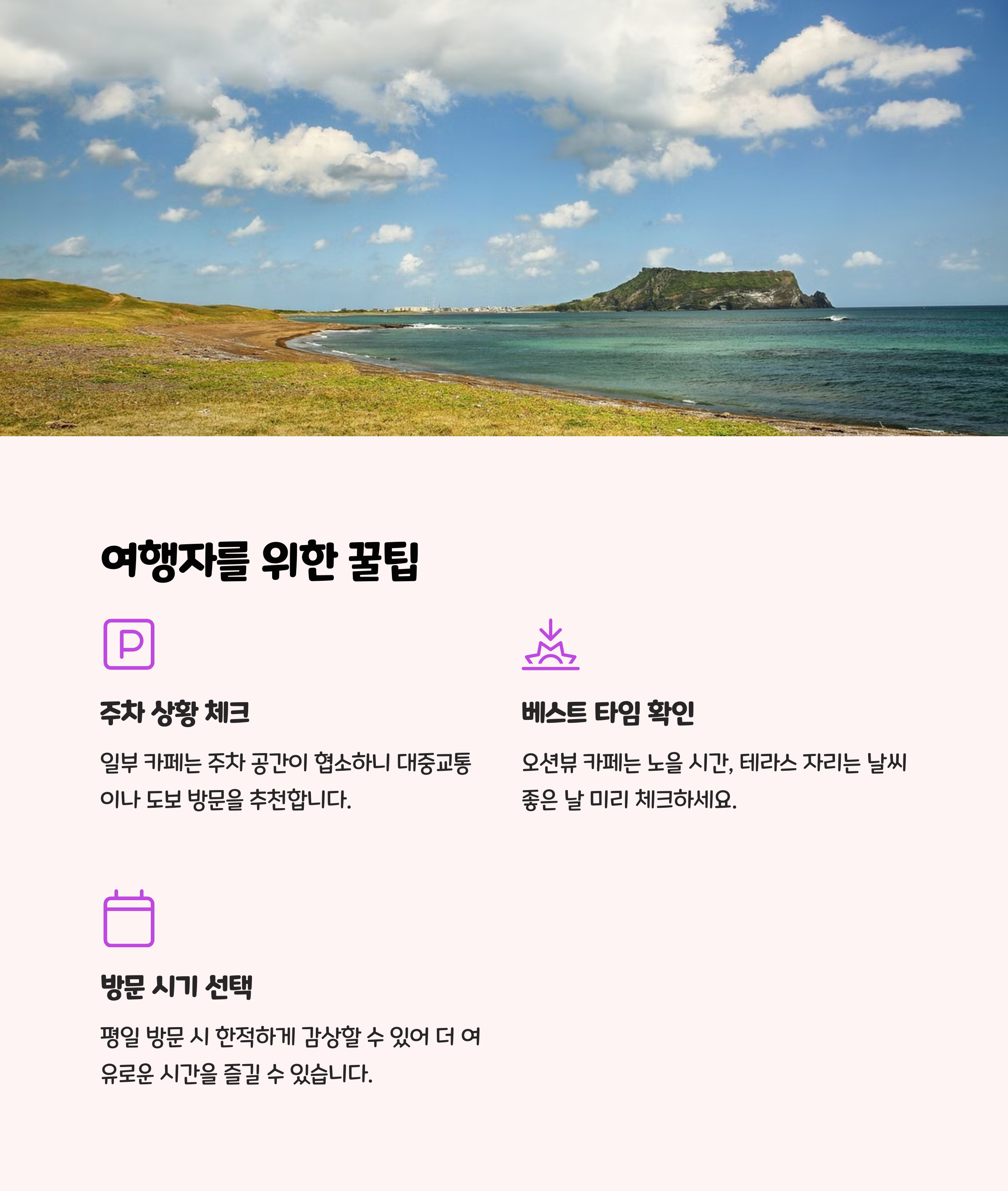 | 제주 서쪽·동쪽 핫플 집중 | 커플·친구·가족 모두 추천 | 카페투어 추천 루트 완성 |