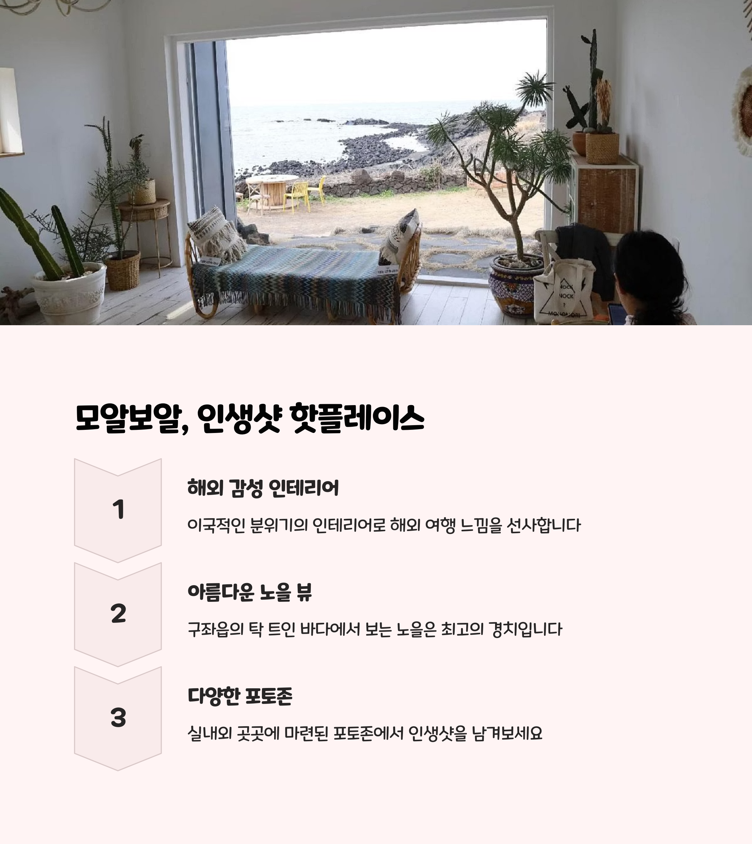 | 원앤온리 / 모알보알 / 더클리프 | 포토존, 노을, 이국적 감성 | 허니문하우스, 노티드제주 |
