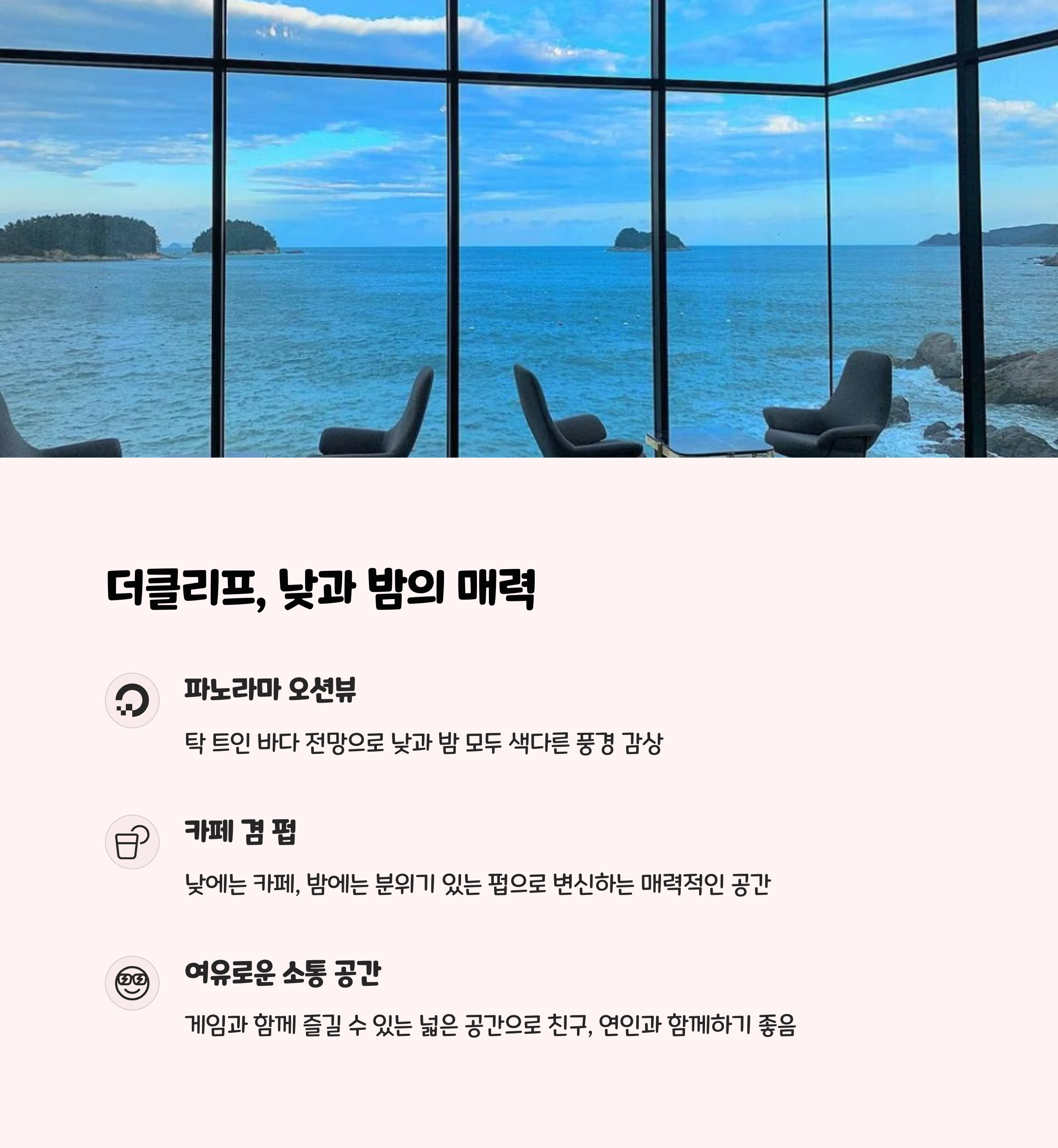 더클리프는 낮에는 오션뷰 카페, 밤에는 분위기 있는 펍으로 변신하는 멀티 스폿입니다. 동남아 리조트를 연상케 하는 야외 좌석과 조명이 매력적이죠. 허니문하우스는 돌담집을 개조한 빈티지 제주 스타일로, 정원이 넓고 감성 소품이 많아 마치 동화 속 공간 같고, 모알보알은 구좌읍의 오션뷰 노을 명소로, 필리핀 감성 인테리어와 SNS 핫플레이스로도 유명합니다.