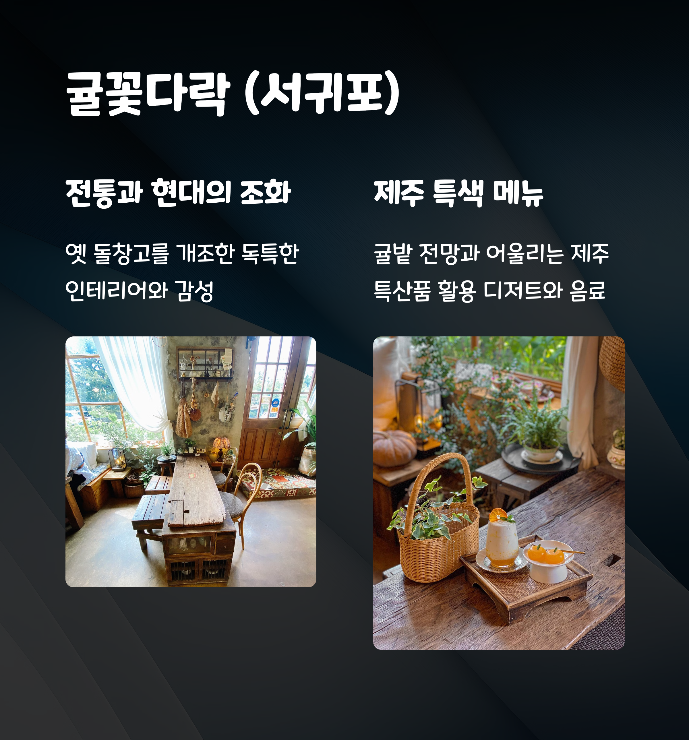 애월의 ‘봄날카페’는 오픈 초부터 꾸준히 사랑받는 대표 감성 카페로 오션뷰 테라스, 다양한 포토존, 아기자기한 공간 구성이 특징이에요. 서귀포 ‘귤꽃다락’은 돌창고를 개조한 빈티지한 인테리어와 귤밭 전망, 제주 특산 음료까지 만나볼 수 있어 감성과 지역성을 모두 담은 공간으로 추천됩니다.