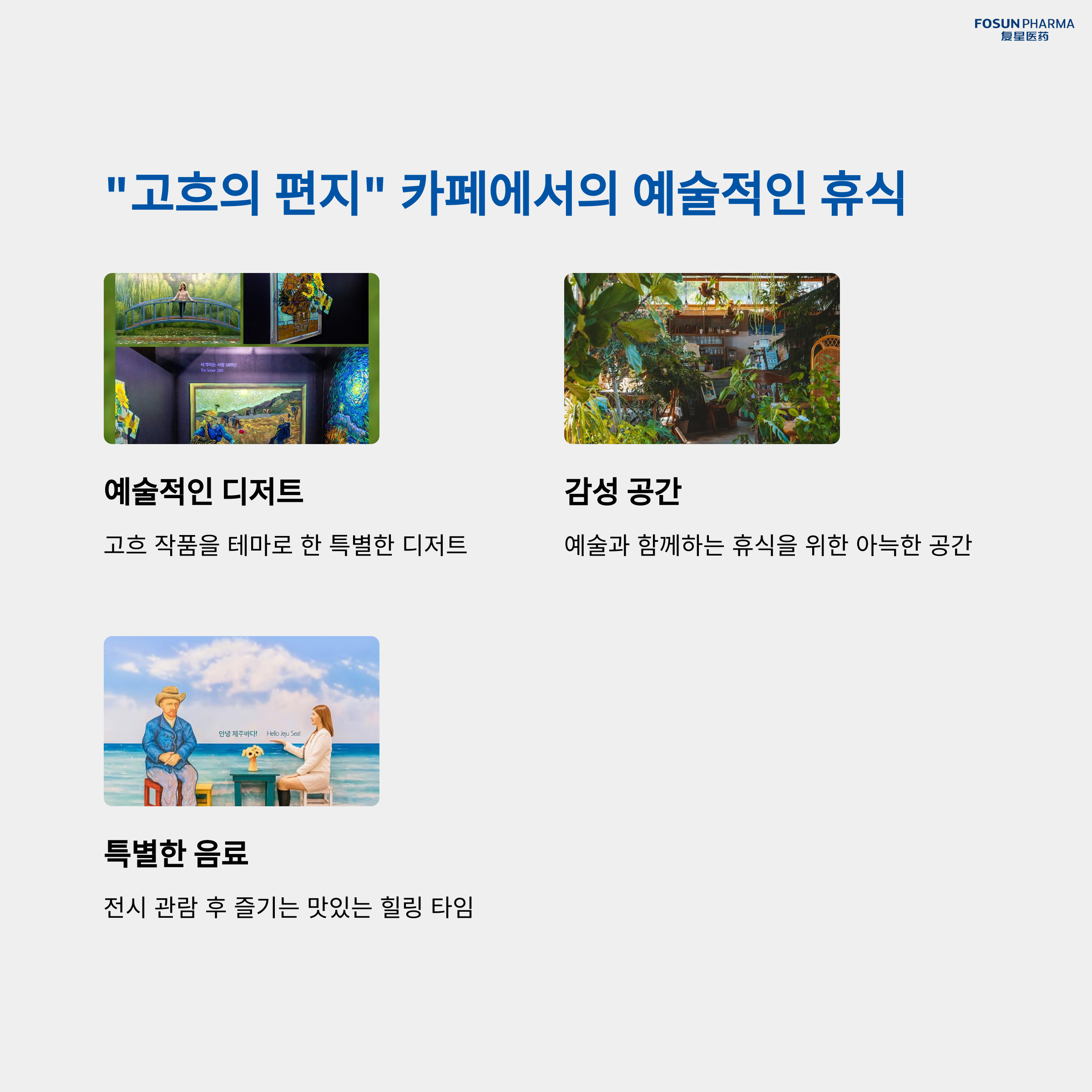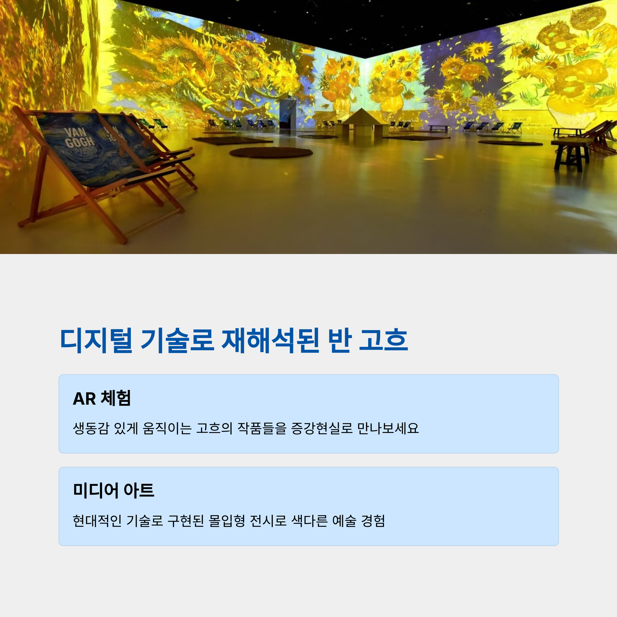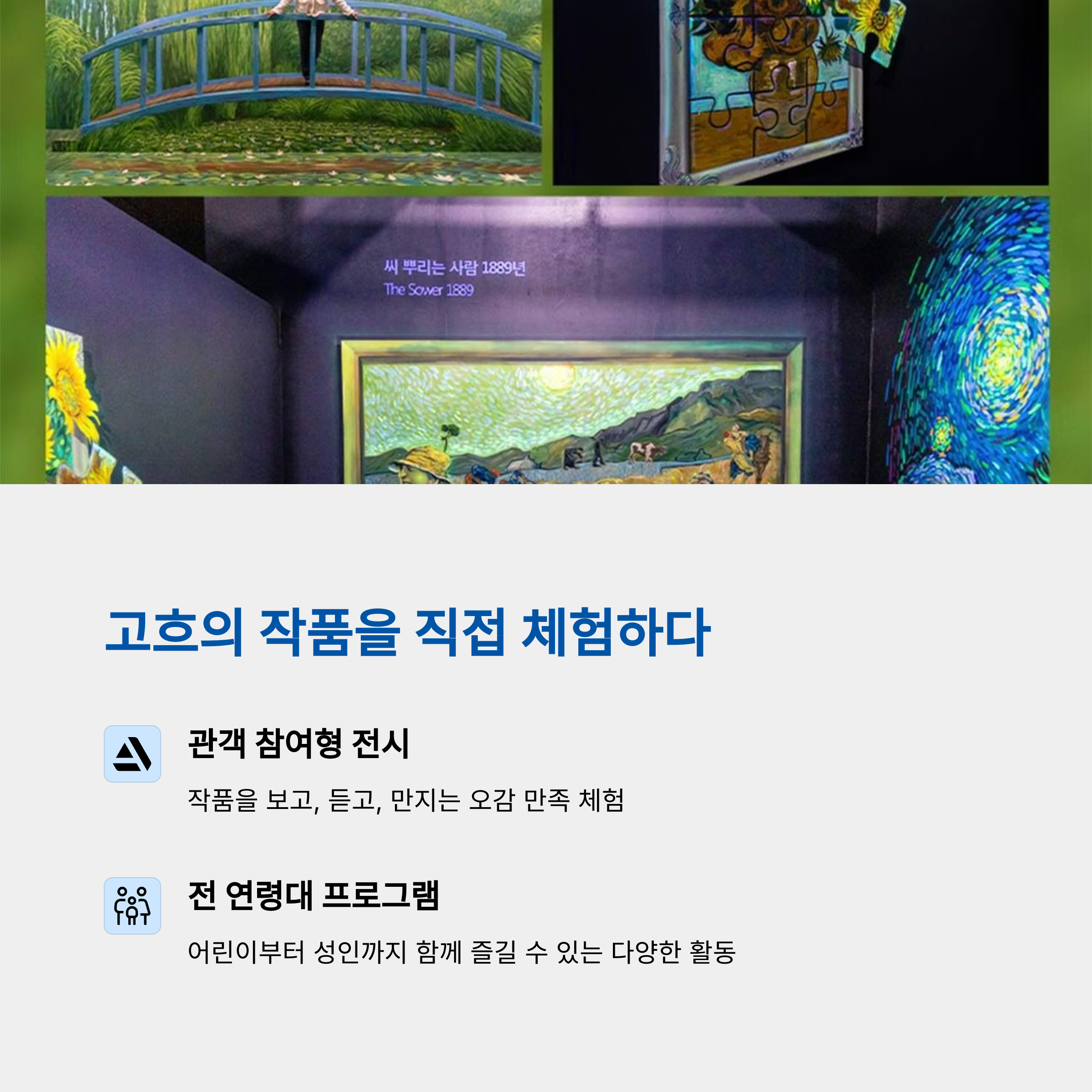 AR로 고흐 작품을 직접 체험하고 몰입할 수 있는 전시 공간 살아있는 파충류를 직접 보고 만지는 체험 프로그램 운영 고흐의 편지 카페에서 예술 감성 가득한 휴식 가능