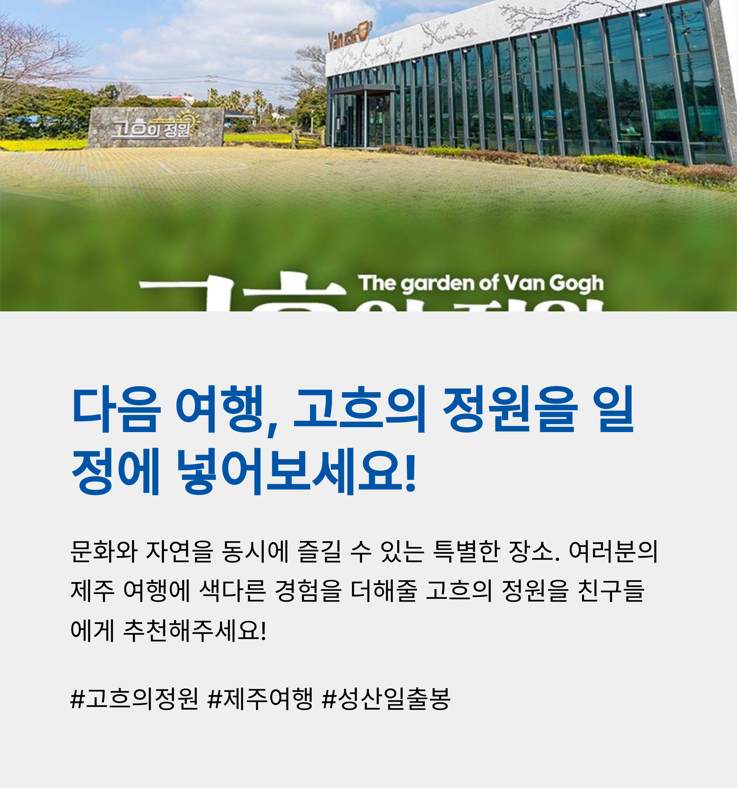 고흐의 정원은 제주 동쪽 여행 코스 중 예술과 체험, 자연을 동시에 만족시키는 몇 안 되는 공간입니다. 성산일출봉, 섭지코지 등 동쪽 해안 루트와도 가까워 일정 조율이 쉽고 이동이 편리하며, 비 오는 날이나 더운 날씨에도 실내외를 적절히 활용한 구성 덕분에 날씨 걱정 없이 방문 가능한 명소로 추천됩니다. 다양한 연령층의 관람객이 함께 웃고 느끼며 즐길 수 있는 곳, 그게 바로 고흐의 정원입니다.