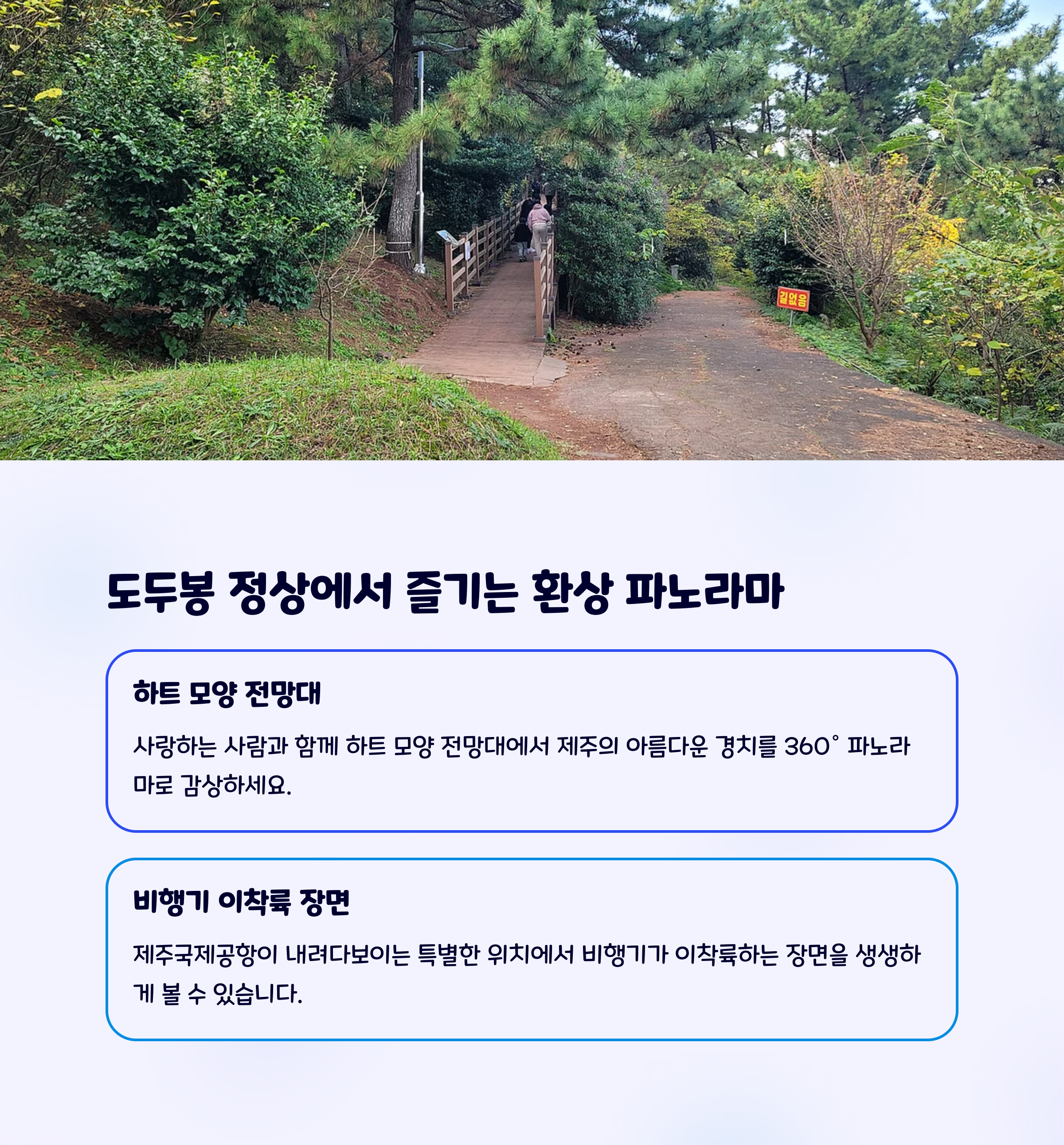 도두봉은 해발 약 65m의 낮은 오름으로, 정상까지 15분 이내로 오를 수 있어 가볍게 산책하기 좋은 코스입니다. 정상에서는 제주공항 활주로, 탑동, 해안선이 한눈에 들어오며, 특히 일출·일몰 시간대에 방문하면 빛과 바다가 어우러진 풍경을 감상할 수 있습니다. 코스 중간에는 전망 데크와 포토존도 마련되어 있어 부담 없이 자연과 뷰를 즐길 수 있는 도심 속 오름입니다.