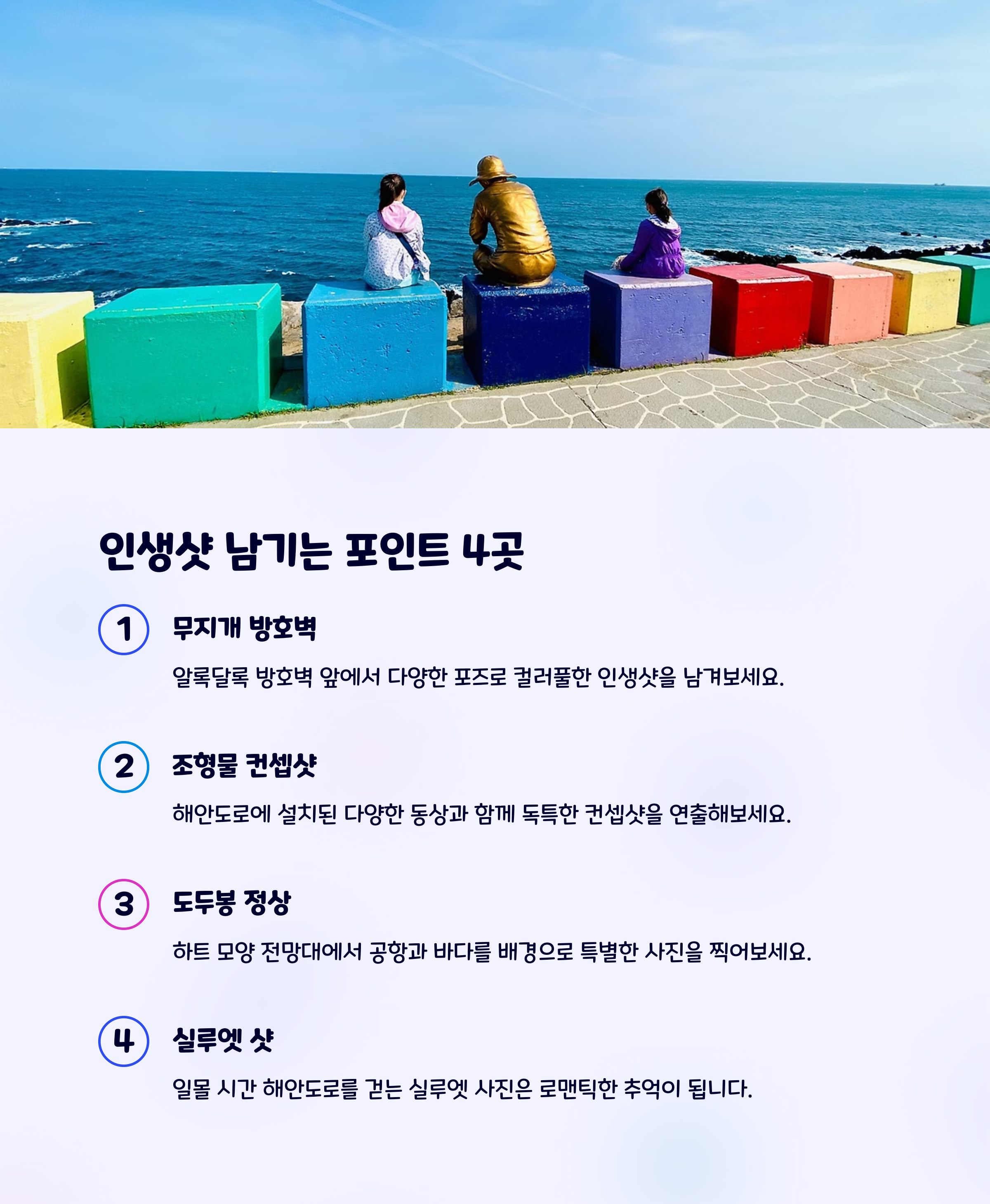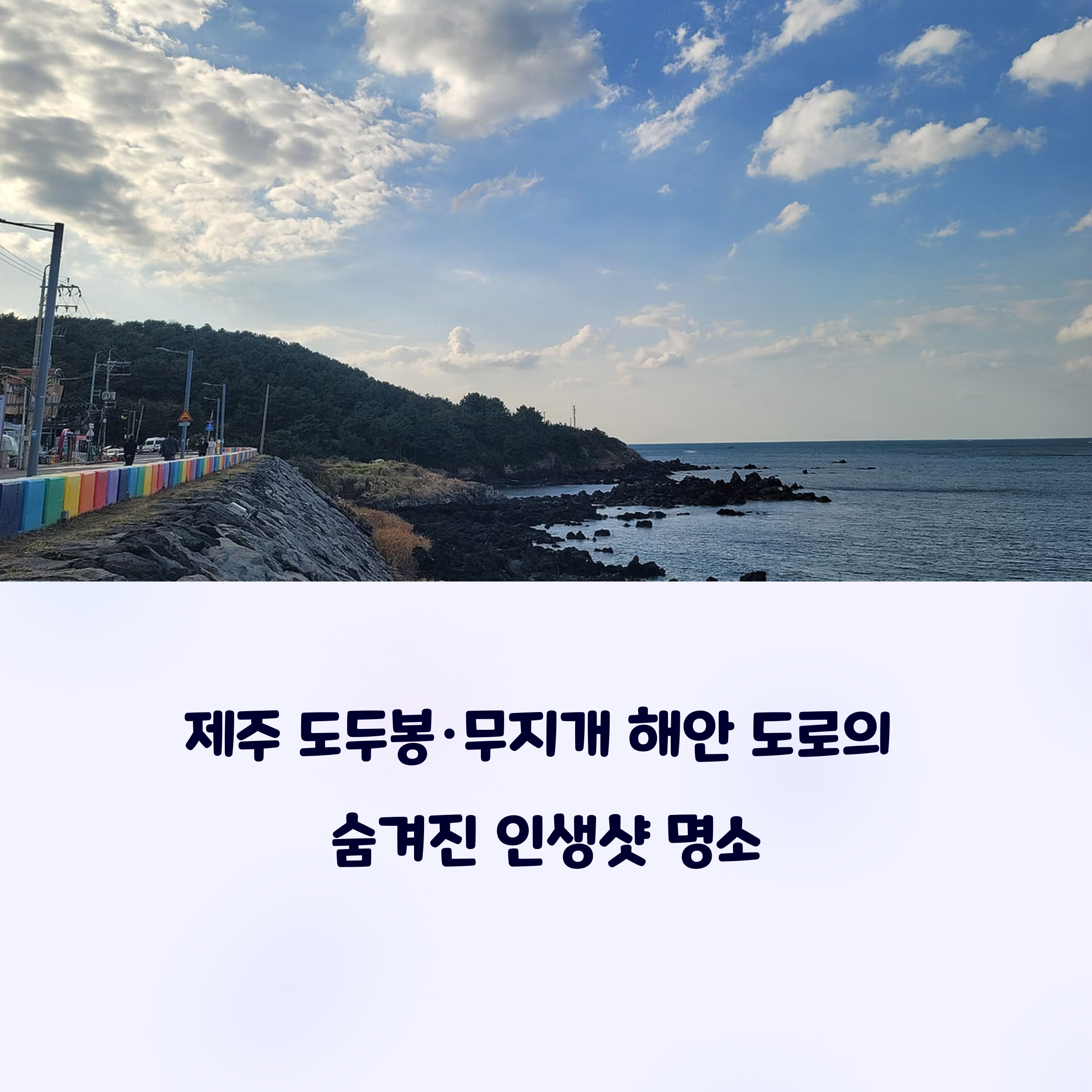 도두봉 아래쪽 해안도로 구간은 ‘무지개해안도로’로 불리며, 알록달록한 무지개색 방호벽과 바다 풍경이 어우러져 감성 사진 명소로 SNS에서 큰 인기를 끌고 있습니다. 해안도로를 따라 도보 15~20분 정도 산책이 가능하고, 바다를 배경으로 인생샷, 커플 사진, 셀프 촬영을 남기기에도 제격입니다. 날씨가 맑은 날에는 한라산 실루엣까지 보이는 포인트도 있습니다.