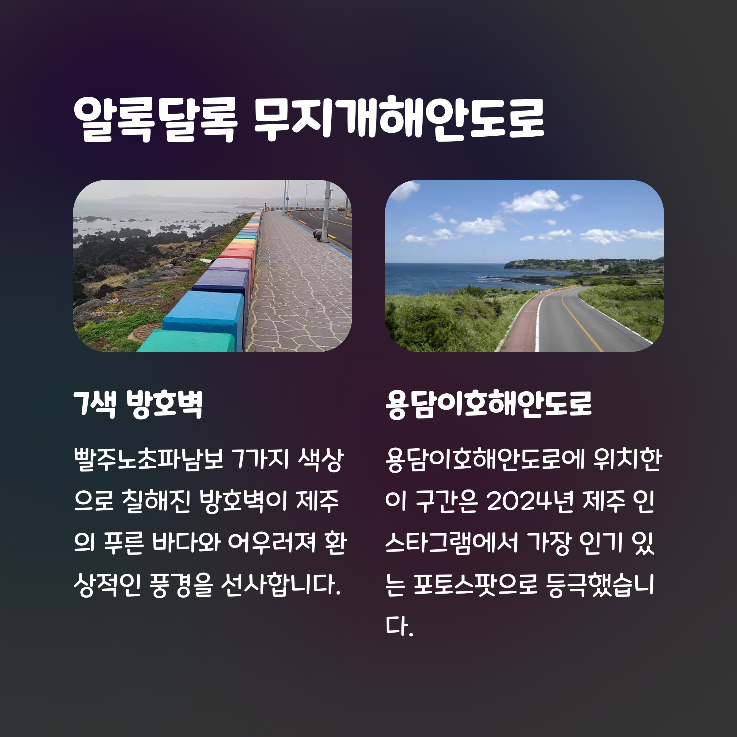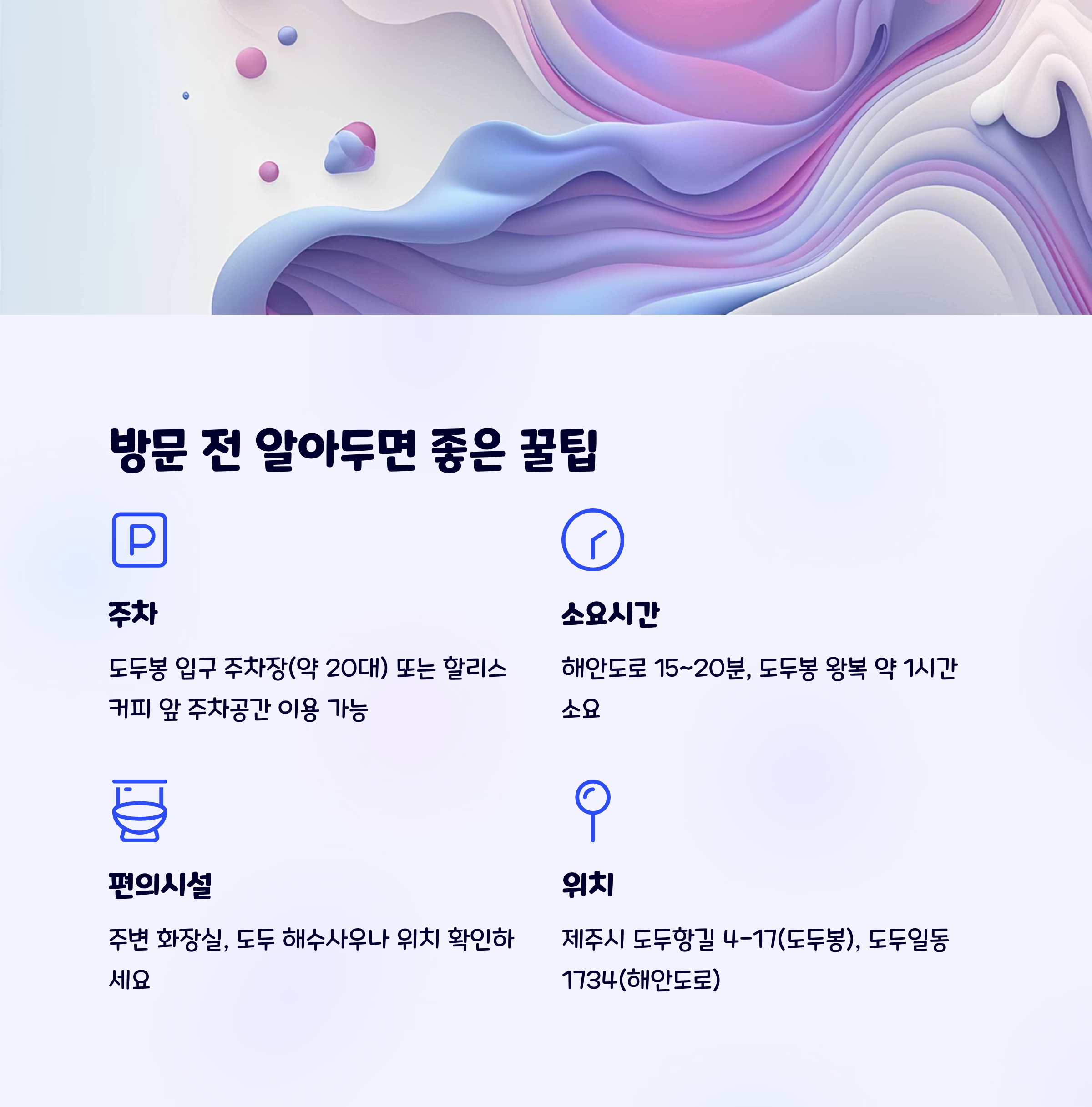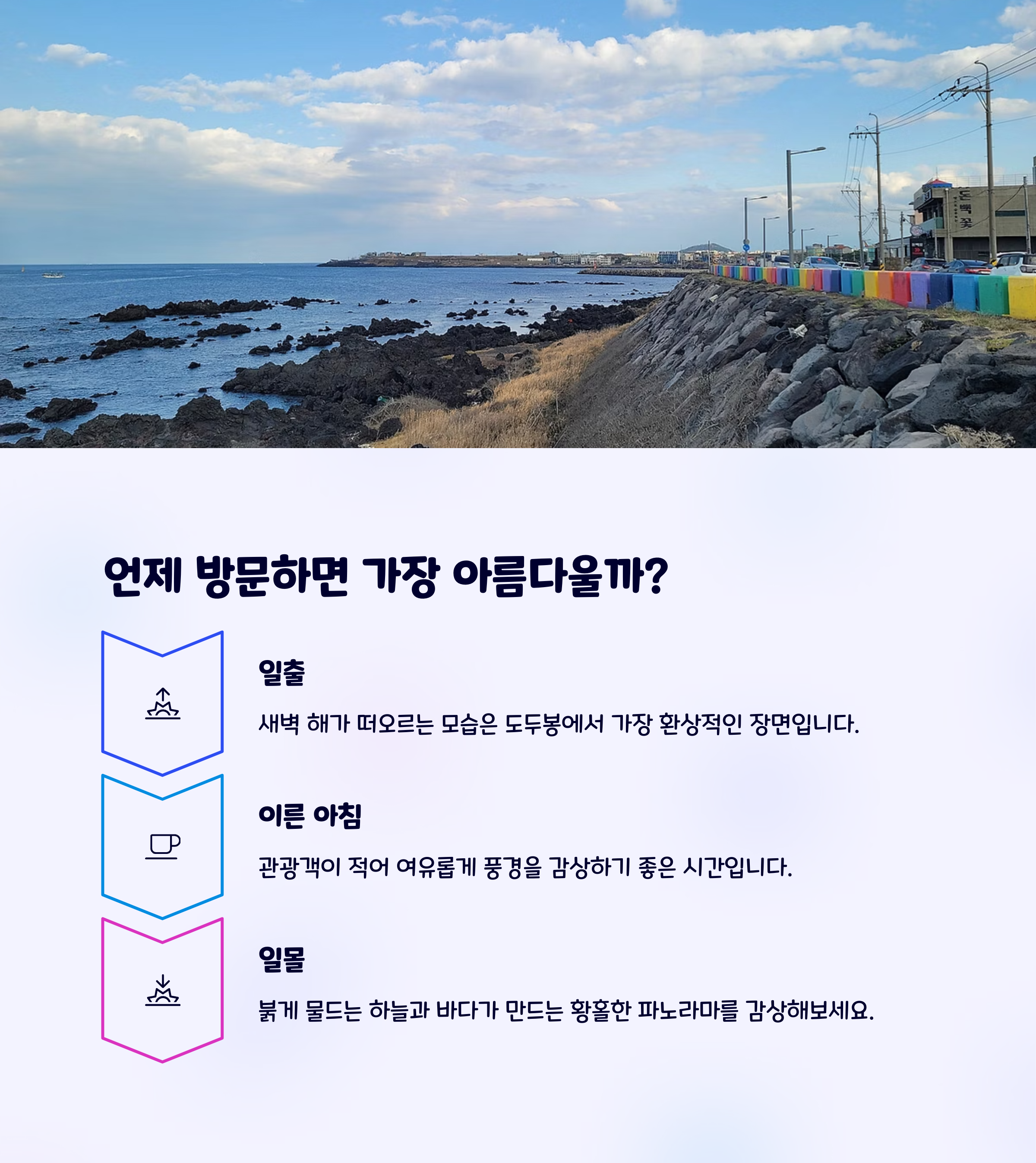 | 추천 포인트 | 무지개방호벽 인생샷, 바다 산책, 도두봉 정상 뷰포인트 |