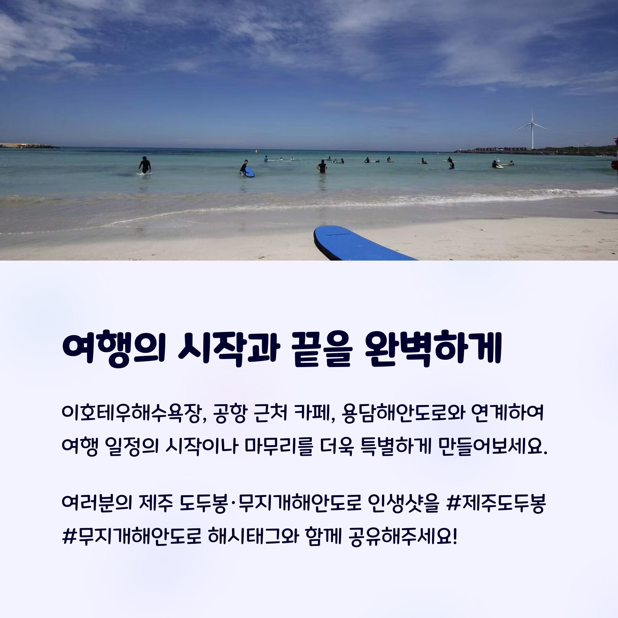 제주공항과 가까우면서도 자연, 산책, 감성 사진을 모두 즐길 수 있는 도두봉~무지개도로는 가벼운 일정에 딱 맞는 여행지입니다. 잠깐의 여유와 푸른 바다가 함께하는 이 구간에서 여행의 시작 혹은 마무리를 특별하게 만들어보세요.