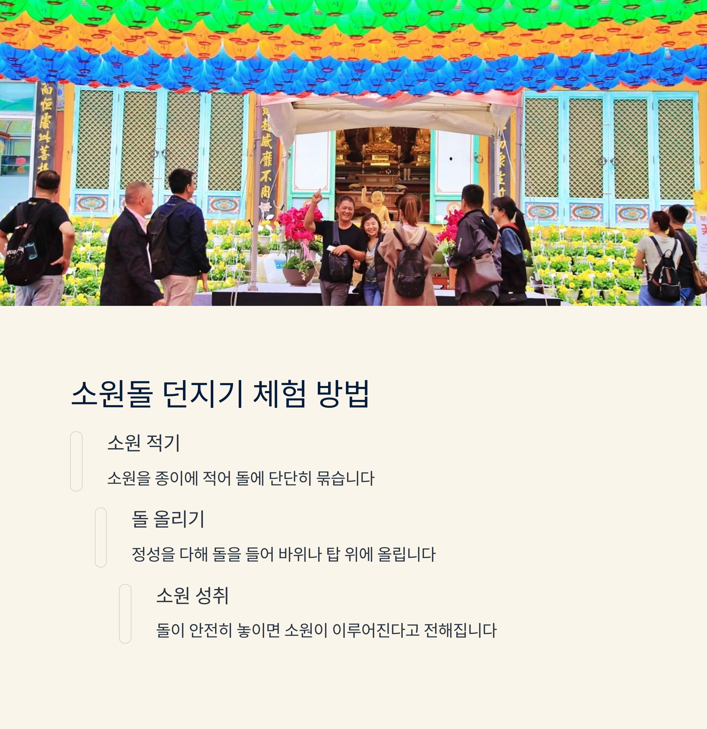 | 소원돌 던지기 | 소원을 적은 종이를 돌에 묶어 탑에 던지는 체험 |