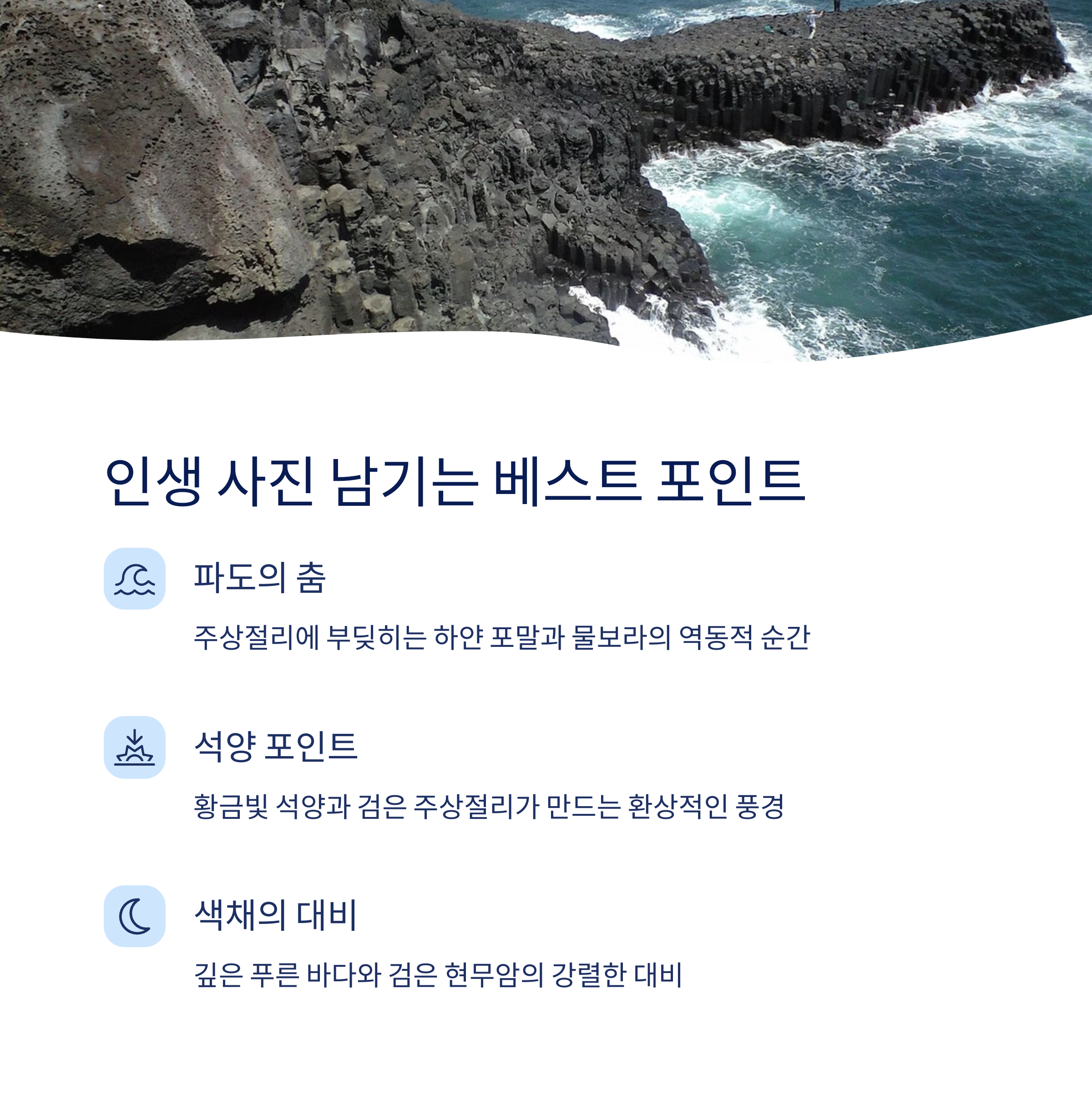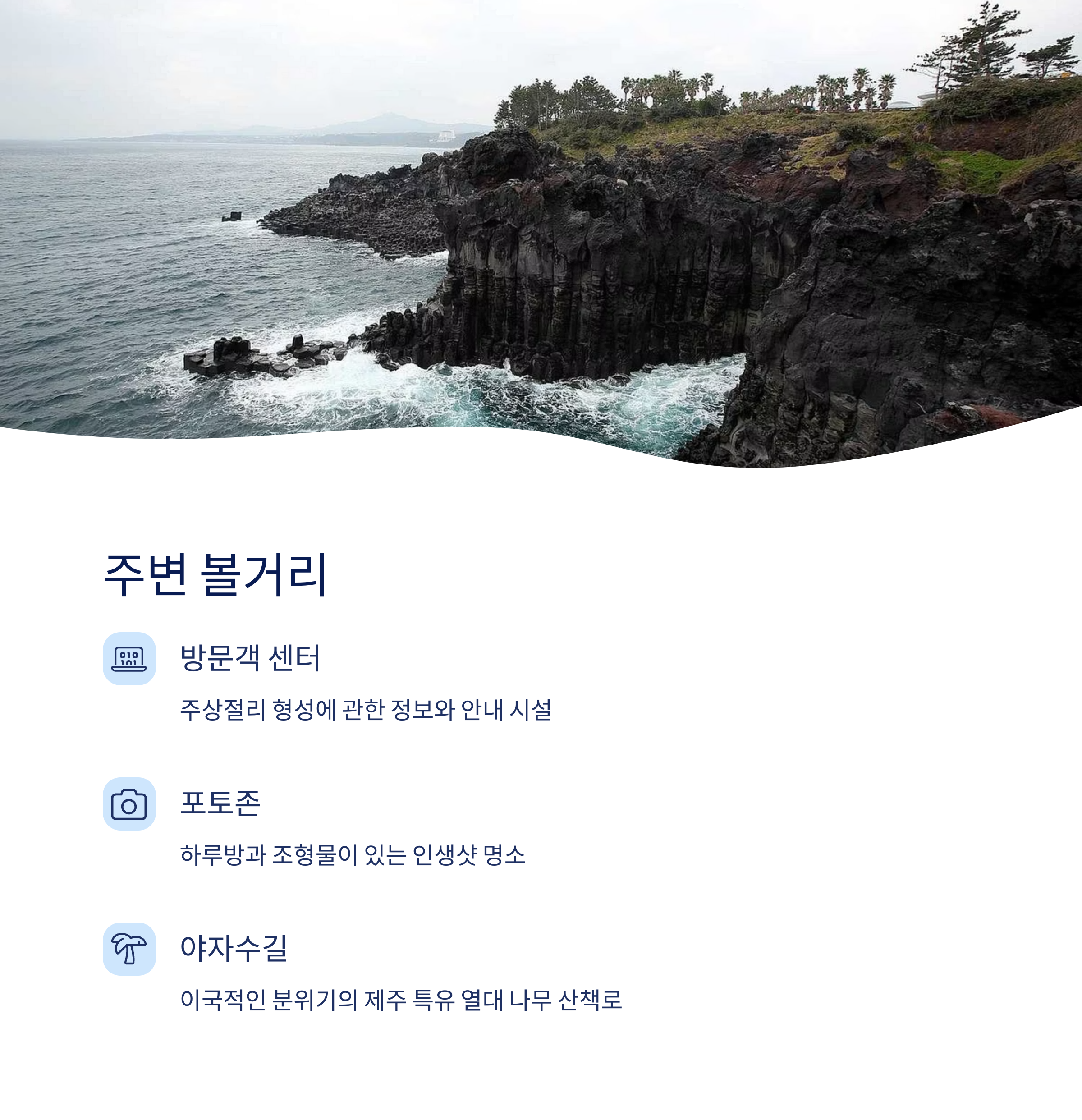 | 4~6각형 주상절리, 해안 절벽과 포말이 어우러진 장관 | 입장료: 성인 2,000원 / 청소년·어린이 1,000원 / 주차장 완비 | 중문관광단지, 천제연폭포, 올레 8코스, 여미지식물원 |
