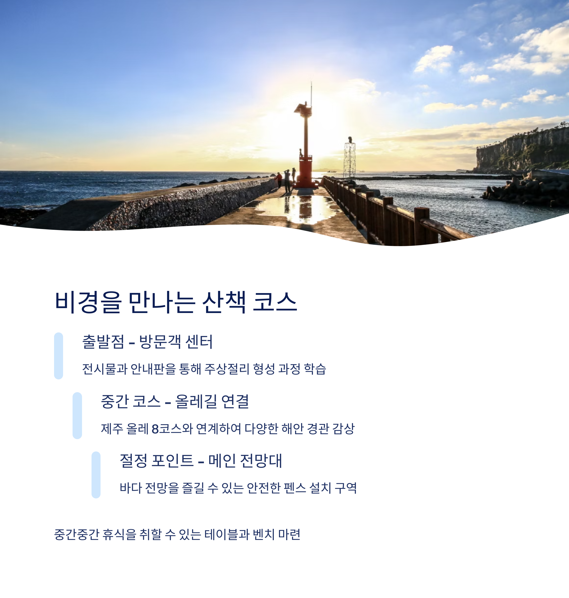 잘 정비된 데크 산책로와 전망대는 누구나 안전하고 편하게 풍경을 감상할 수 있도록 조성되어 있으며, 특히 해질녘에는 노을과 바다, 기암괴석이 어우러져 제주의 이국적인 해안 뷰를 만끽할 수 있습니다. 주변에는 야자수가 늘어선 산책로도 있어 휴양지 느낌의 산책 코스로도 인기가 높습니다.