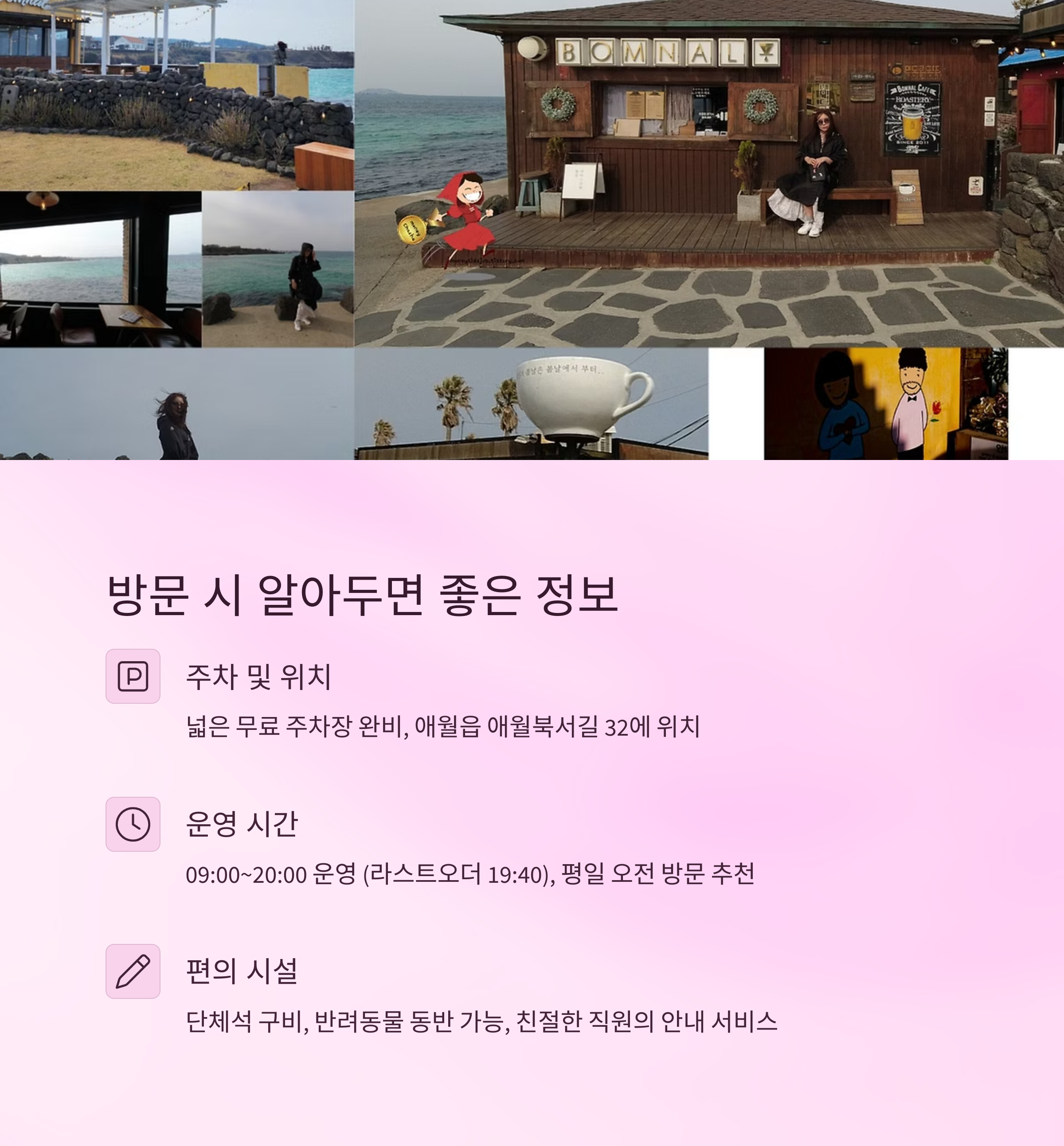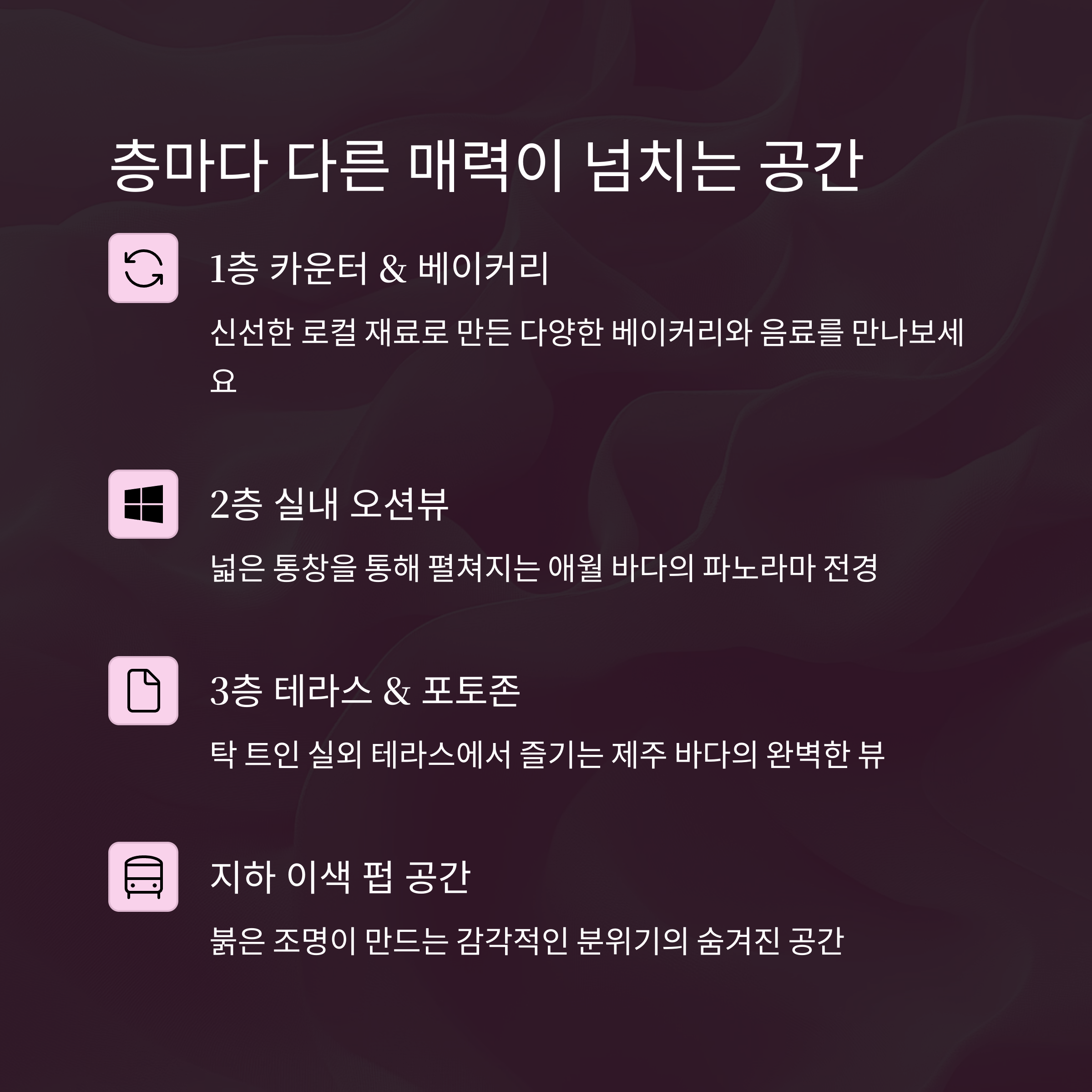 | 대중교통 이용 시 애월버스정류장에서 도보 8분 | 매일 다른 베이커리 종류 제공 | 포토존 다수, 3층 테라스 일몰 감상 가능 |