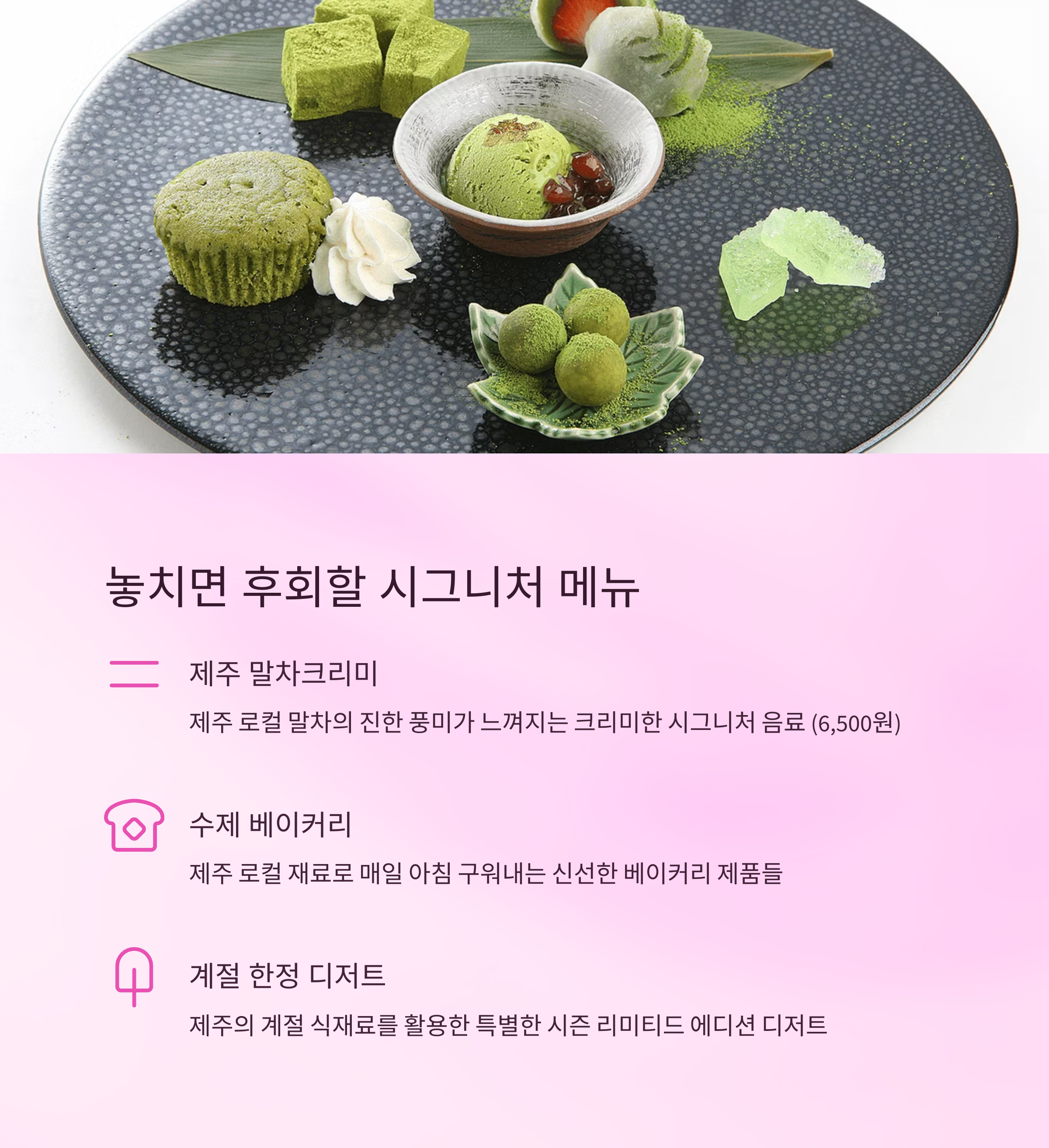 | 시그니처 음료 | 제주 말차크리미, 다양한 디저트와 베이커리 |