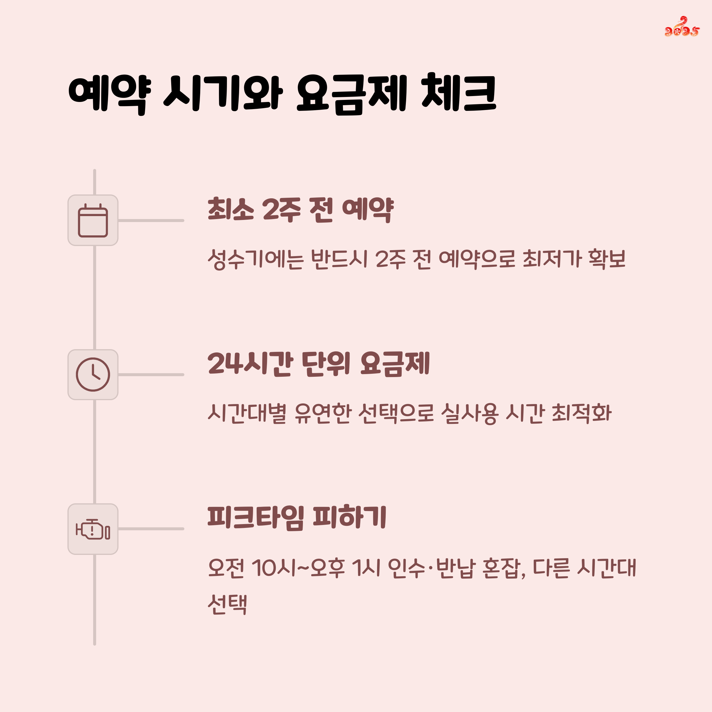 | 성수기엔 최소 2주 전 예약 권장 | 오전 피크타임 피해 여유 있게 인수 | 전기차일 경우 충전소 위치 사전 확인 |
