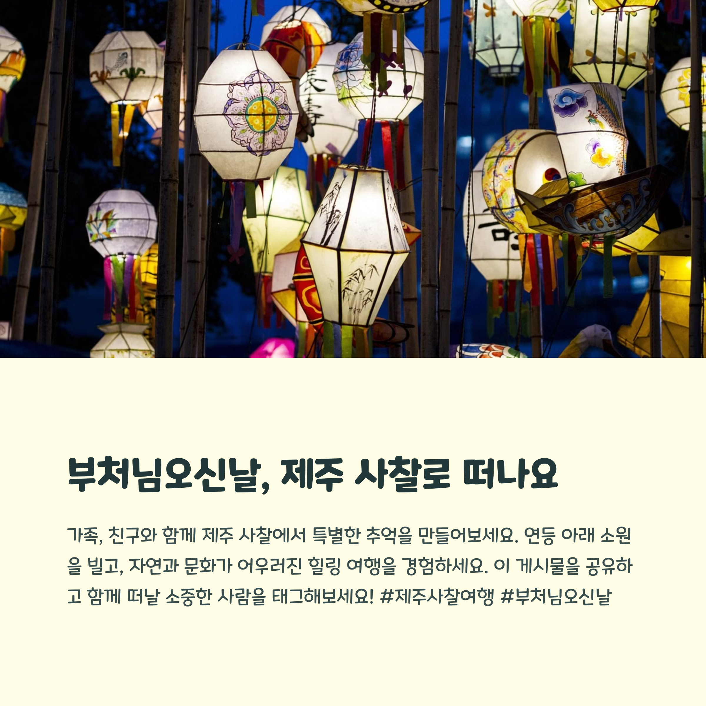 제주는 천혜의 자연환경 속에서 불교문화를 접할 수 있는 특별한 공간입니다. 부처님오신날을 맞아 평소 접하기 어려운 다양한 행사와 체험이 마련되어 있어, 가족과 함께 또는 연인과의 힐링 여행지로도 안성맞춤입니다. 사찰마다 고유의 색을 지니고 있으니 일정을 잘 계획해 여유롭게 둘러보시길 바랍니다. 연등을 밝히며 마음의 소원을 빌고, 고요한 산사의 울림 속에서 나를 돌아보는 시간은 일상의 피로를 씻어주는 소중한 기회가 될 것입니다.