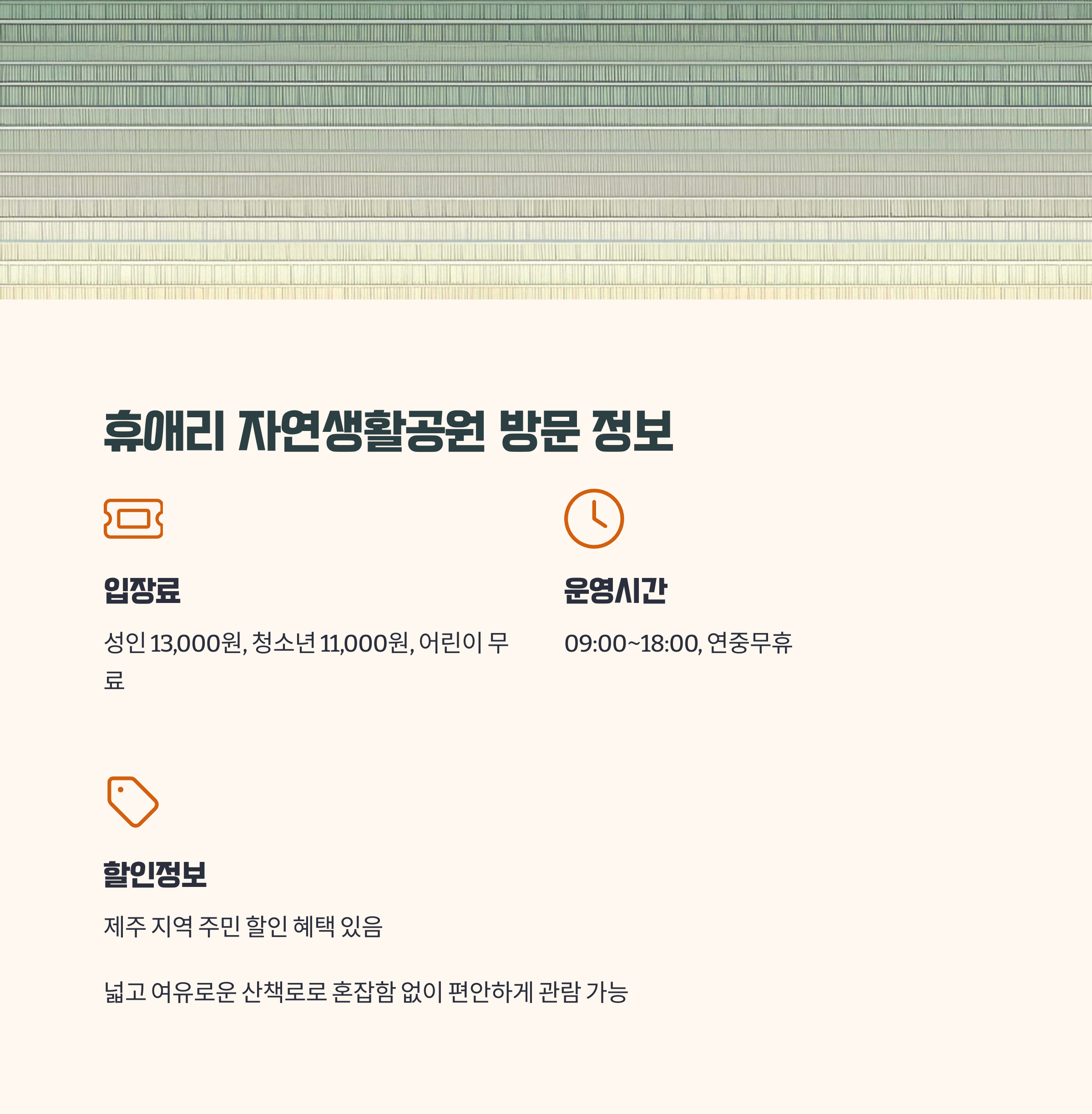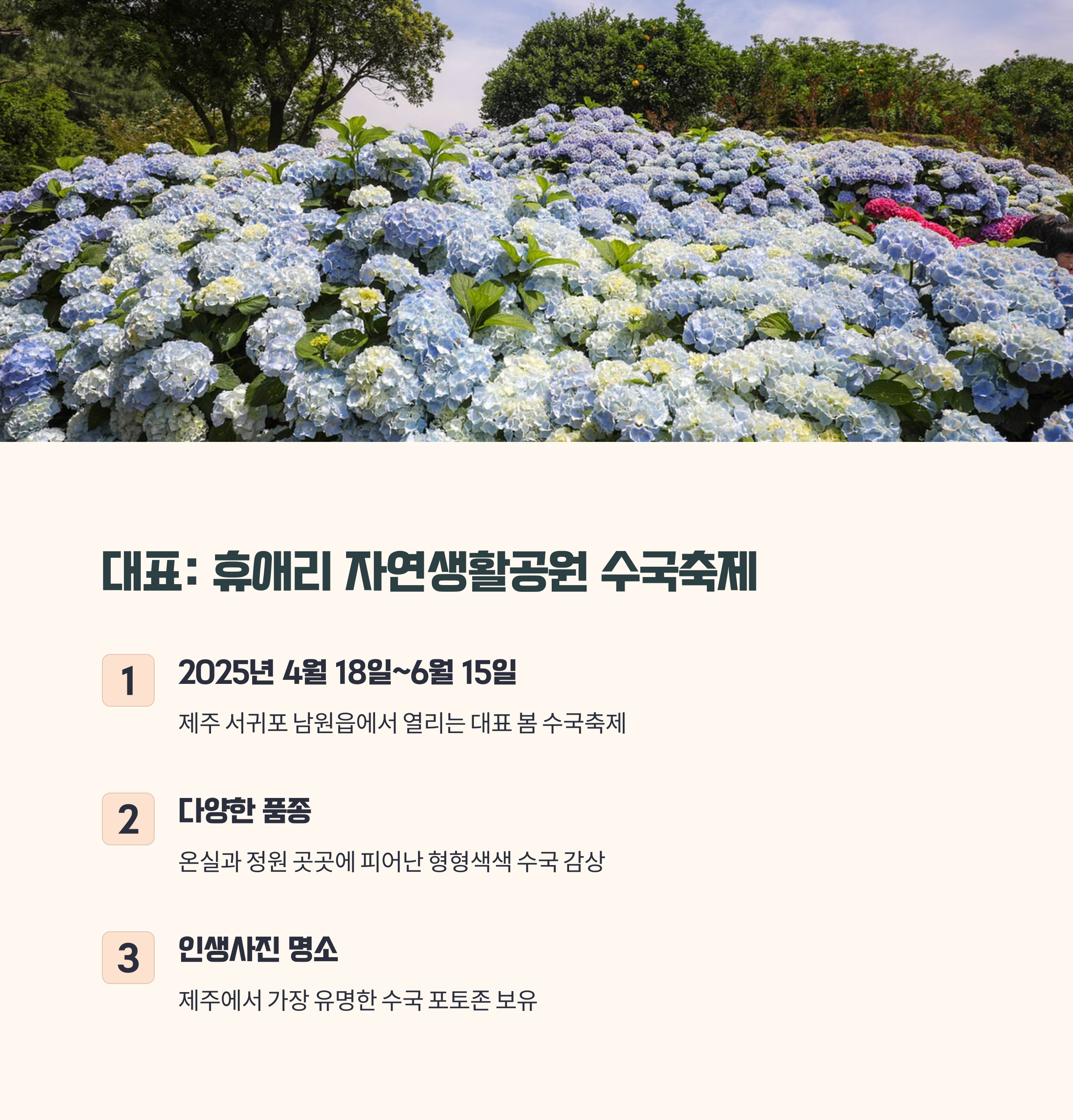 | 대표 축제 일정 | 휴애리 수국축제 2025년 4월 18일 ~ 6월 15일 |