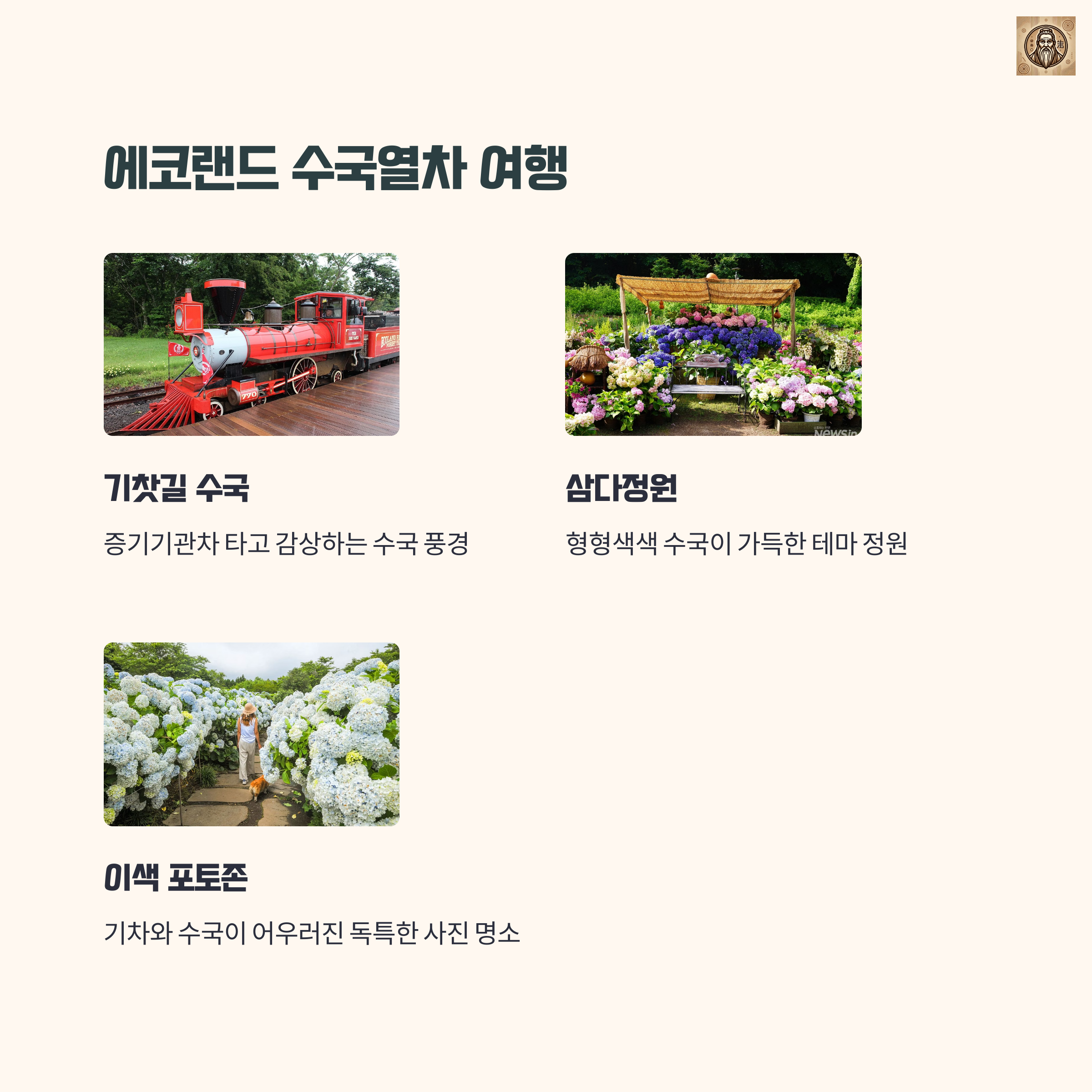 에코랜드는 기차를 타고 수국이 만개한 삼다정원을 감상할 수 있는 독특한 장소입니다. 특히 가족 단위 여행객에게 인기가 높으며, 자연과 어우러진 포토존이 풍성하게 마련되어 있어 이동 중에도 즐길 거리가 가득합니다. 혼인지 일대는 5월 말~6월 초에 하늘색, 연보라색 수국이 절정을 이루며, 바람이 불어오는 제주 동쪽 해안과 어우러져 영화 속 한 장면 같은 풍경을 만들어냅니다.