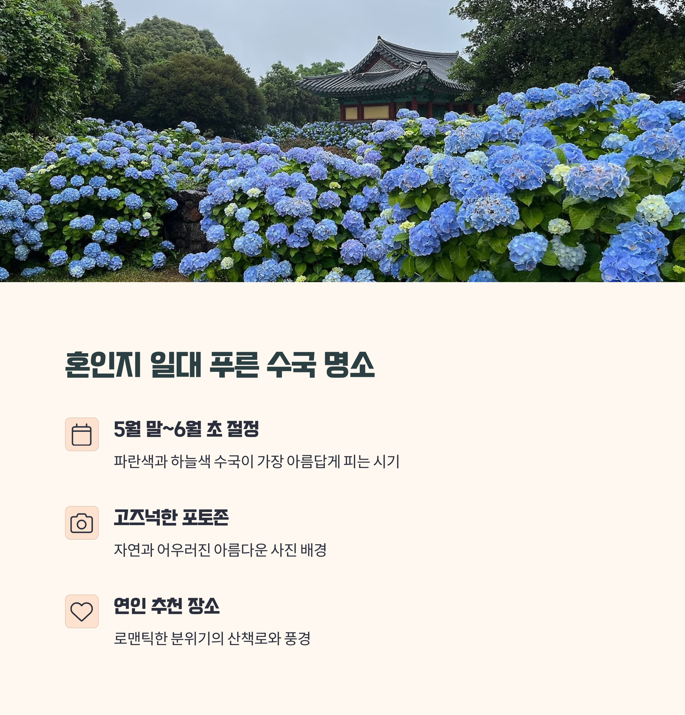 여러분이 가장 좋아하는 제주 수국 명소는 어디인가요? 추천하고 싶은 장소나 숨은 포토존이 있다면 댓글로 함께 공유해주세요. 더 많은 여행자들이 멋진 순간을 만들 수 있도록 여러분의 경험이 큰 도움이 됩니다!