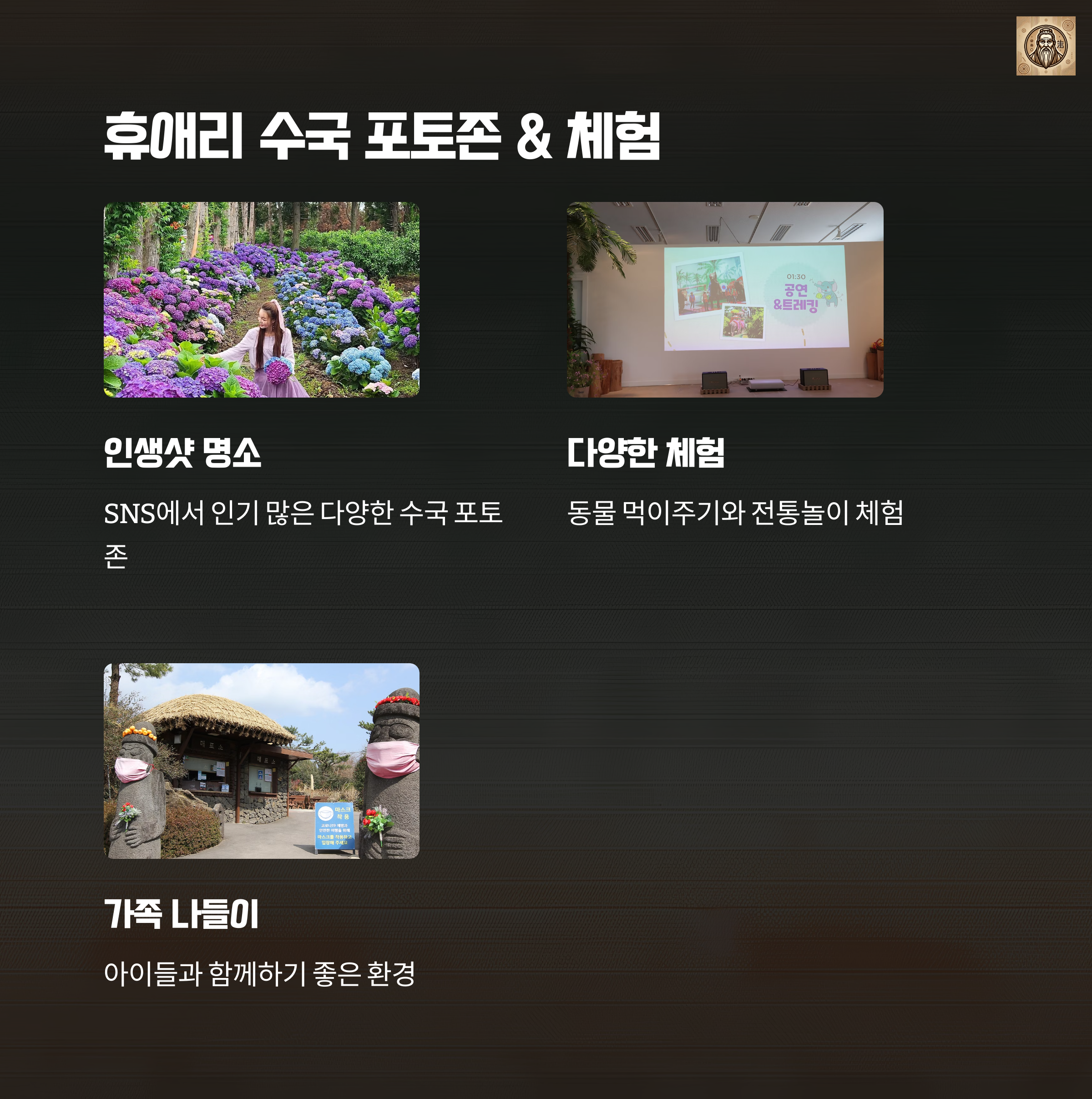 휴애리는 테마별 포토존이 잘 조성되어 있고, 에코랜드와 혼인지 일대는 자연 속 포토 포인트가 다양해 SNS에서도 인기가 많습니다.