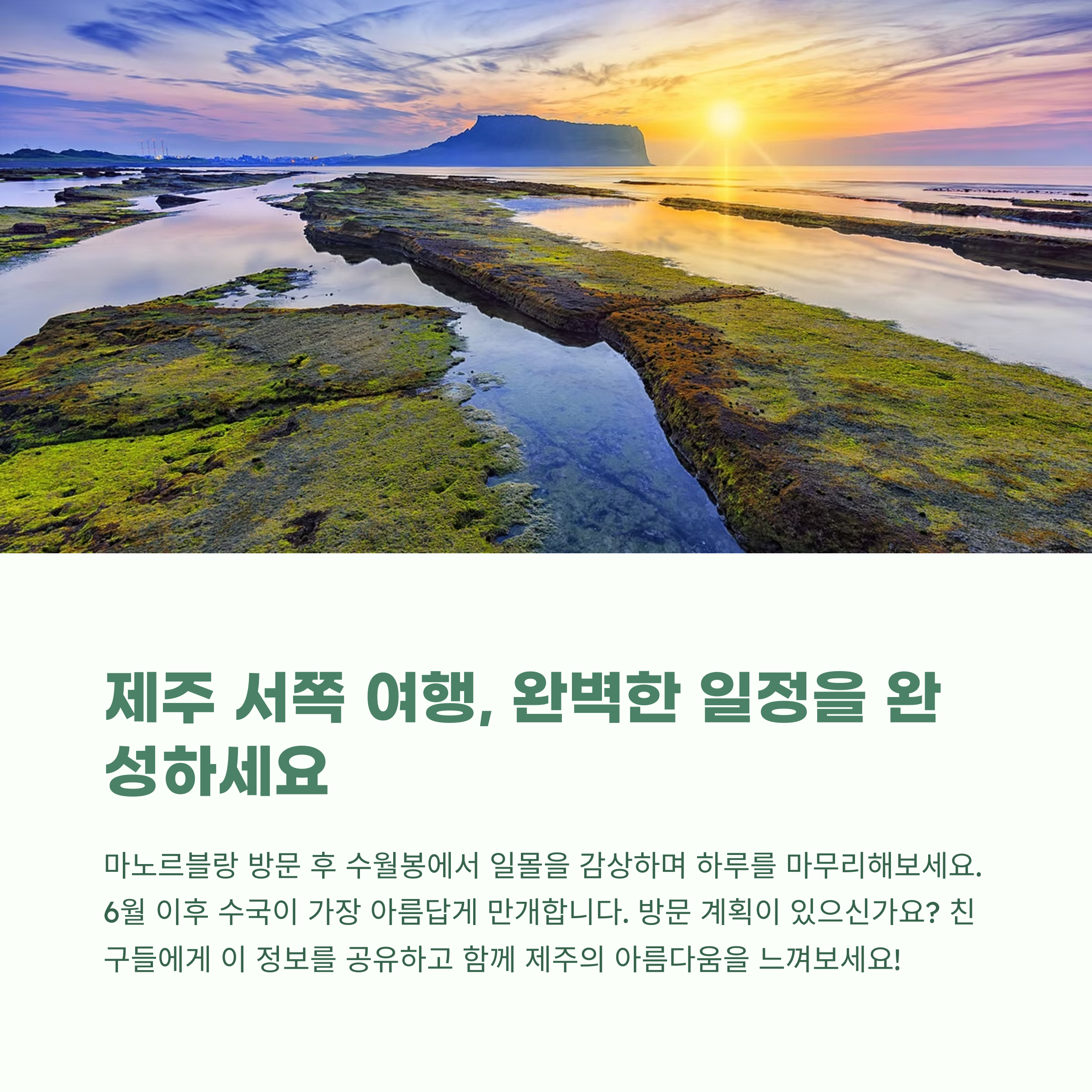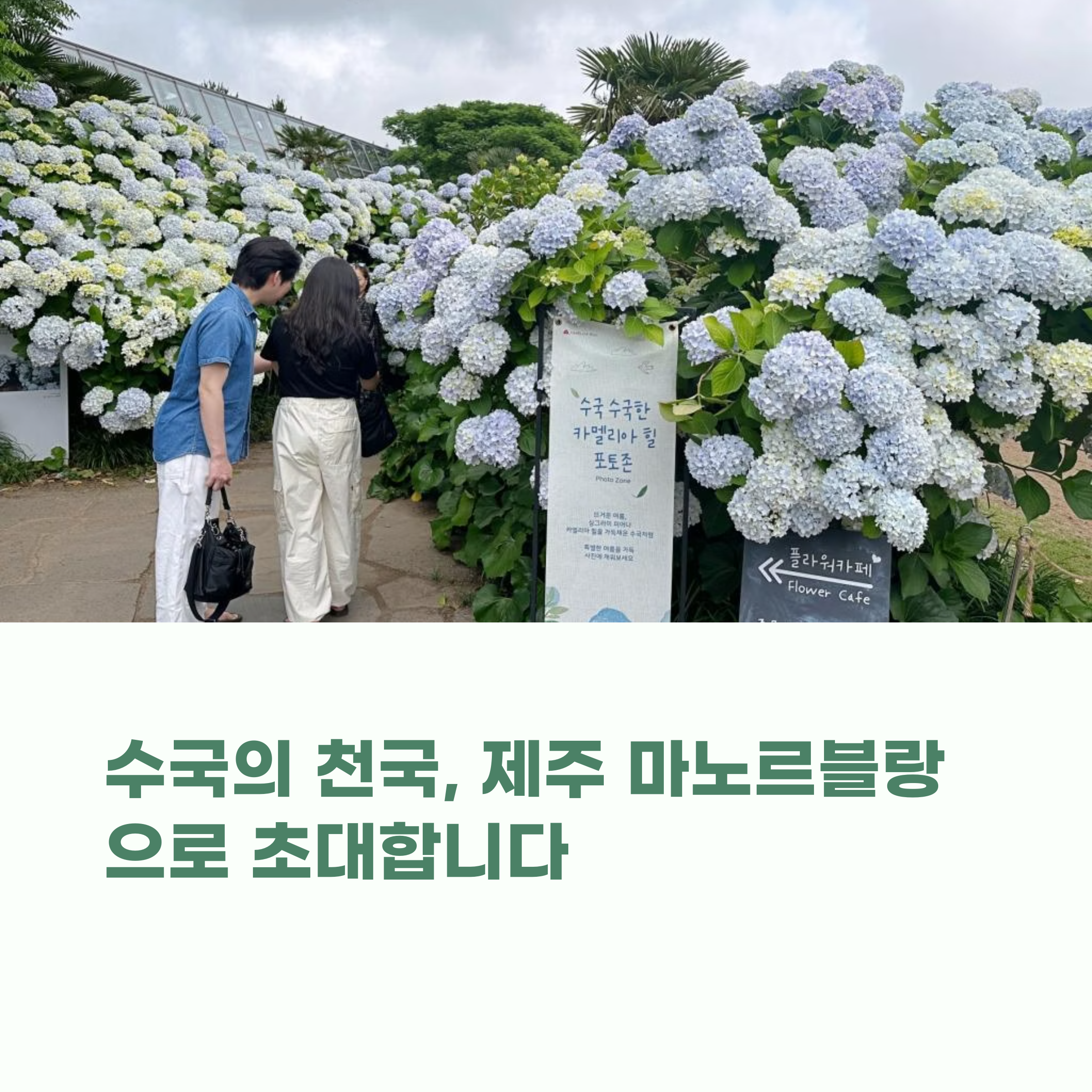 수국이 피어나는 계절, 제주 서쪽의 감성을 가득 담은 마노르블랑은 꽃보다 아름다운 풍경과 여유로운 산책, 감성 가득한 포토존까지 모두를 만족시키는 완벽한 여행지입니다. 봄과 여름 사이, 가장 찬란한 계절에 사계와 바다, 수국의 조화를 만끽하며 나만의 순간을 사진에 담아보세요. 마노르블랑은 그 기억을 더 특별하게 만들어줄 것입니다.
