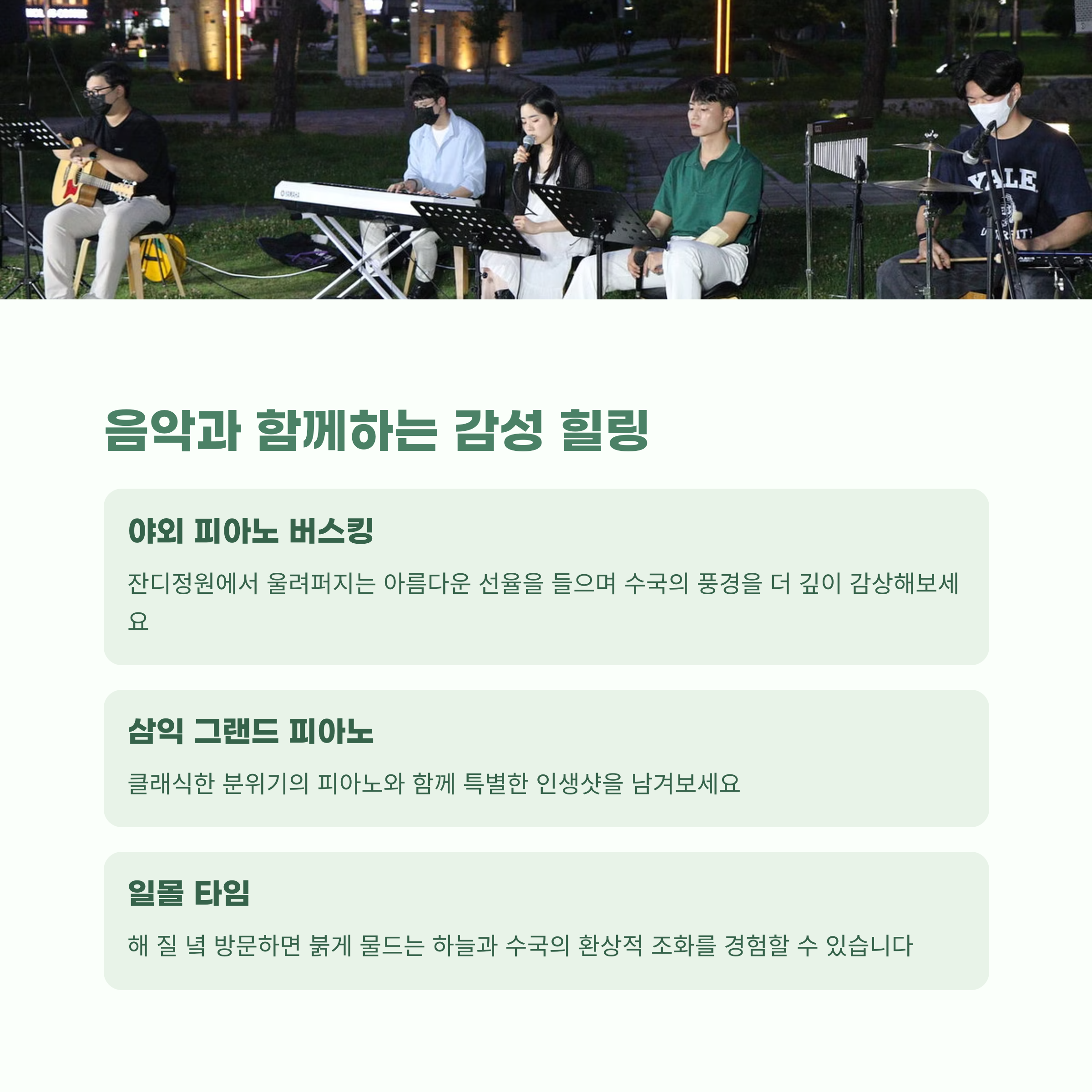 정원 곳곳에는 100m 수국길, 보랏빛 수국 포토존, 하트 조형물, 정자, 벤치 등 다양한 인생샷 명소가 조성되어 있어 가족, 연인, 친구와 함께 방문해도 만족도가 높습니다. 수국 시즌에 맞춰 열리는 야외 피아노 버스킹은 꽃과 음악이 어우러진 감성적인 무드를 완성해 자연을 배경으로 한 특별한 추억을 남기기에 딱입니다.