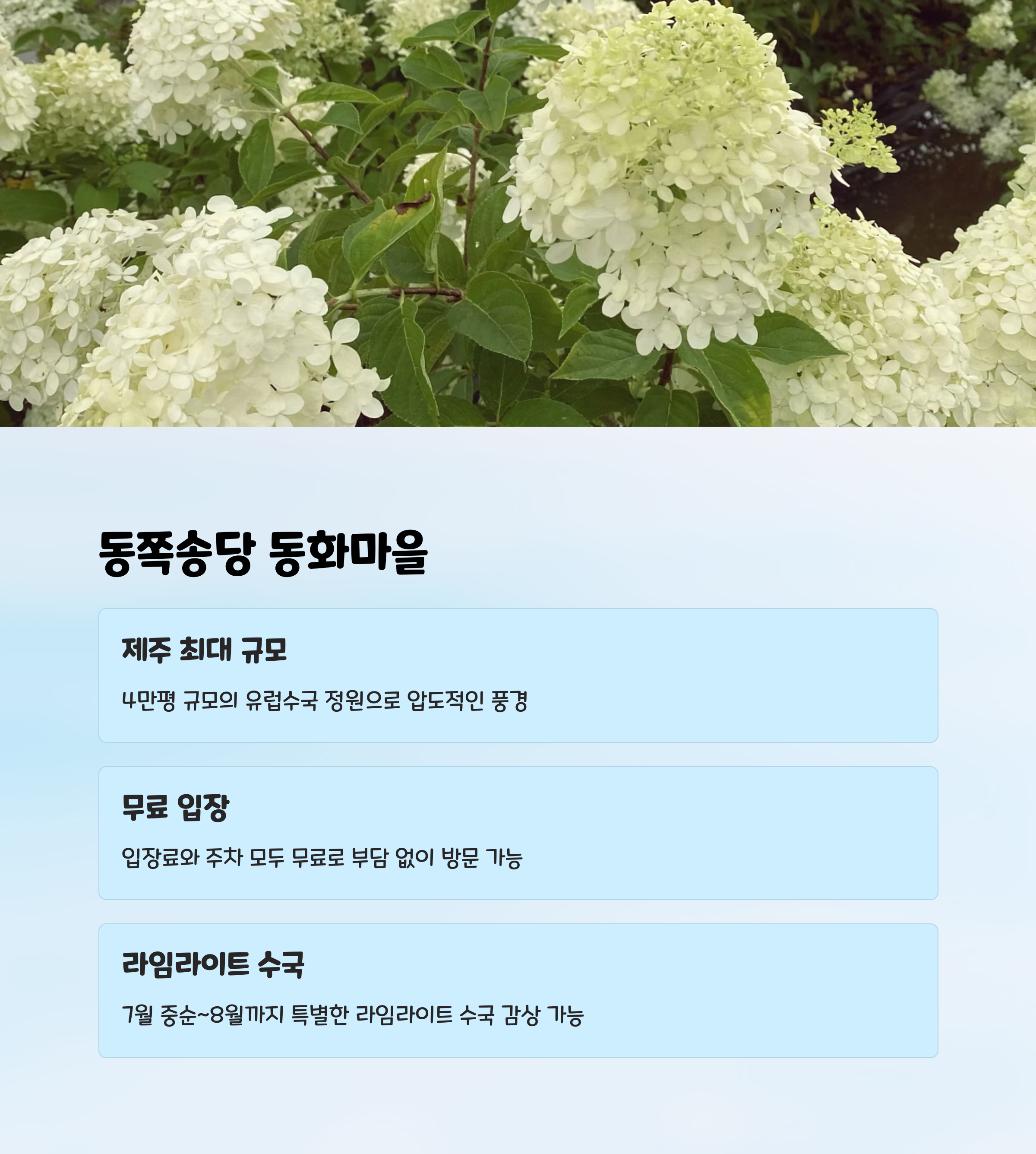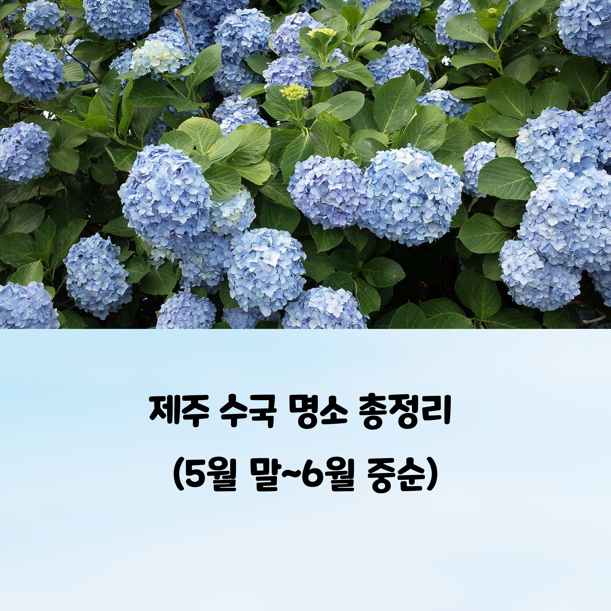 | 수국 시즌 | 5월 말 ~ 6월 중순, 제주 수국 만개 시기 |