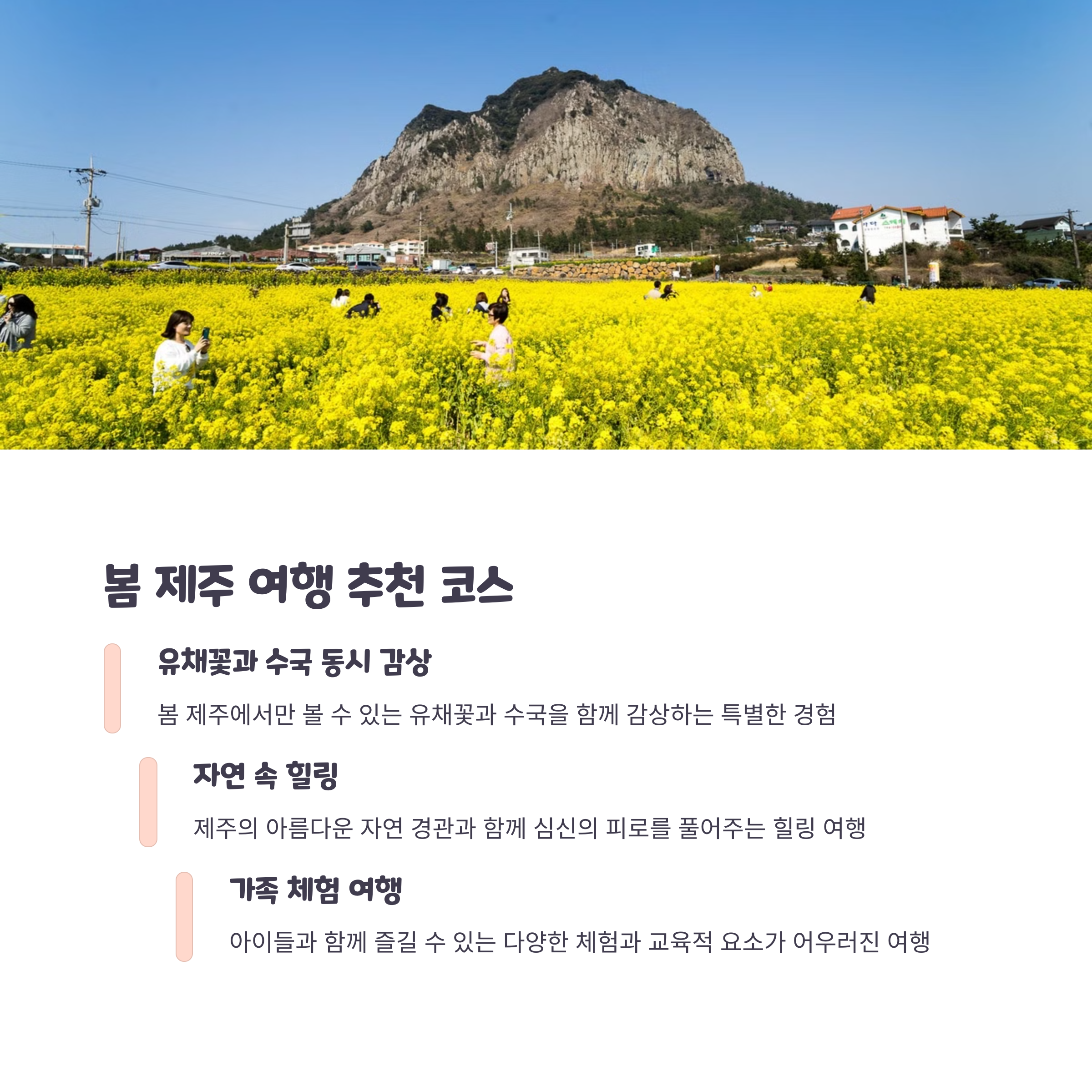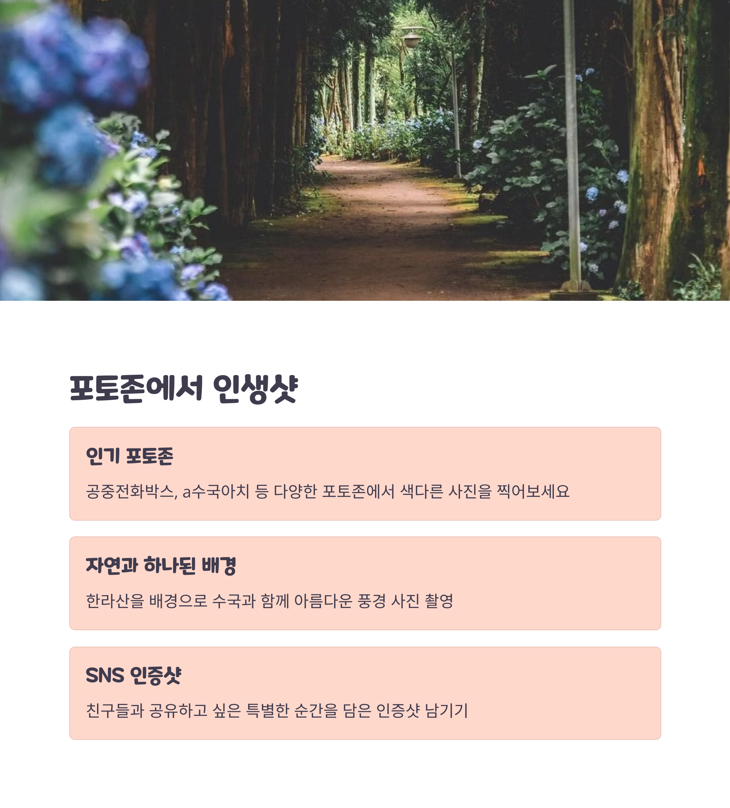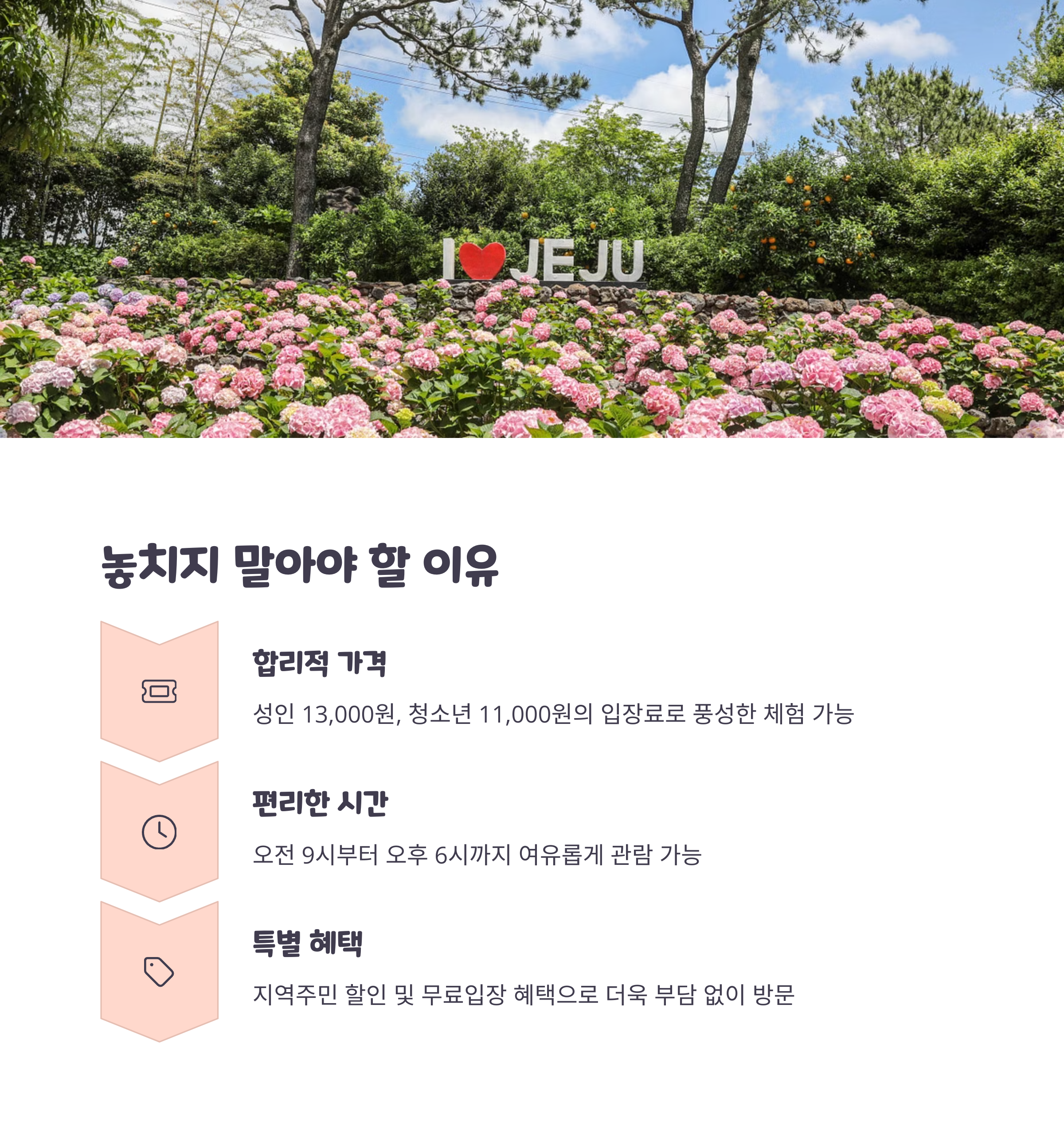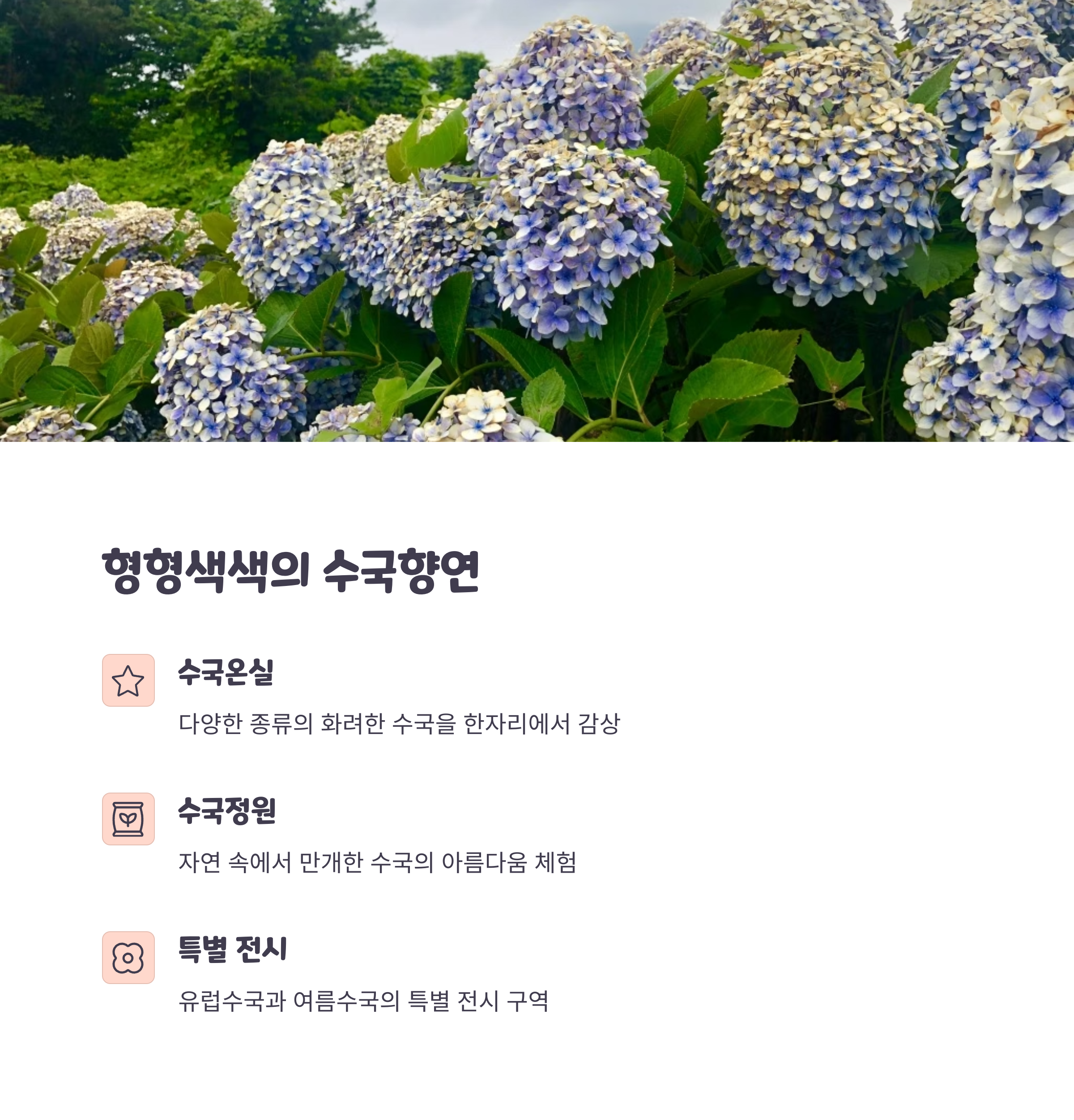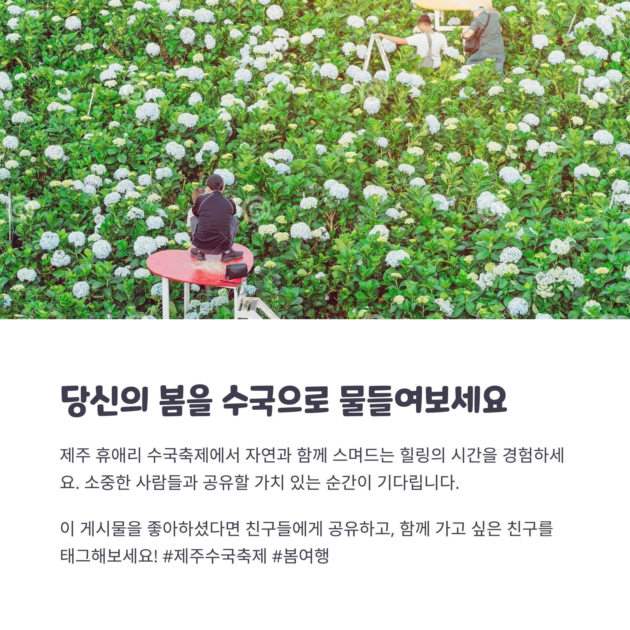 | 4월~6월 제주에서 수국축제가 열려요. | 포토존이 많아 인생샷 찍기 좋은 곳이에요. | 꽃과 체험을 동시에 즐길 수 있는 여행지랍니다. |