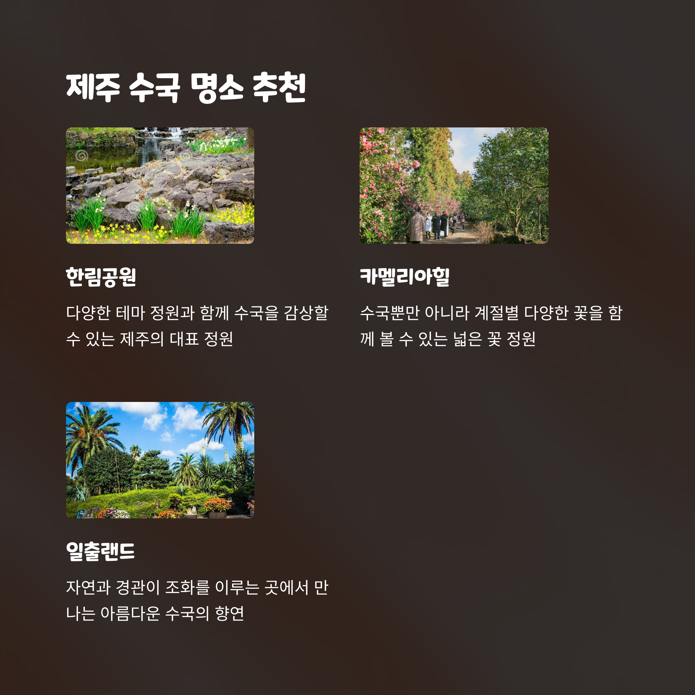 | 휴애리 자연생활공원에서 열리는 대표 축제예요. | 다양한 컬러의 수국이 펼쳐져 있어 감동적이에요. | 카멜리아힐, 한림공원, 일출랜드도 함께 추천돼요. |