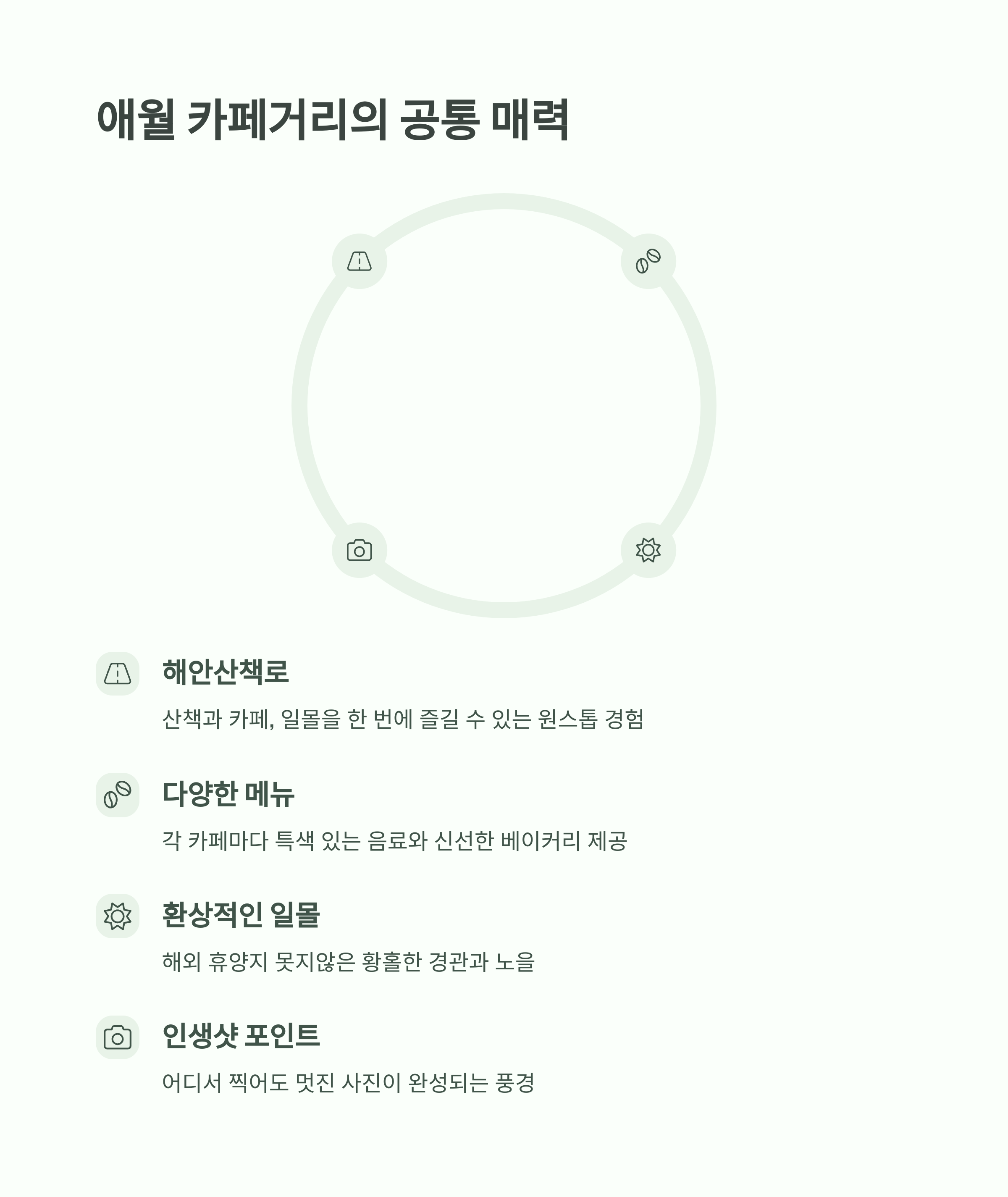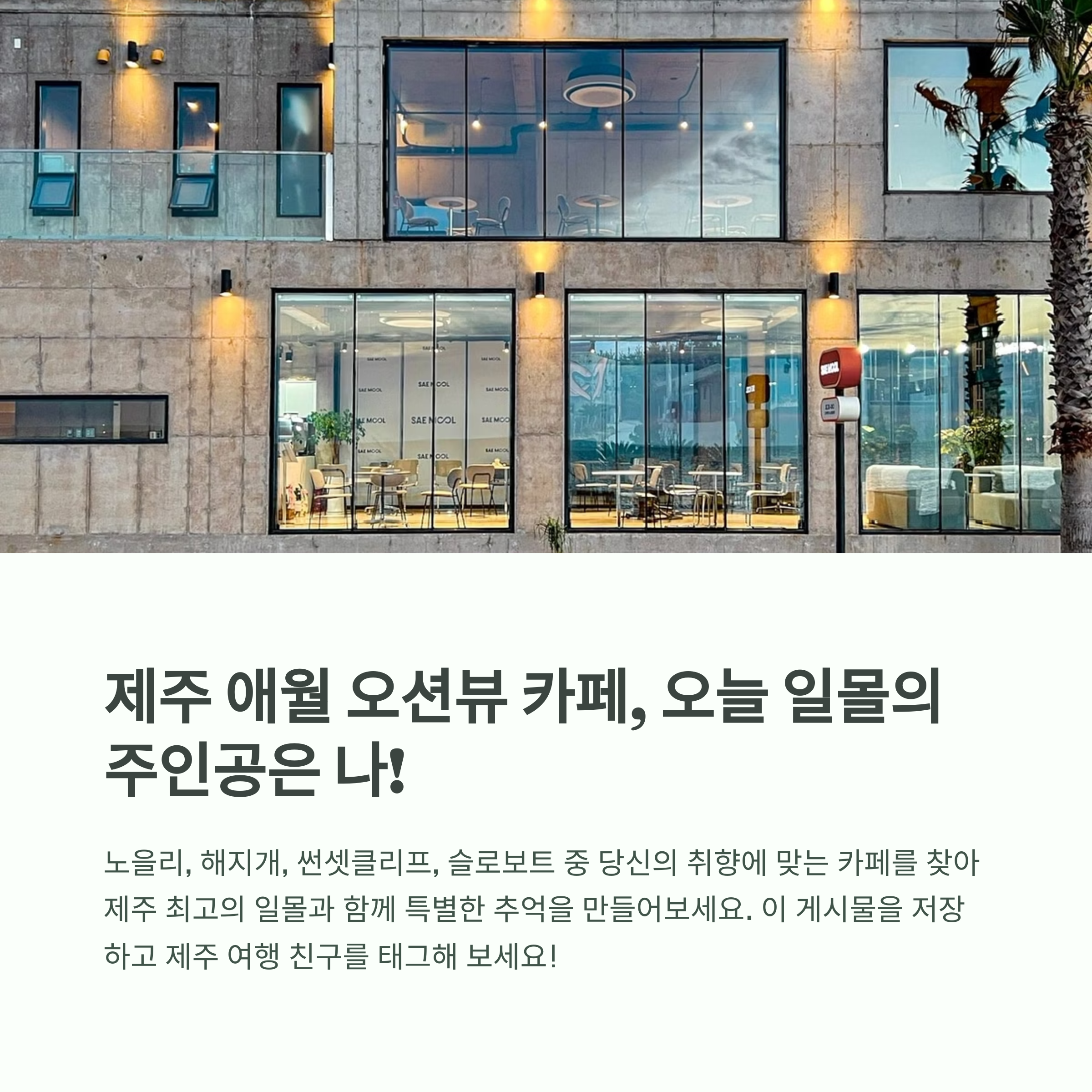 | 애월 해안도로를 따라 즐기는 감성 카페 | 하루의 끝을 장식하는 황홀한 제주 노을 명소 | 루프탑과 테라스에서 바라보는 탁 트인 바다 |